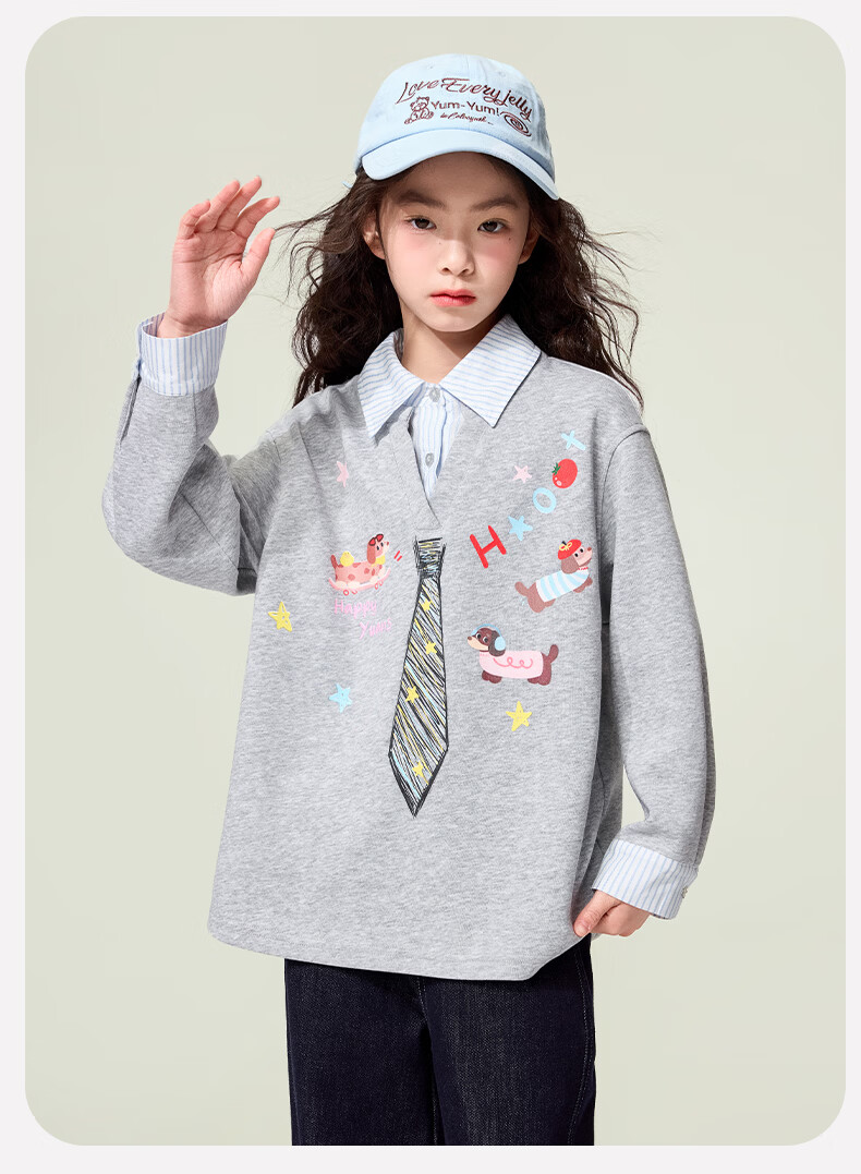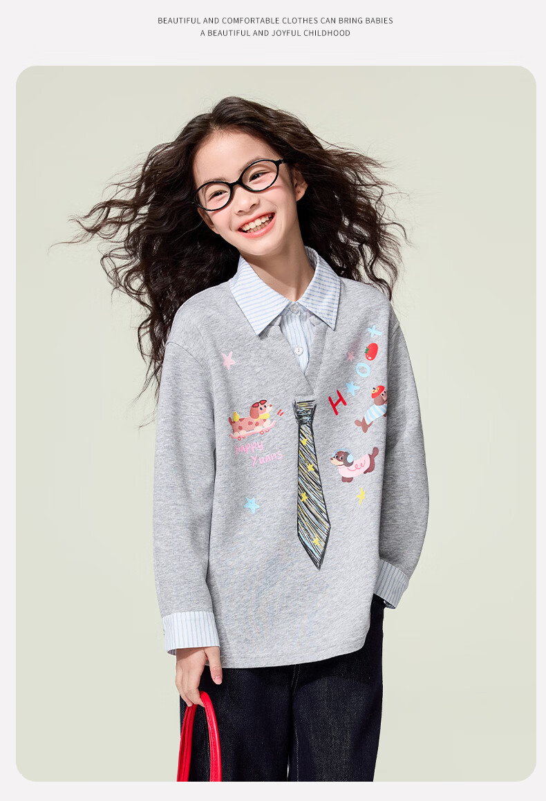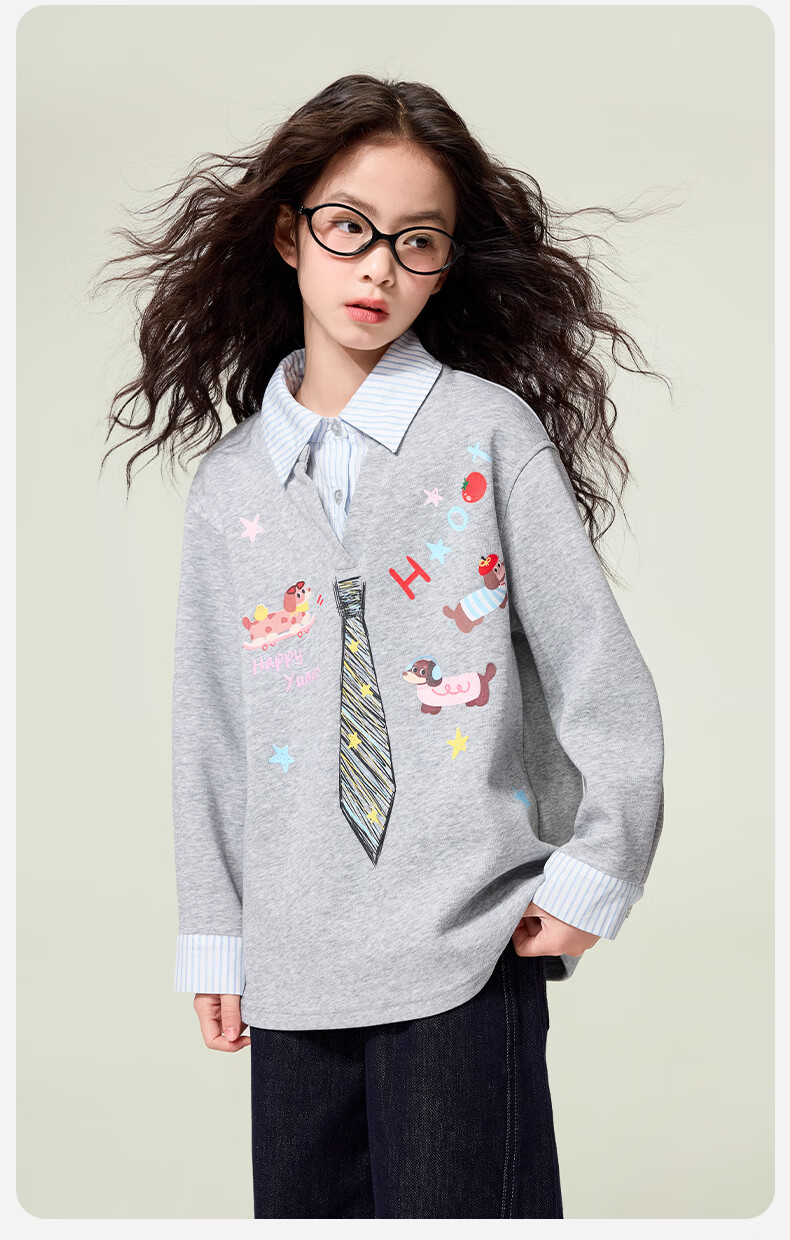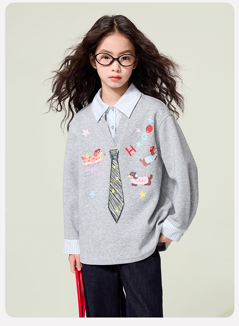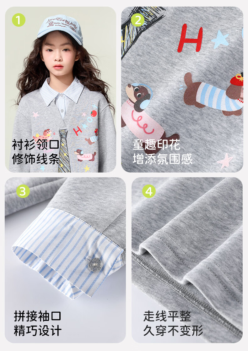 媛媛公主儿童假两件卫衣26春秋新款女童学院风卡通印花针织上衣中大童装 花灰色 110