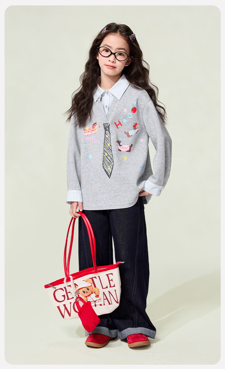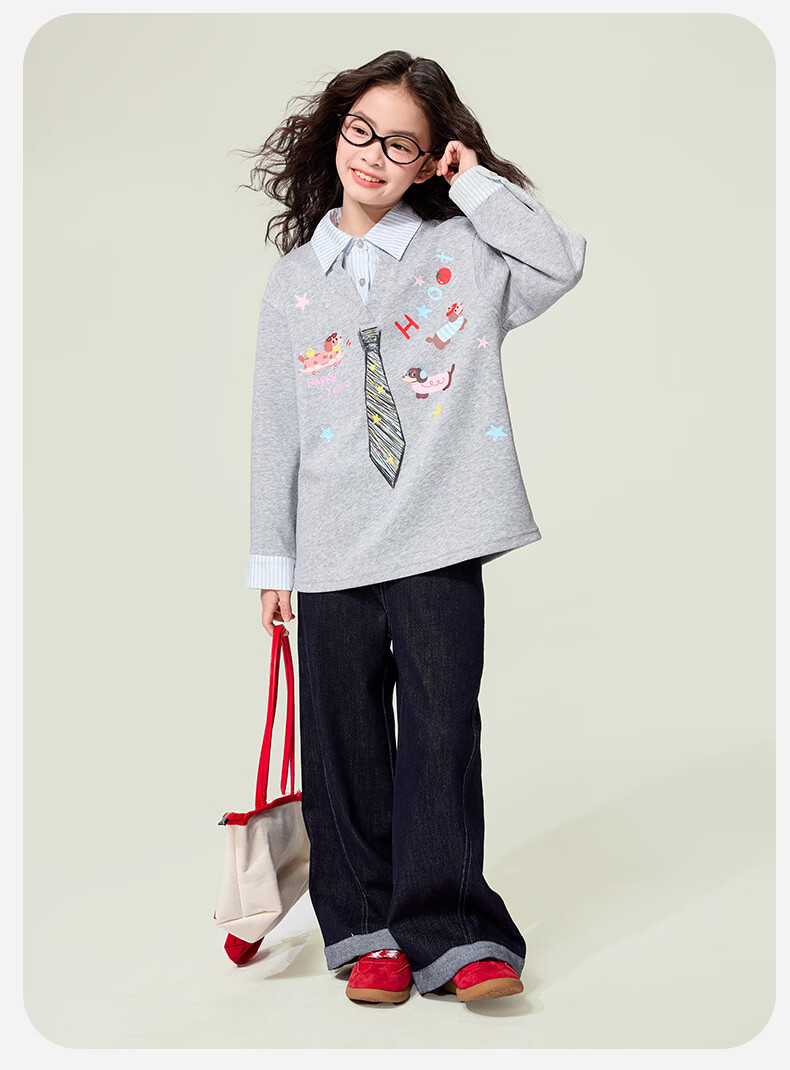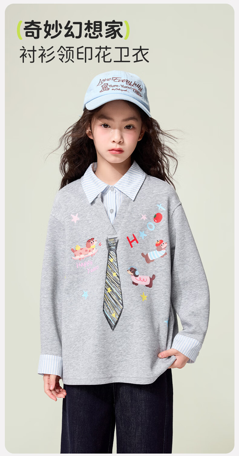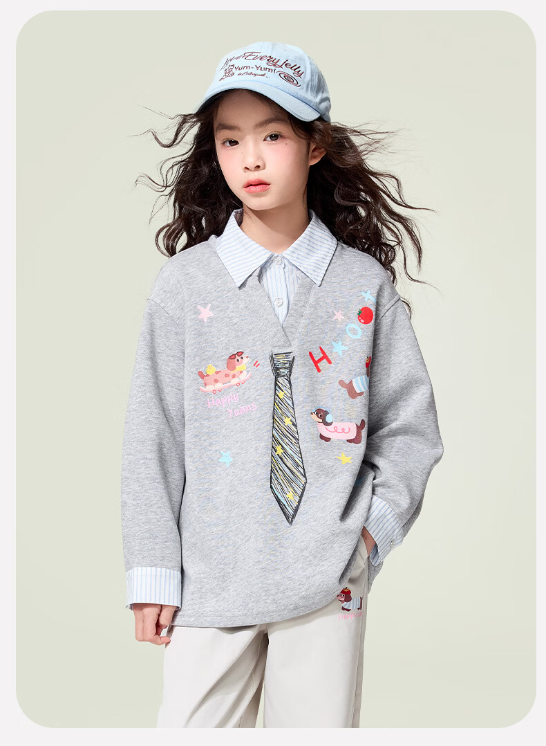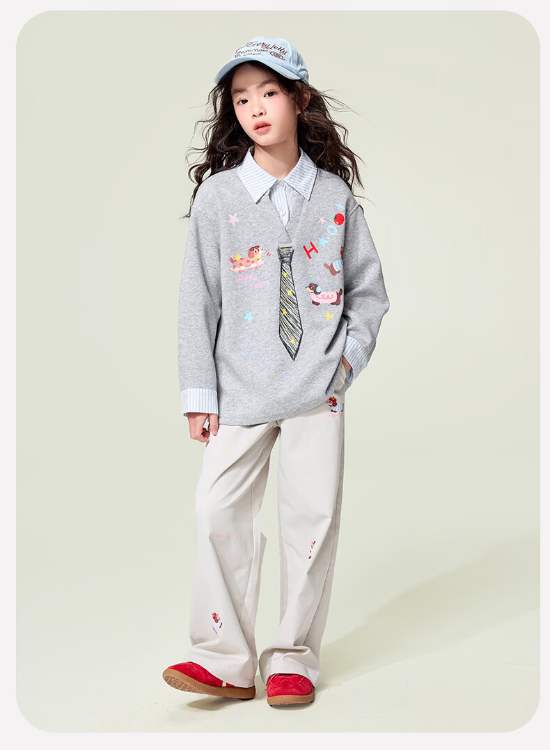 媛媛公主儿童假两件卫衣26春秋新款女童学院风卡通印花针织上衣中大童装 花灰色 110