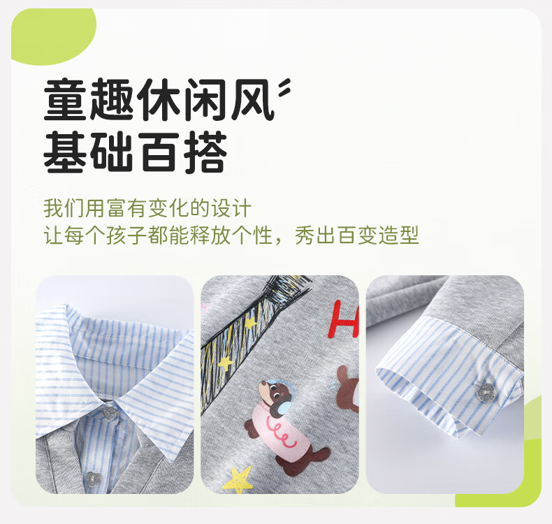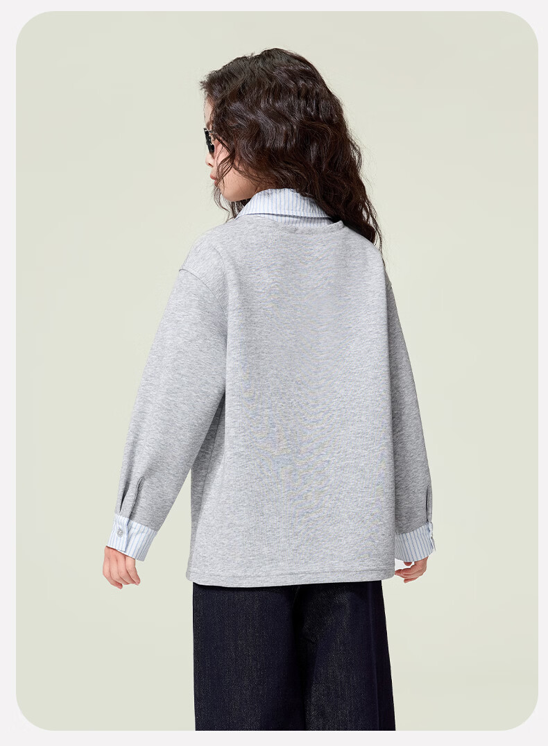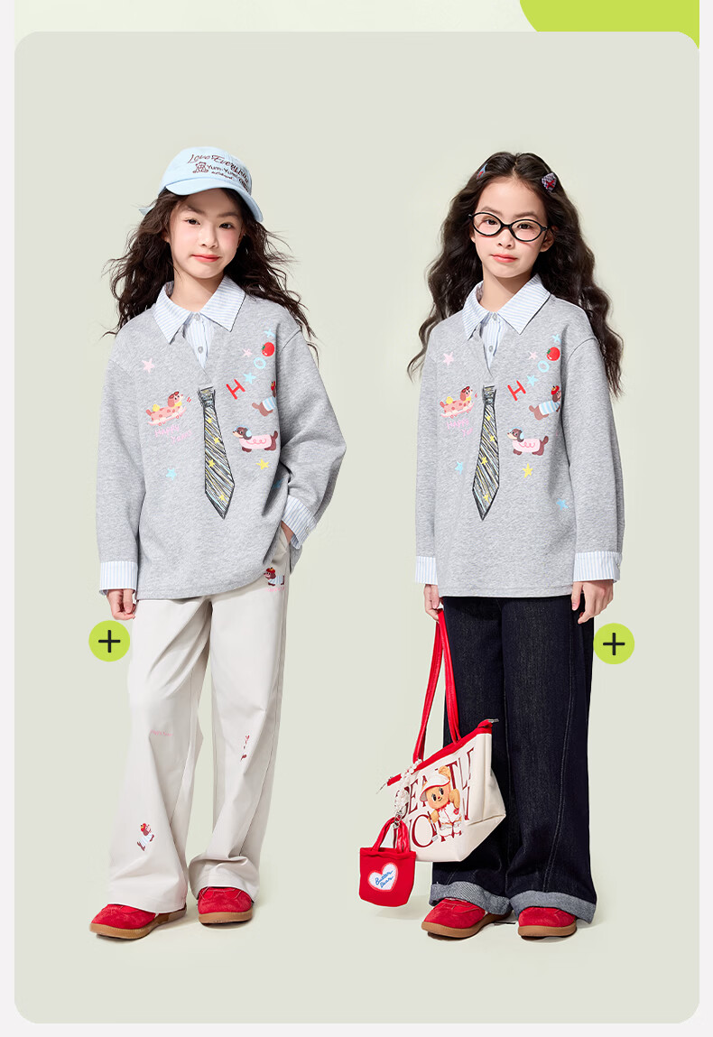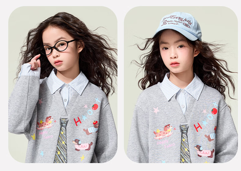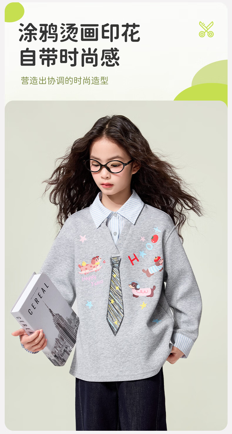 媛媛公主儿童假两件卫衣26春秋新款女童学院风卡通印花针织上衣中大童装 花灰色 110