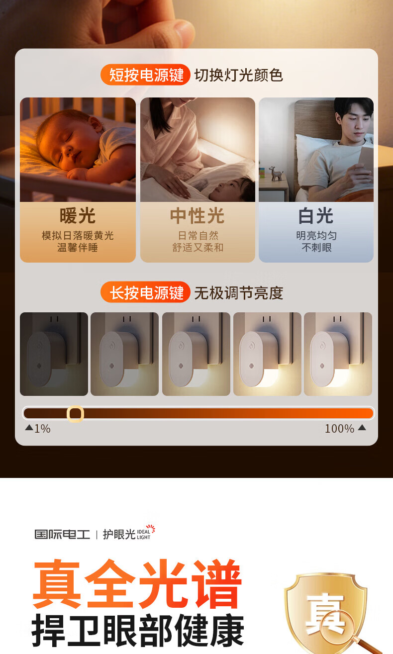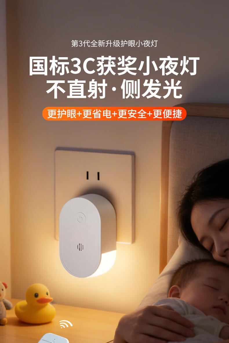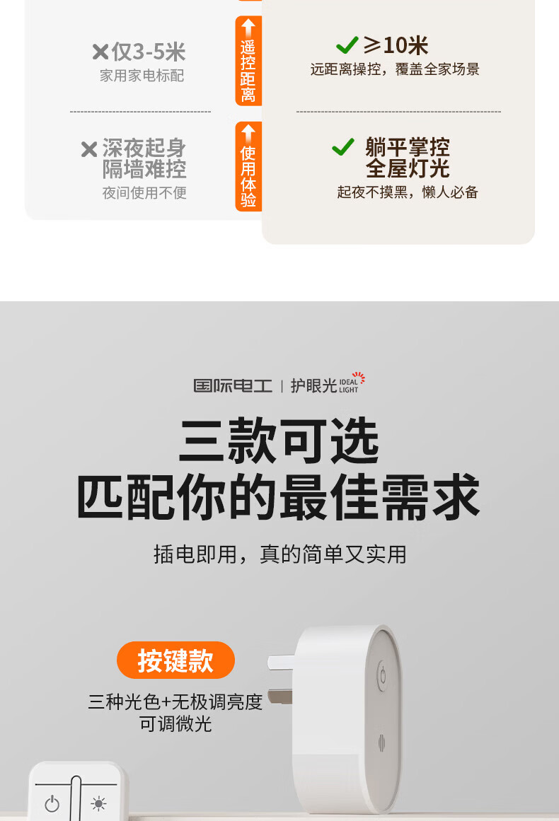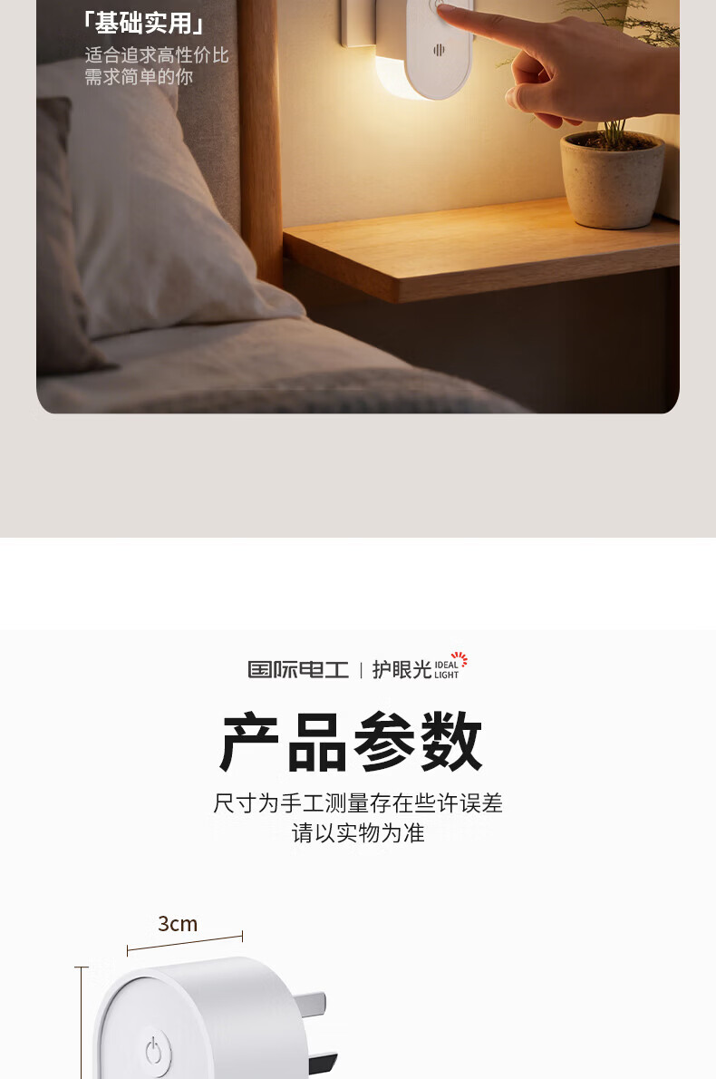 国际电工LED侧发光小夜灯卧室床头宿舍全光谱护眼遥控语音控制起夜睡眠灯 侧发光小夜灯【按键款 1W】