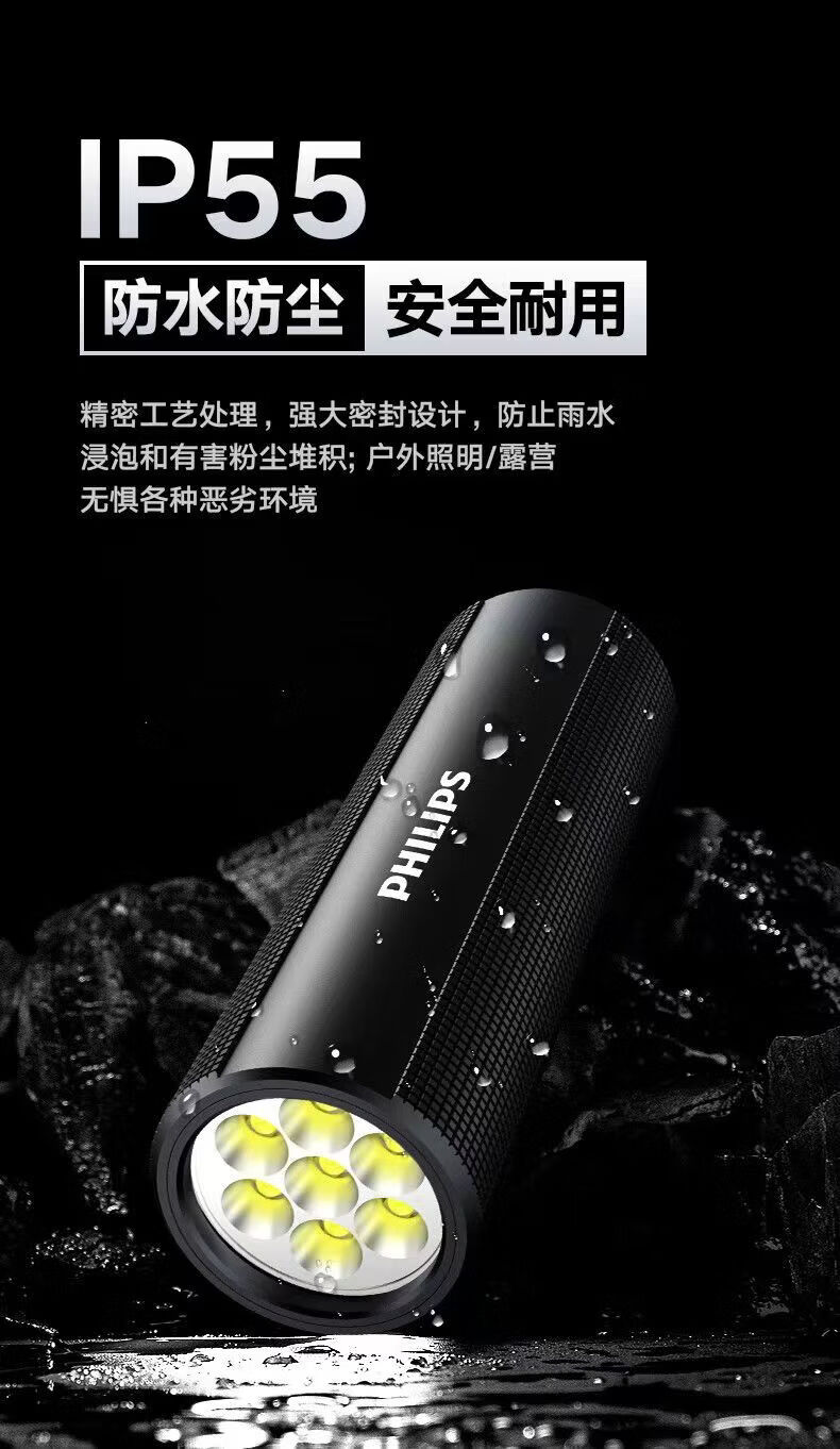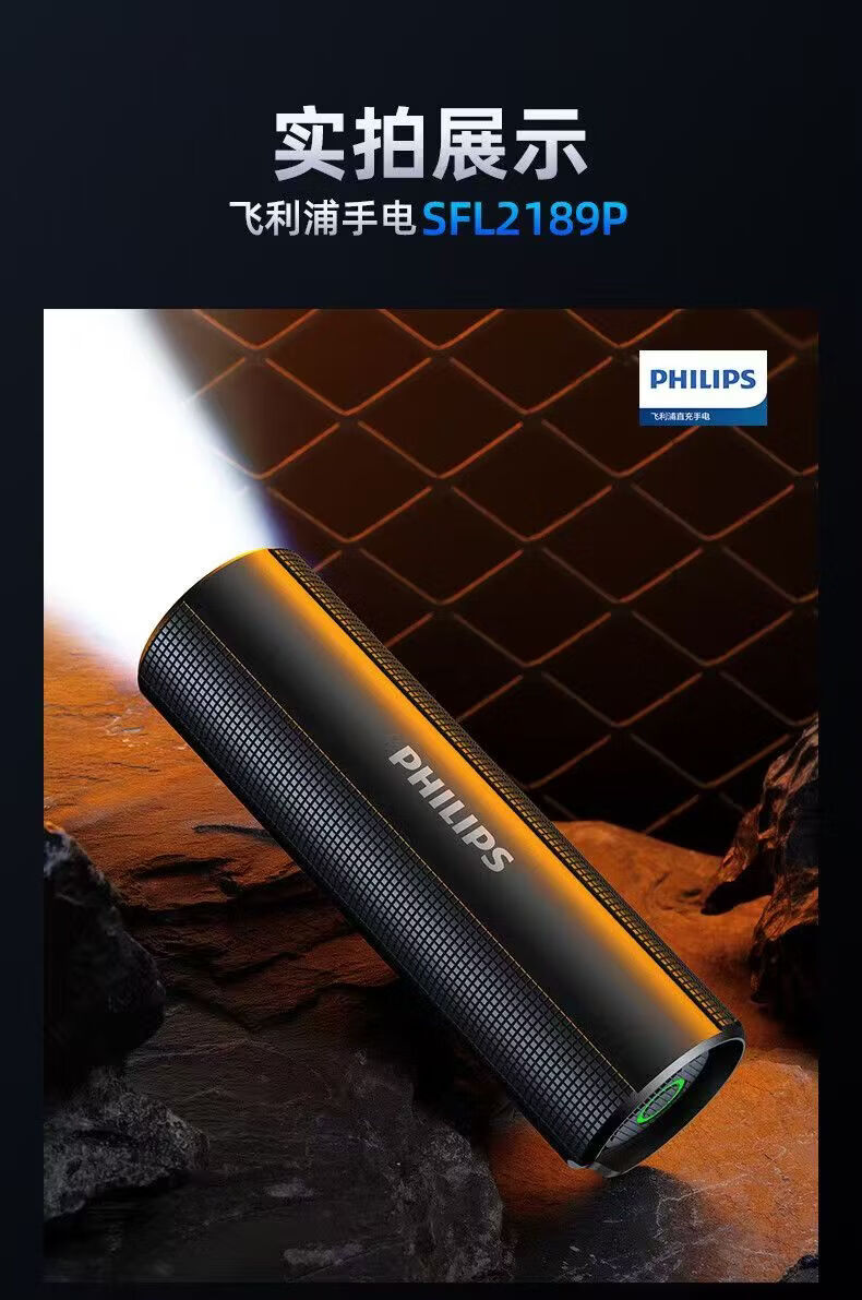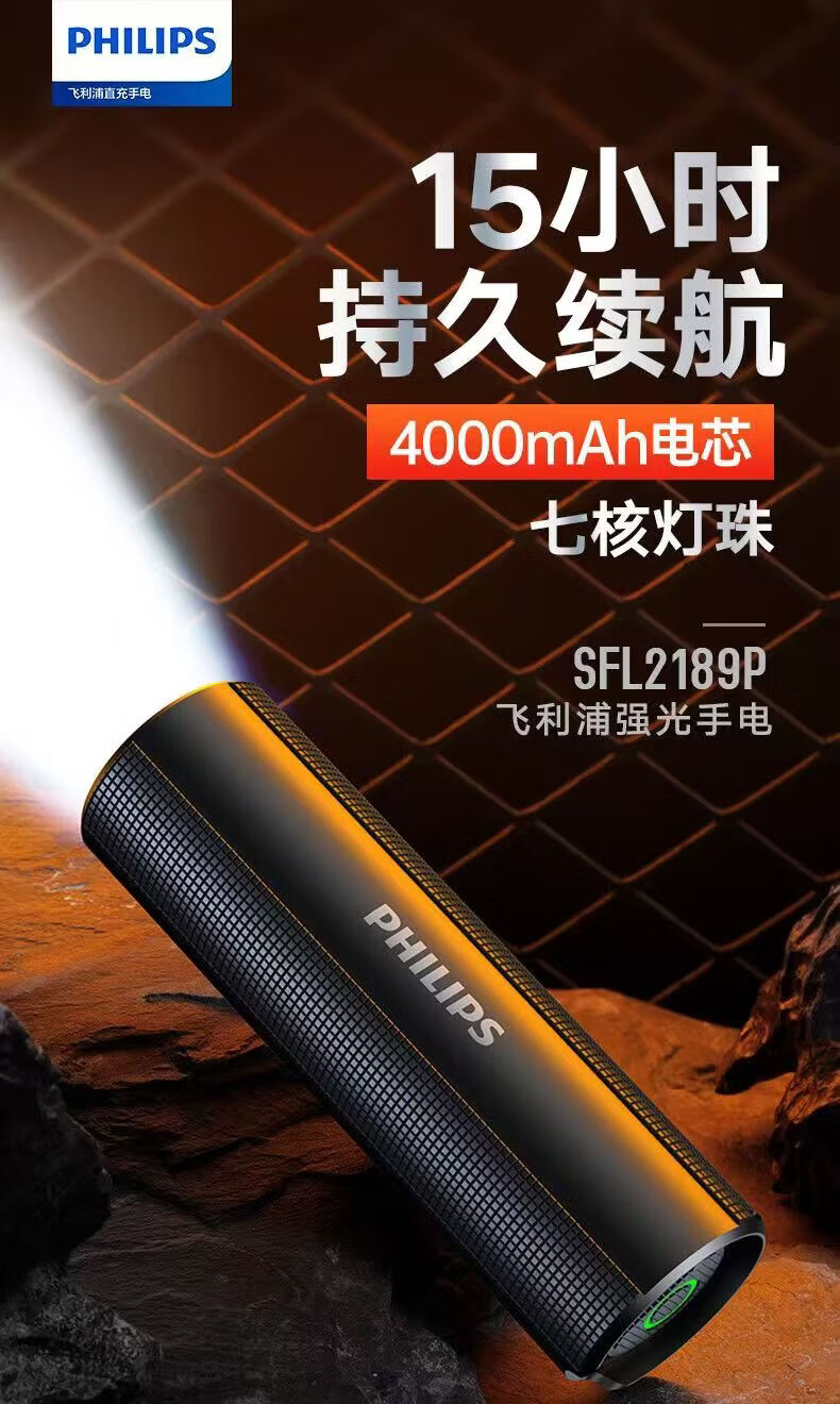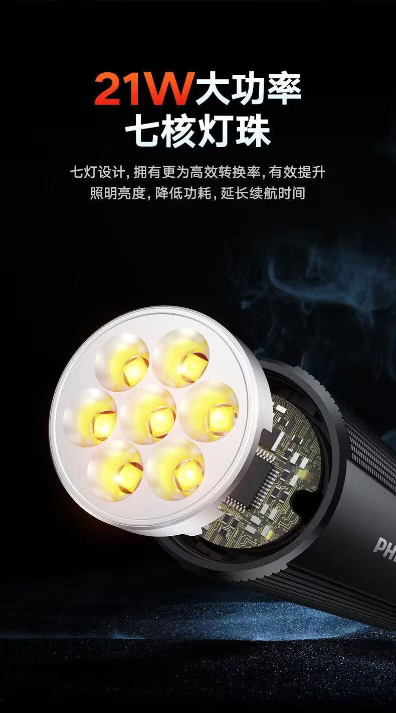 飞利浦(PHILIPS)强光手电筒高亮泛光7核灯珠便携户外应急照明灯低光15H长续航SFL2189P 21W/4000毫安/定焦泛光/SFL2189P