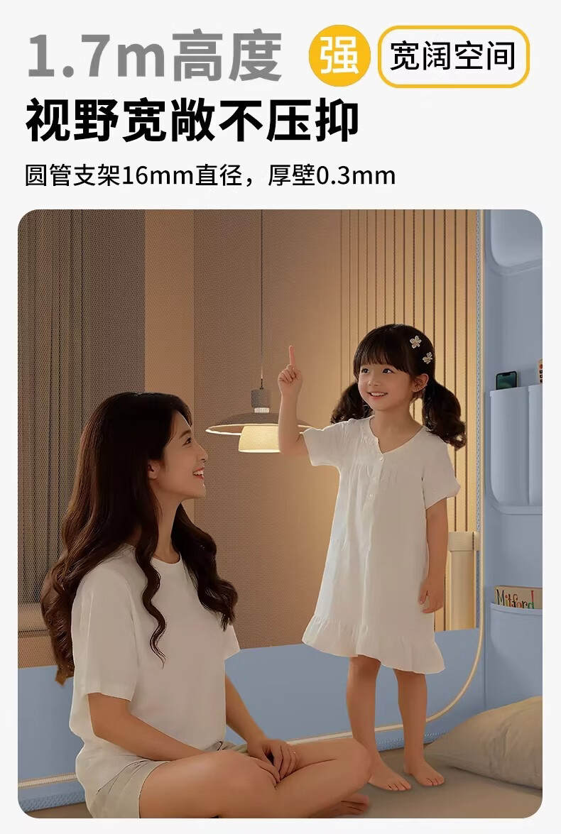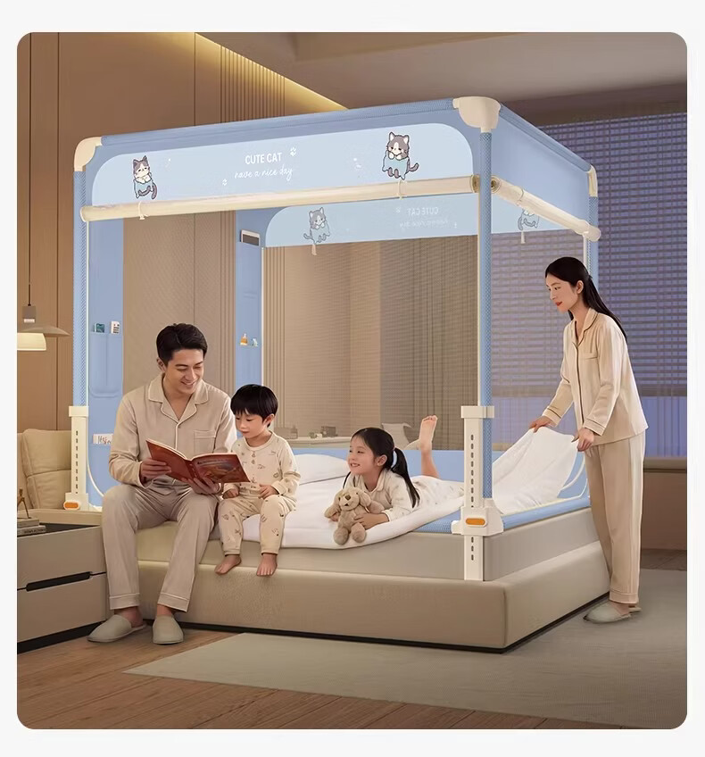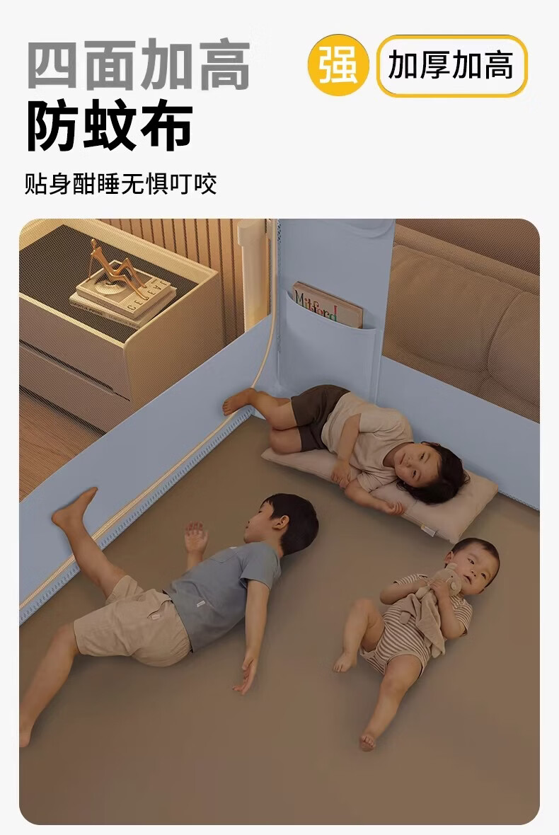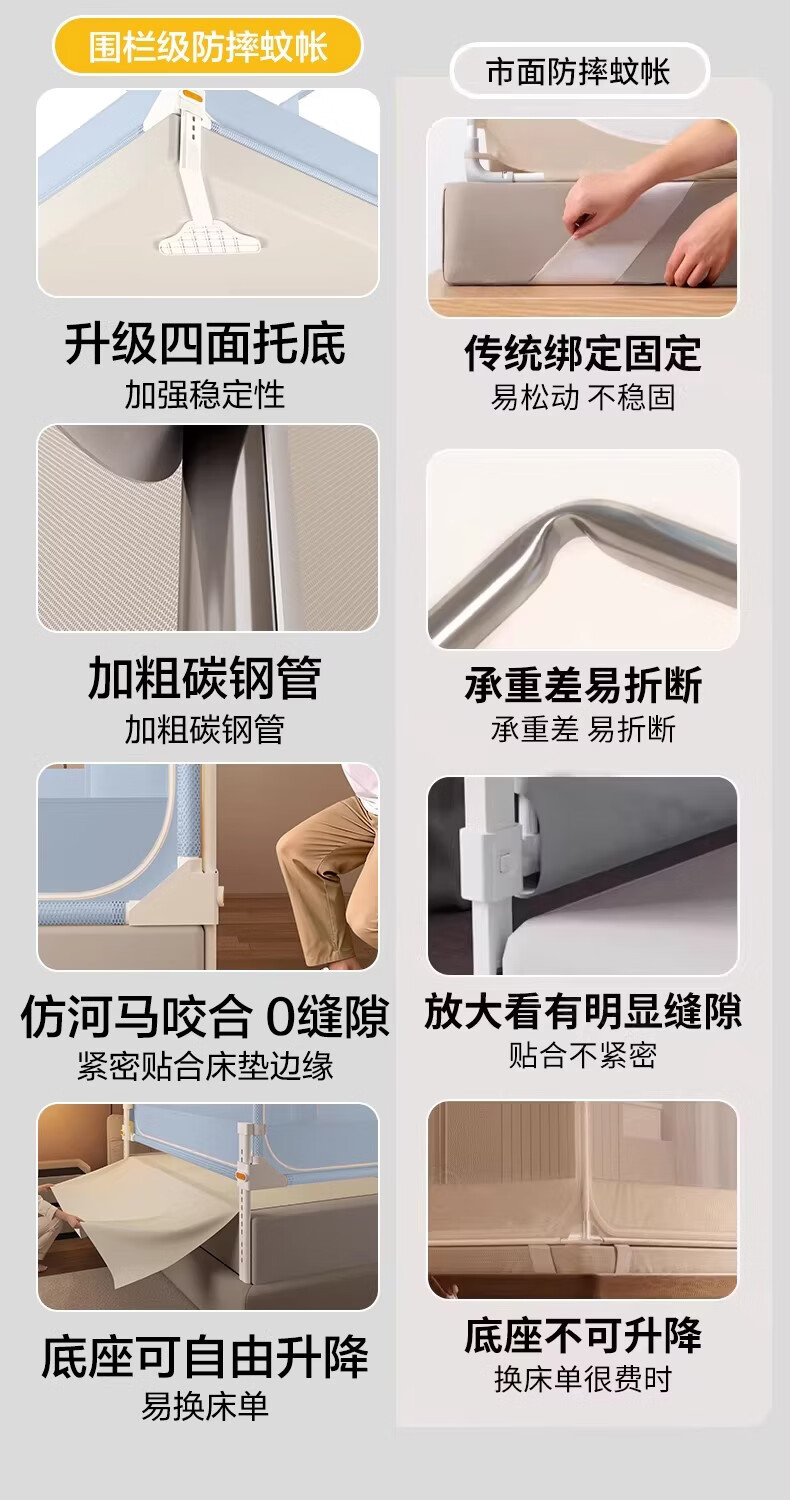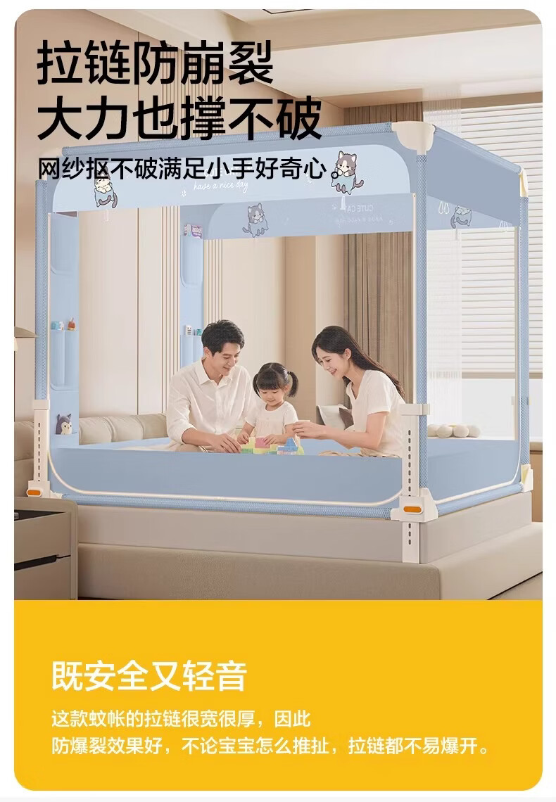 无印良品A类围栏防摔蚊帐1.5米x2米婴儿童家用卧室1.8m大床可升降蚊帐支架 腊肠狗之家【单帐纱】 1.5m床-宽150x长200x高170cm【围栏支架】
