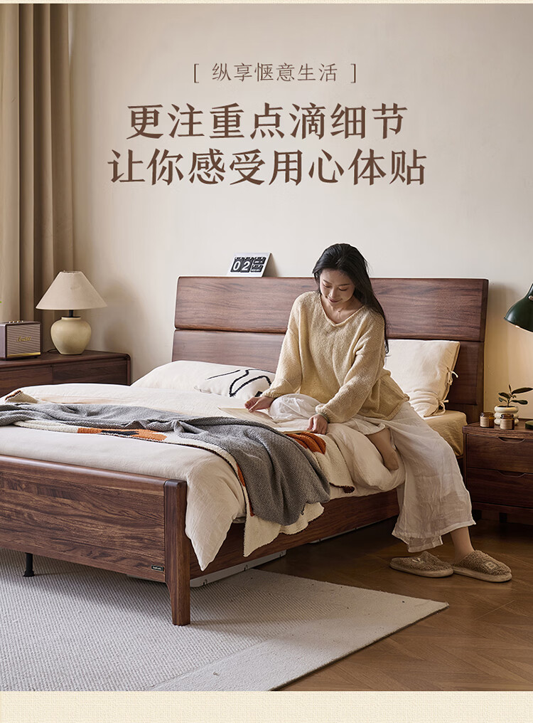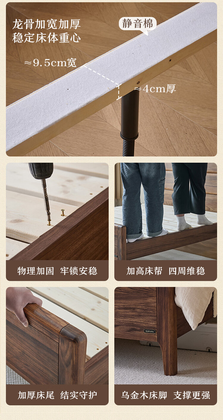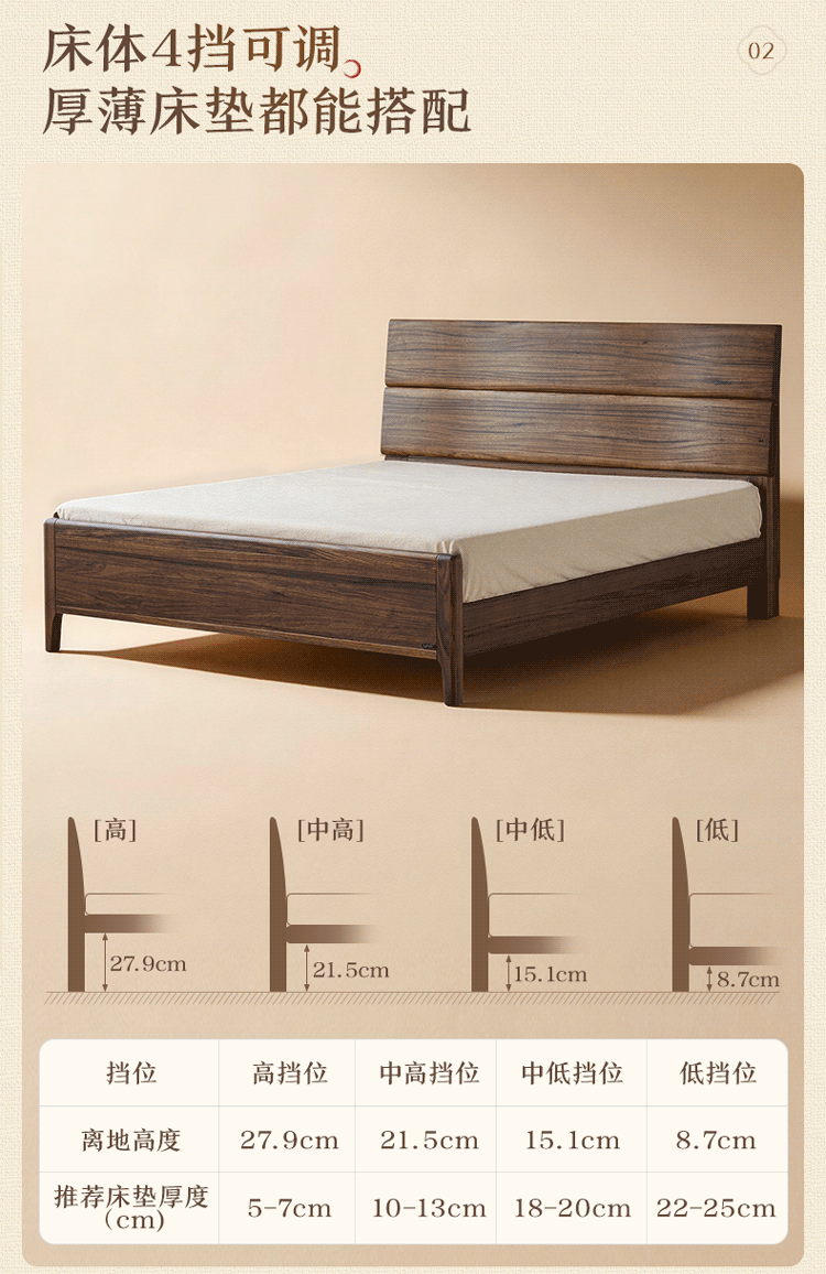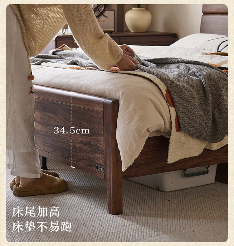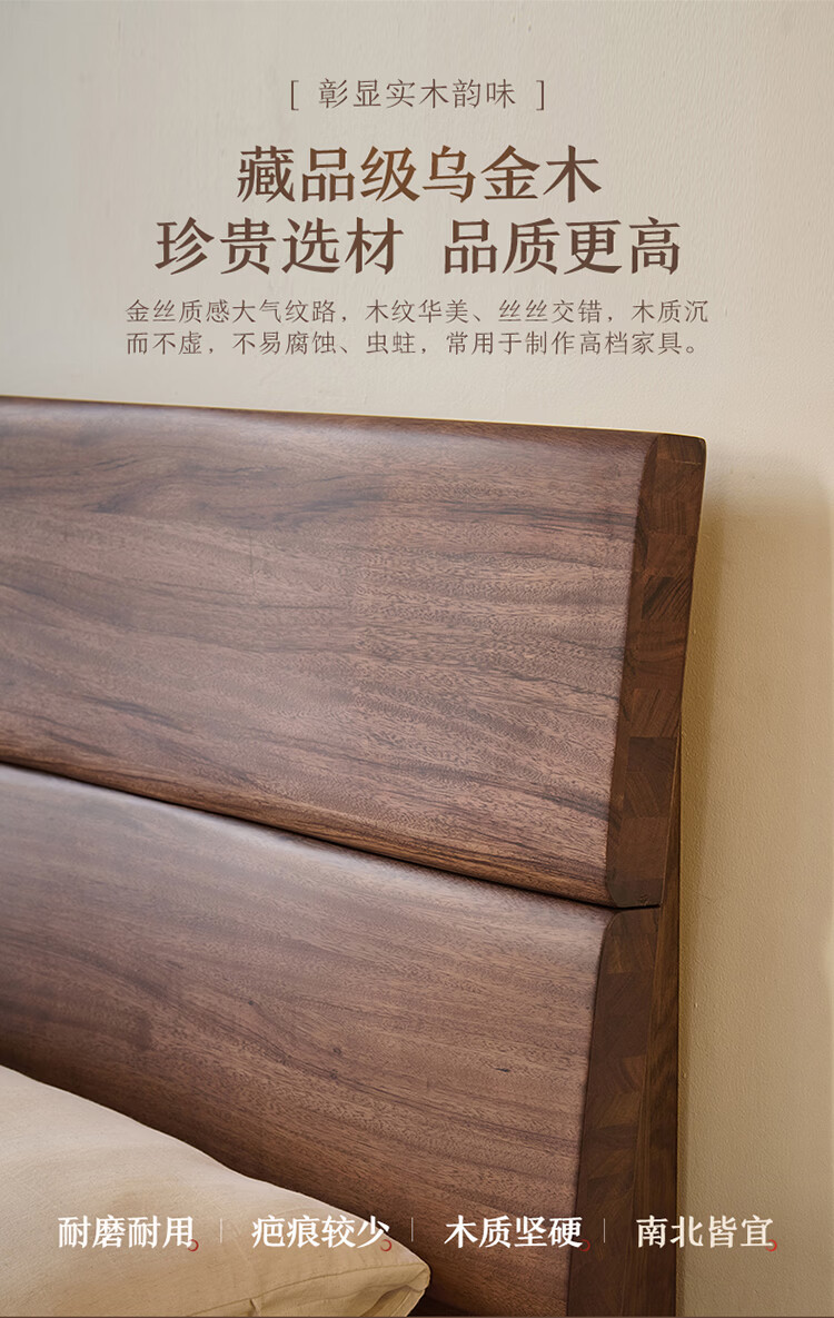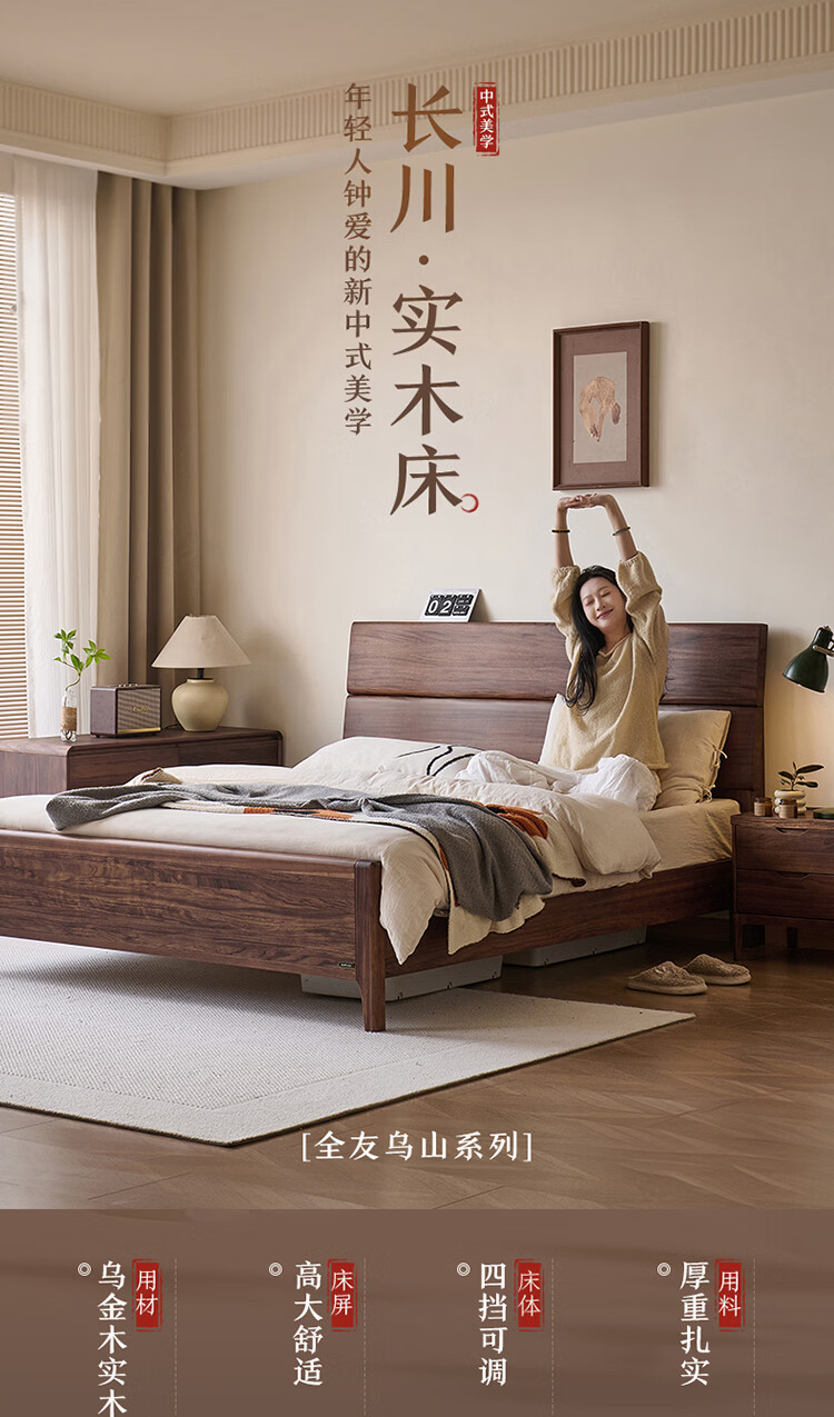 全友家居新中式乌金木实木床2026新款双人大床主卧高脚储物床带床垫子 【乌金木 | 床高可调】 1.5x2.0米 床+床垫