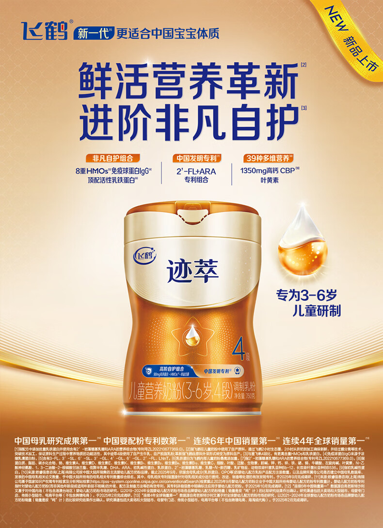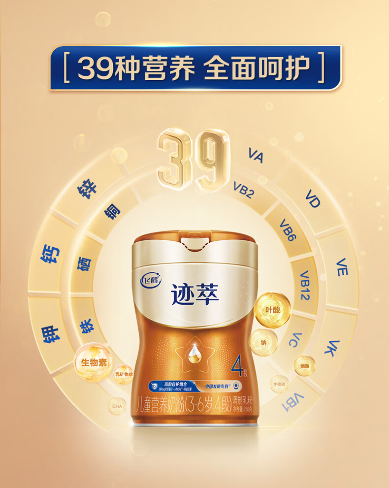 飞鹤迹萃乳铁蛋白8重HMOs免疫球蛋白儿童配方奶粉4段(3-6岁)750g*6罐