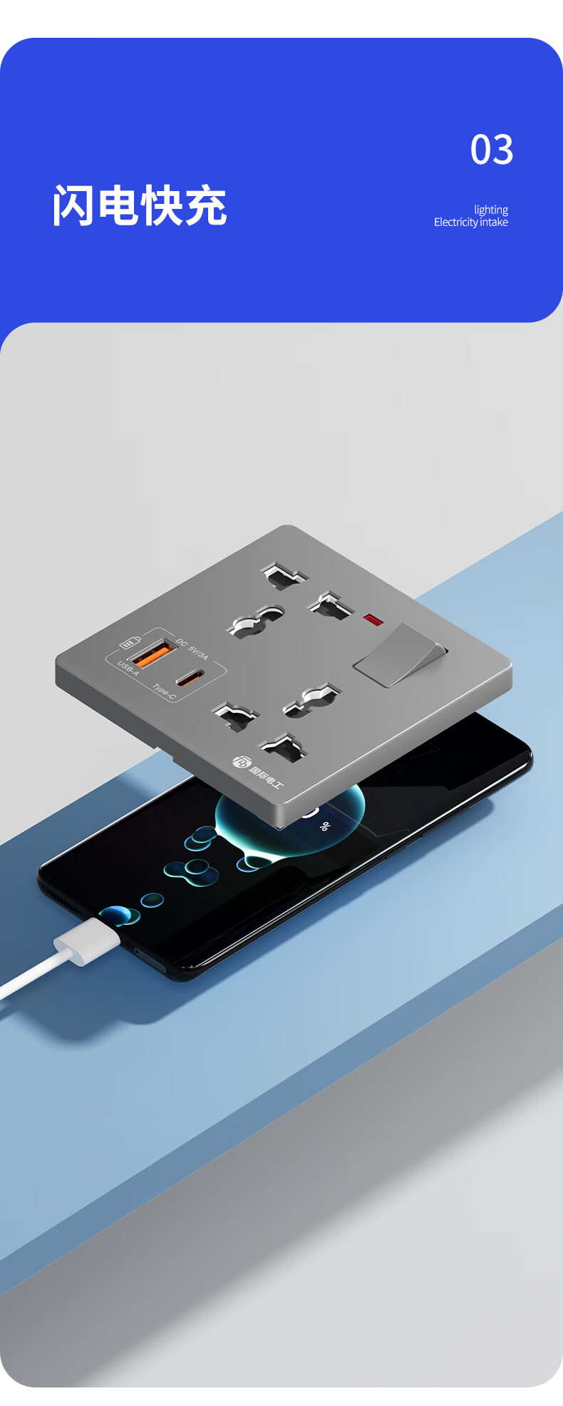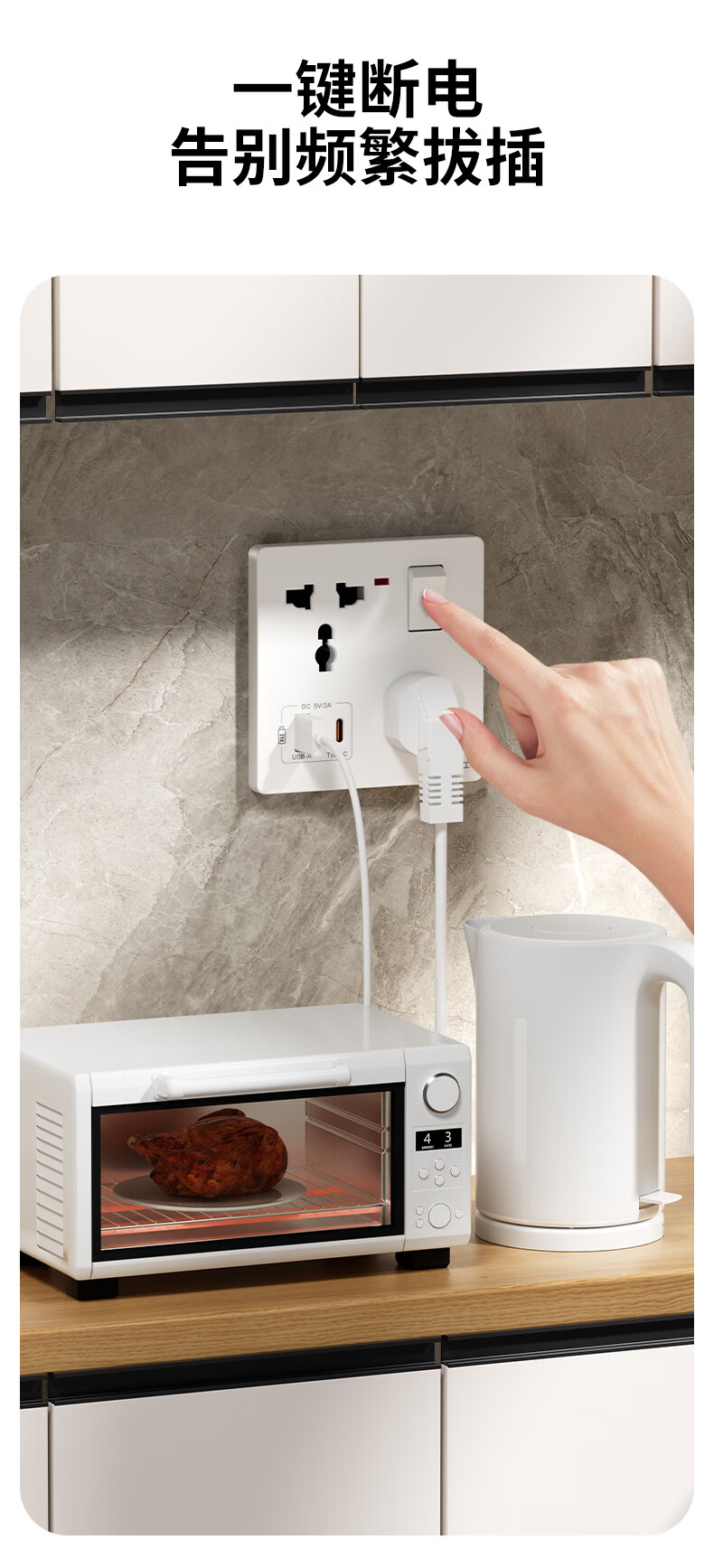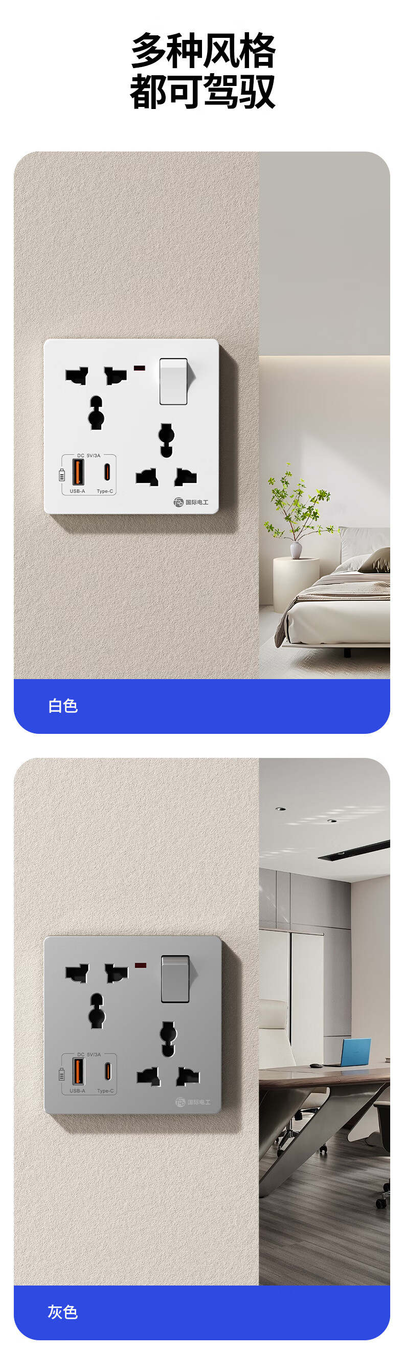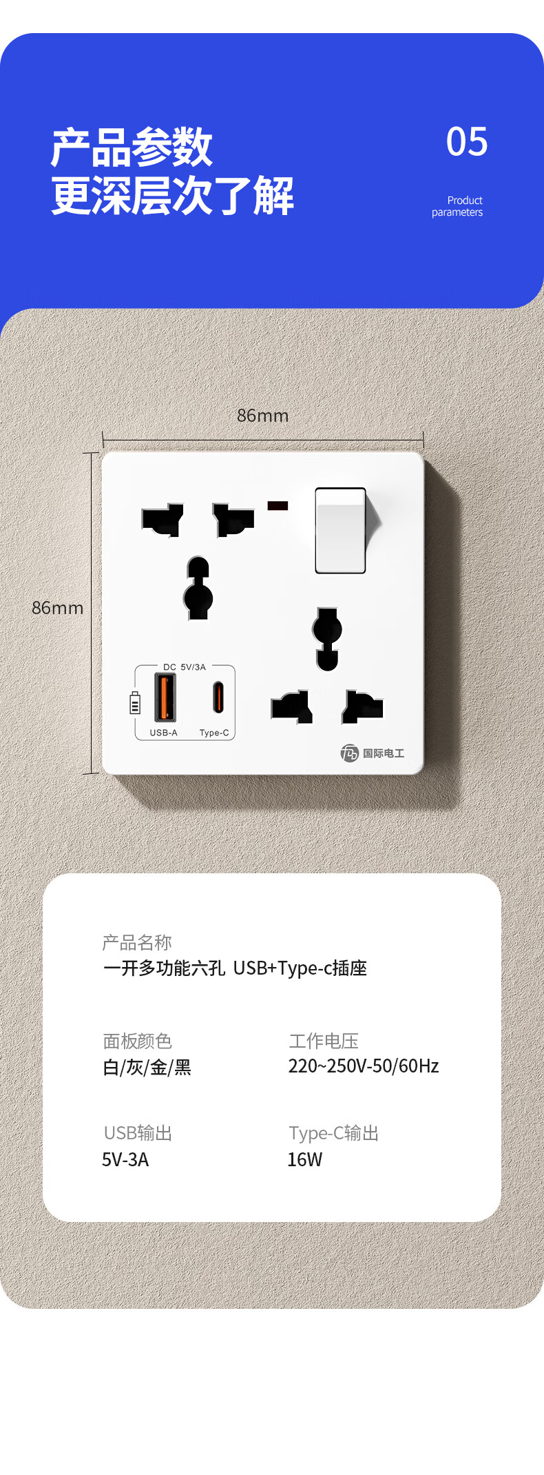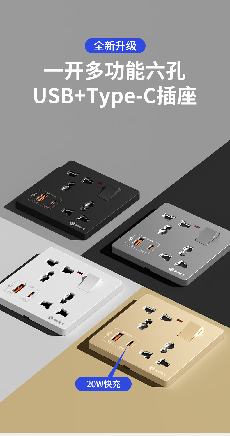 国际电工(FDD)86型多功能一开六孔USB快充插座面板家用墙壁Type-c一键总控开关 多功能一开六孔插座【白色】