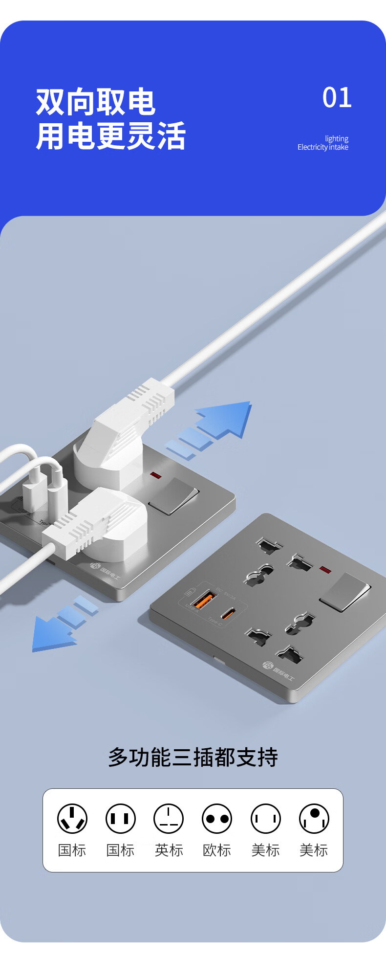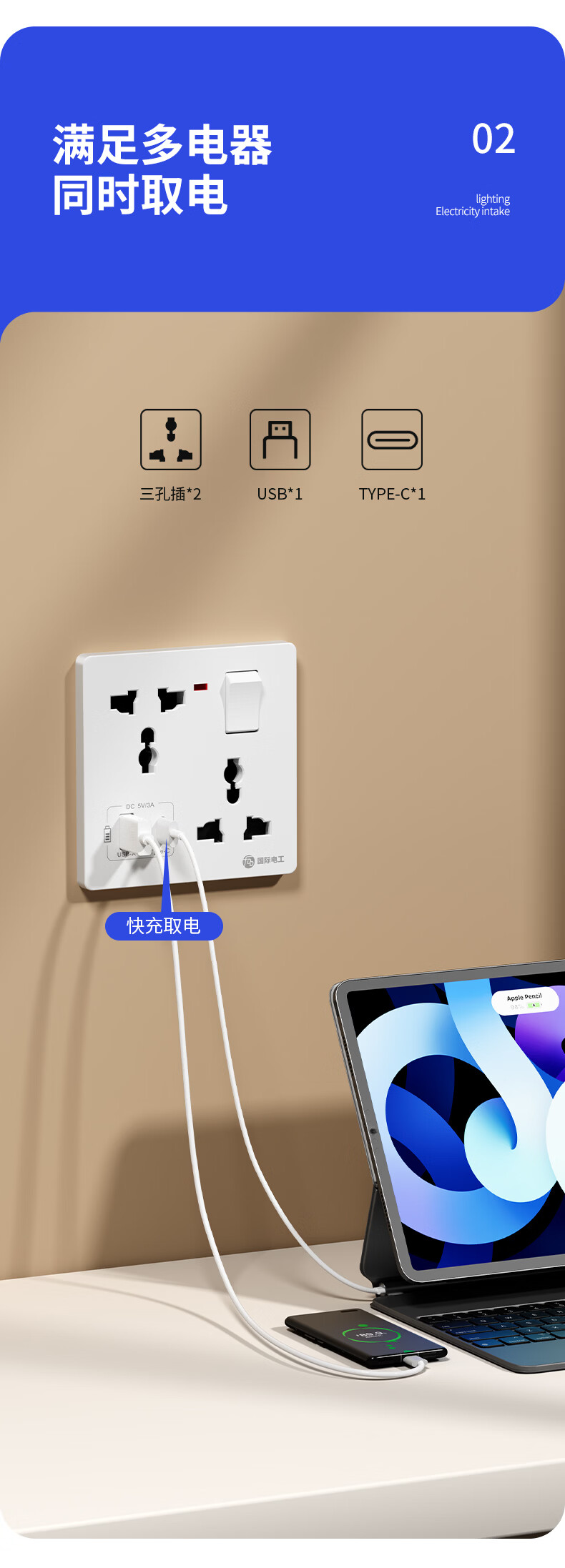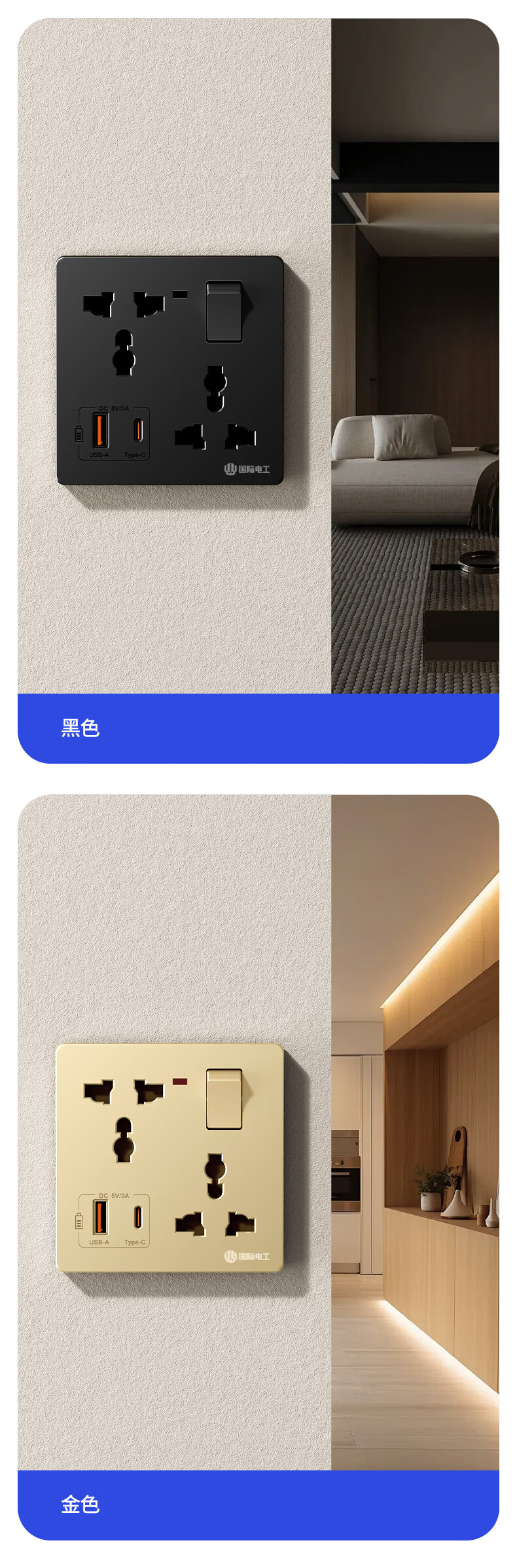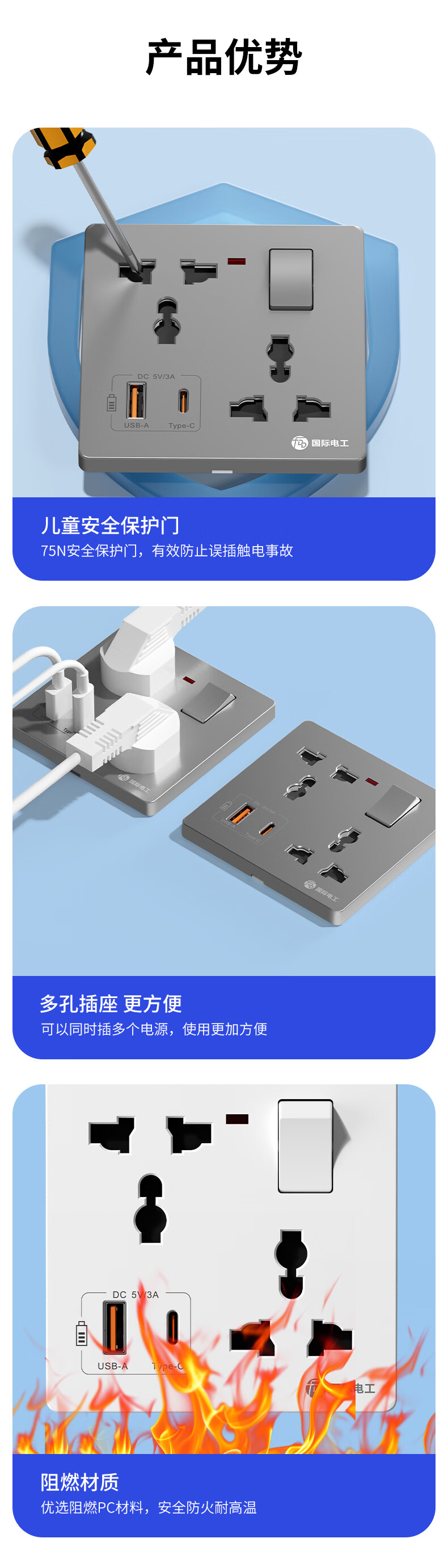 国际电工(FDD)86型多功能一开六孔USB快充插座面板家用墙壁Type-c一键总控开关 多功能一开六孔插座【白色】