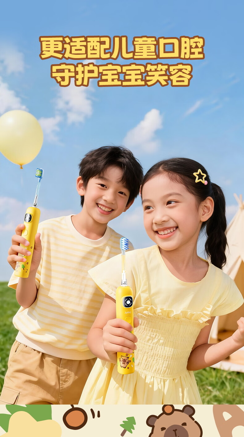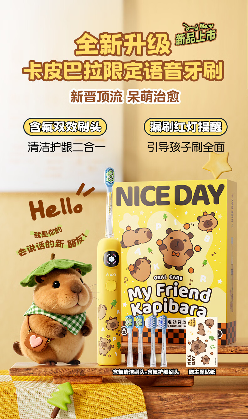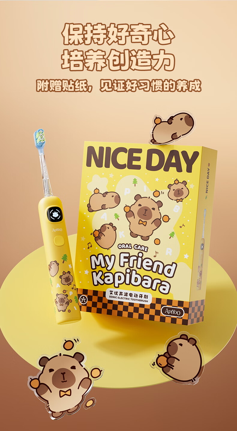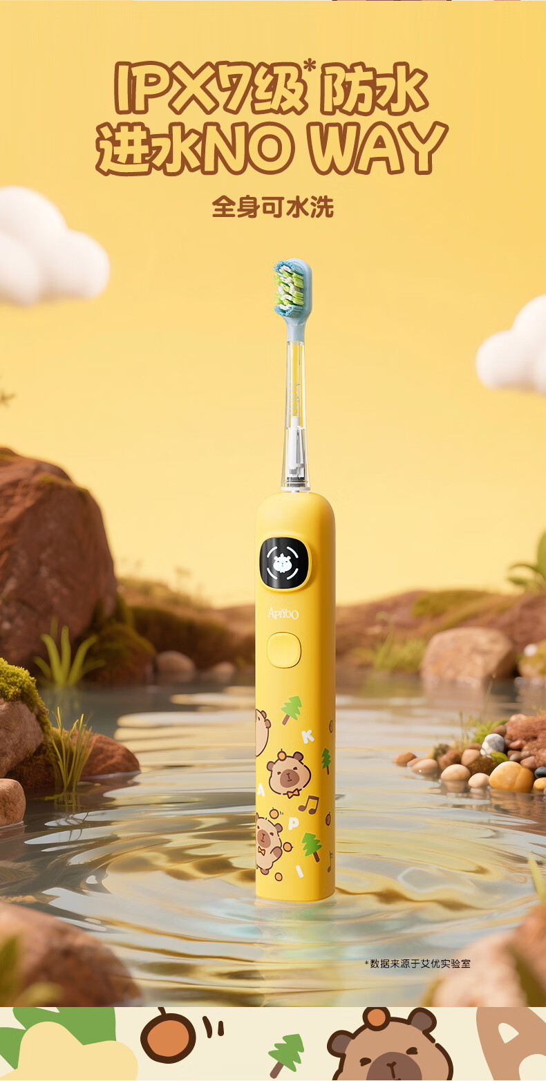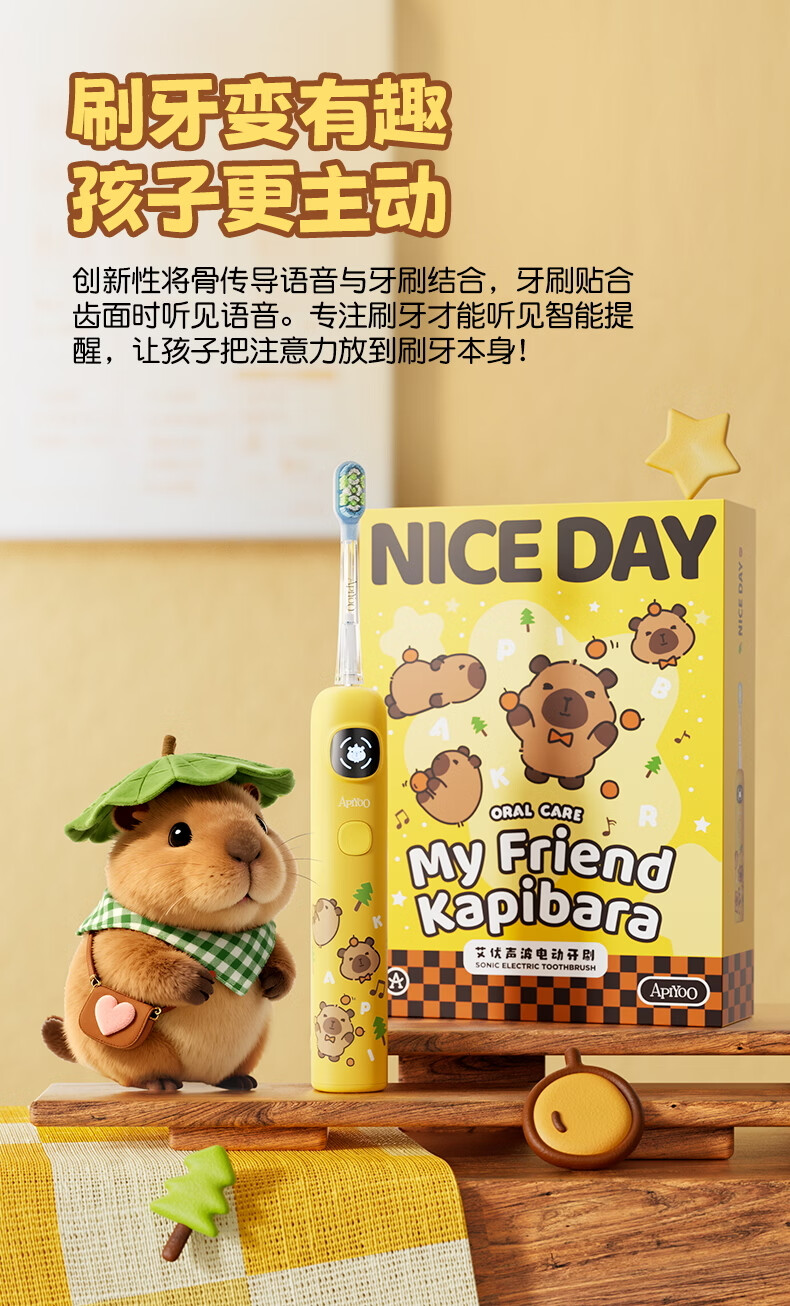 ApiYoo艾优A9pro-F卡皮巴拉儿童电动牙刷 语音漏刷提醒含氟软毛护龈3-15岁男女孩学生 儿童节日生日礼物