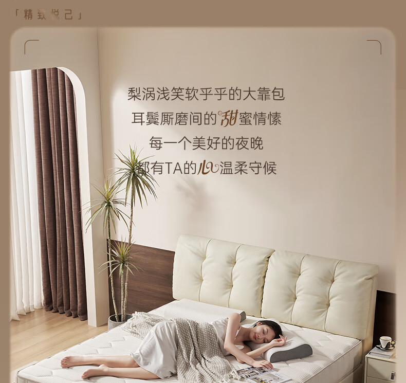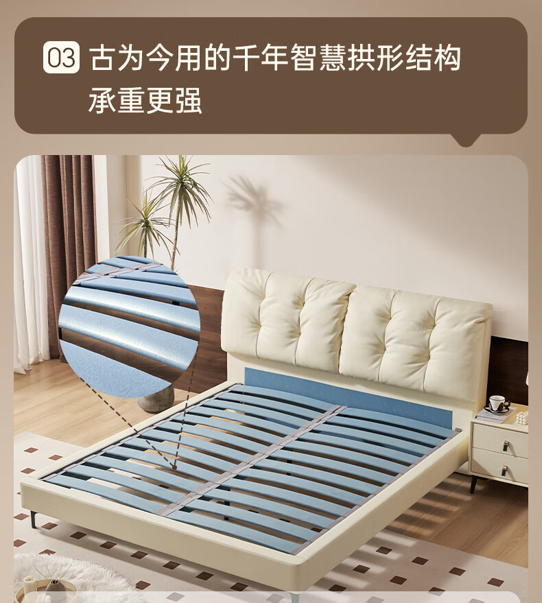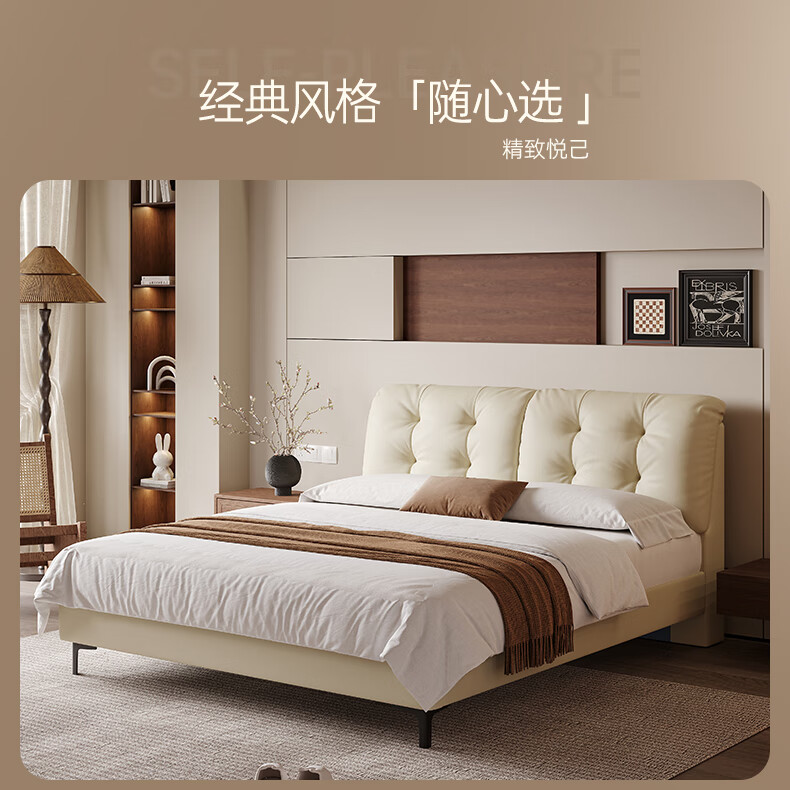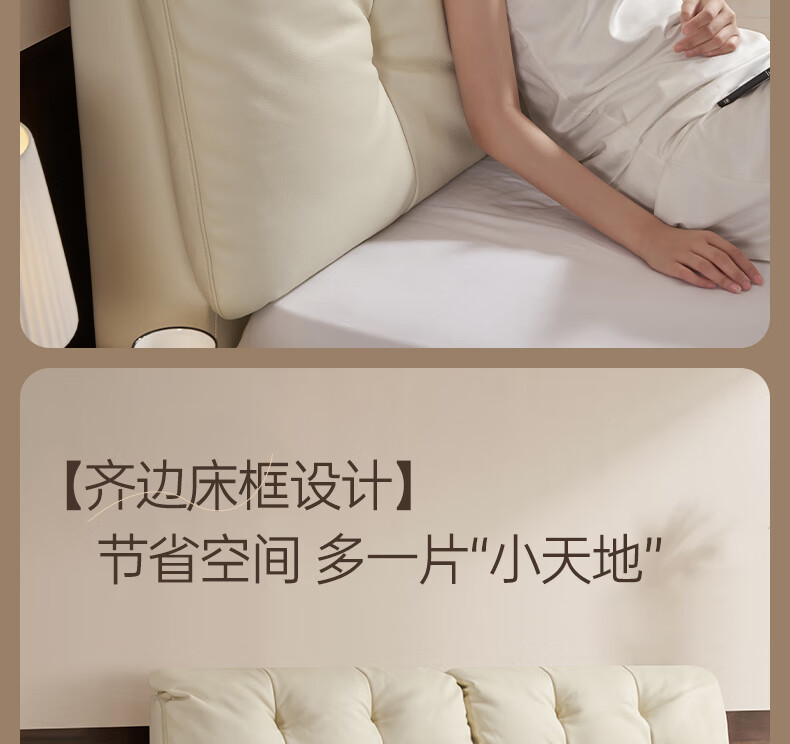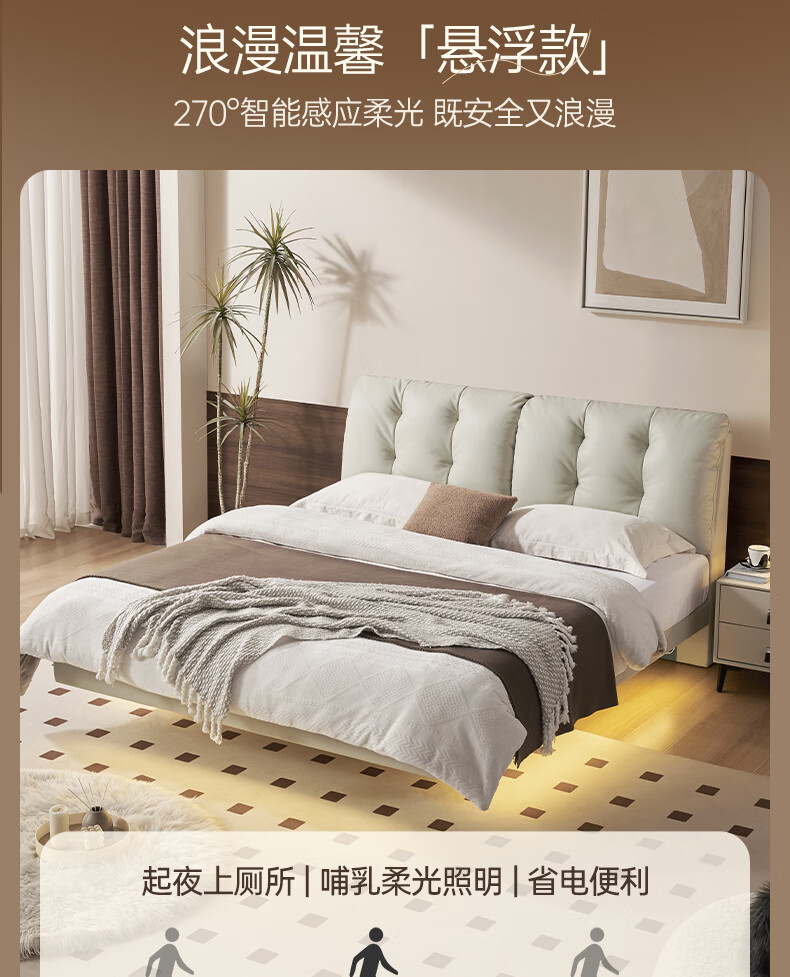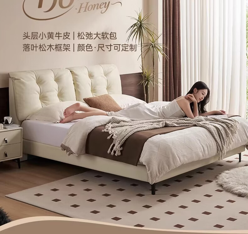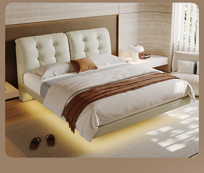 CBD家居现代简约真皮软包床双人主卧大床奶油风婚床头层牛皮甜心悬浮 甜心悬浮-奶油白单床 卷帘排骨架 1500*2000
