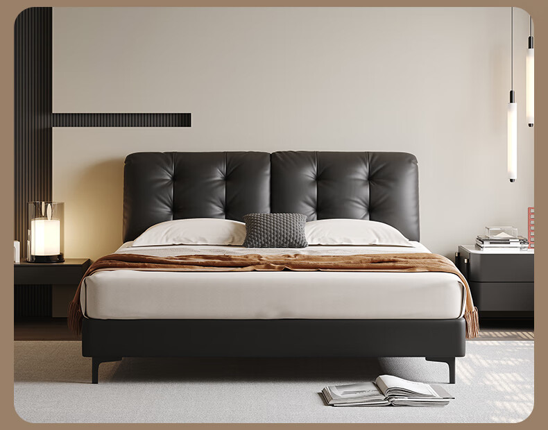 CBD家居现代简约真皮软包床双人主卧大床奶油风婚床头层牛皮甜心悬浮 甜心悬浮-水墨黑单床 卷帘排骨架 1800*2000