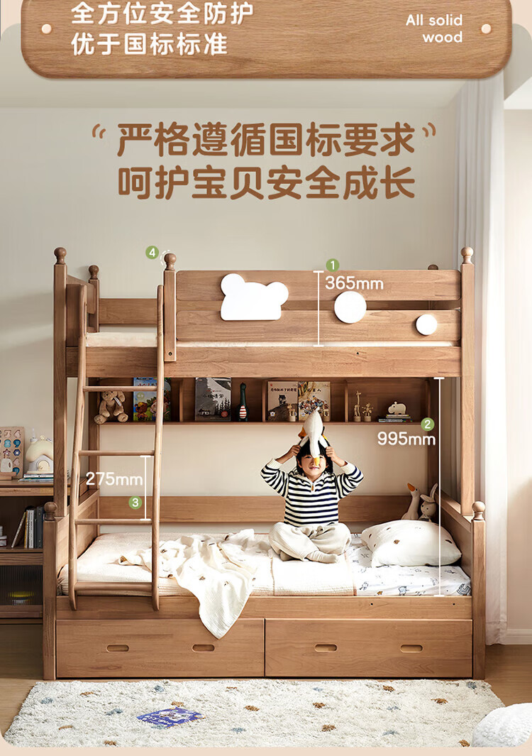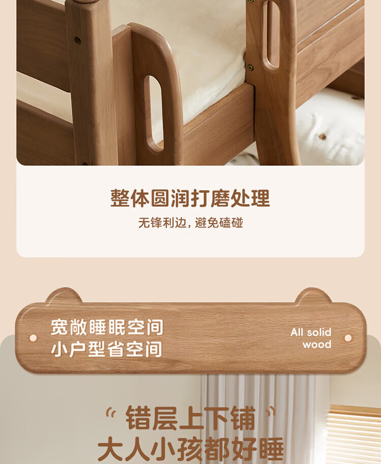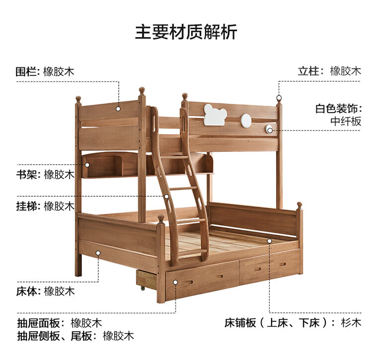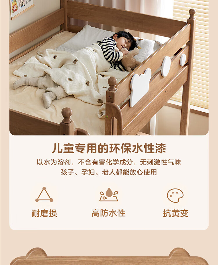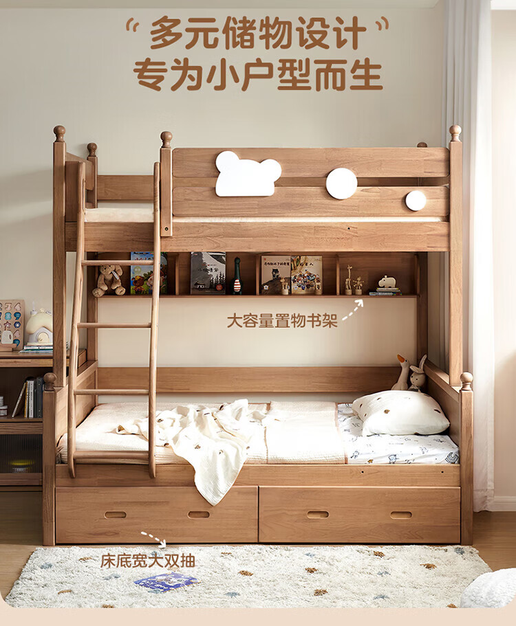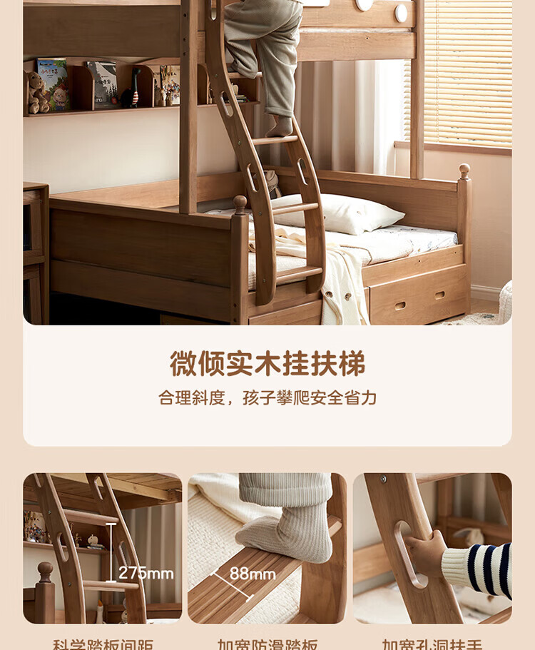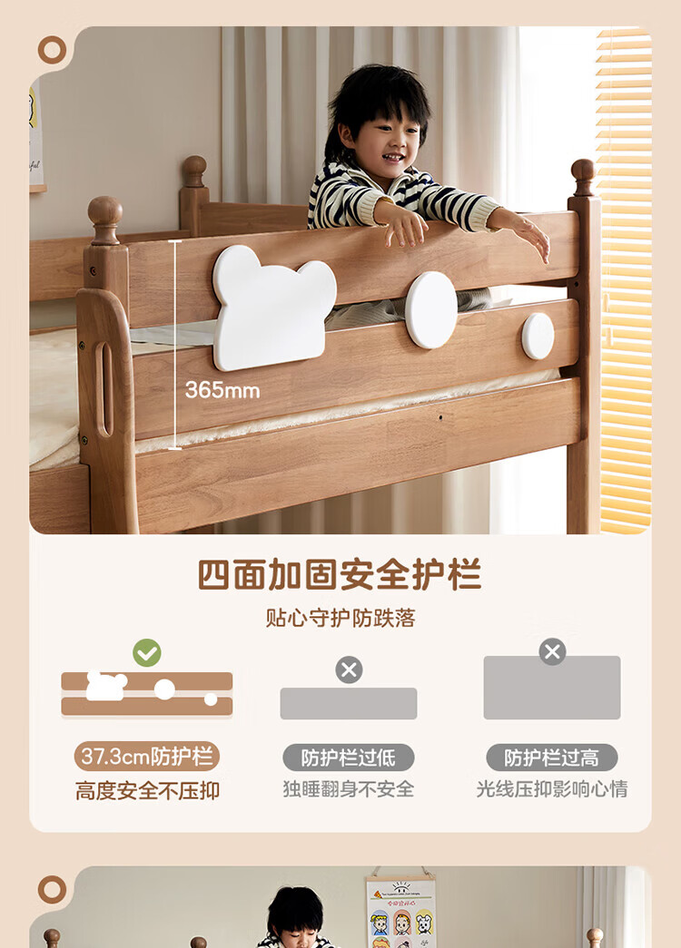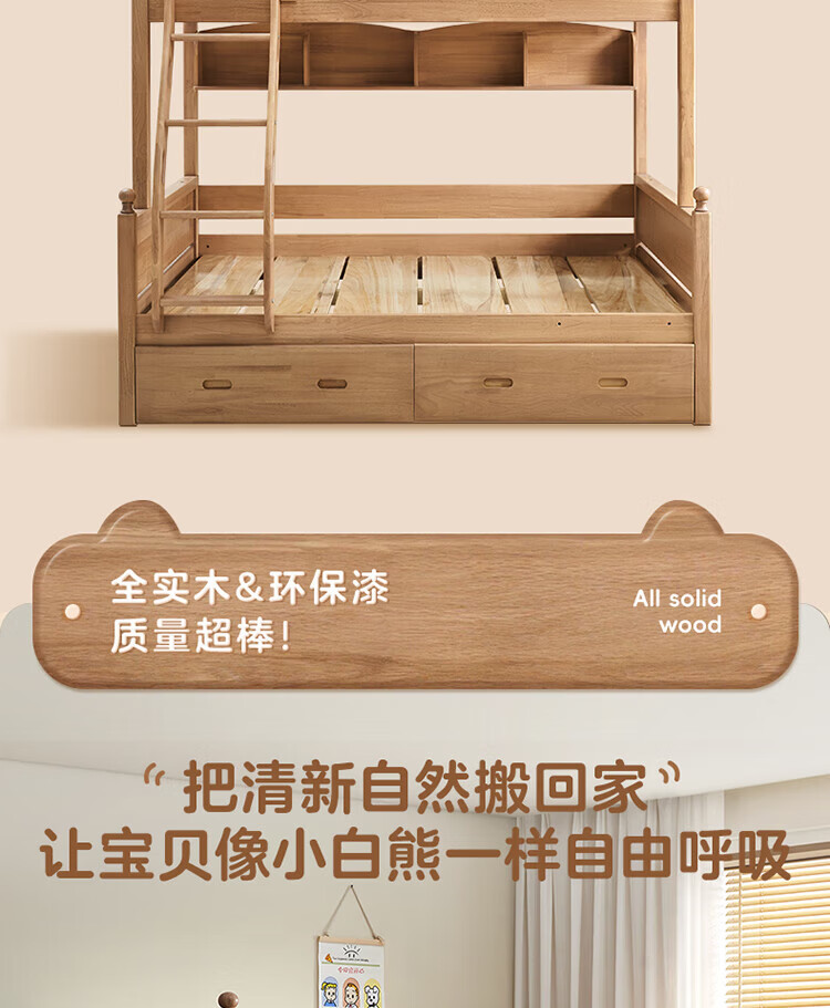 全友家居儿童上下铺全实木双层高低床带护栏男孩女孩小户型收纳储物床 橡胶木|上下床 1.35x1.9米