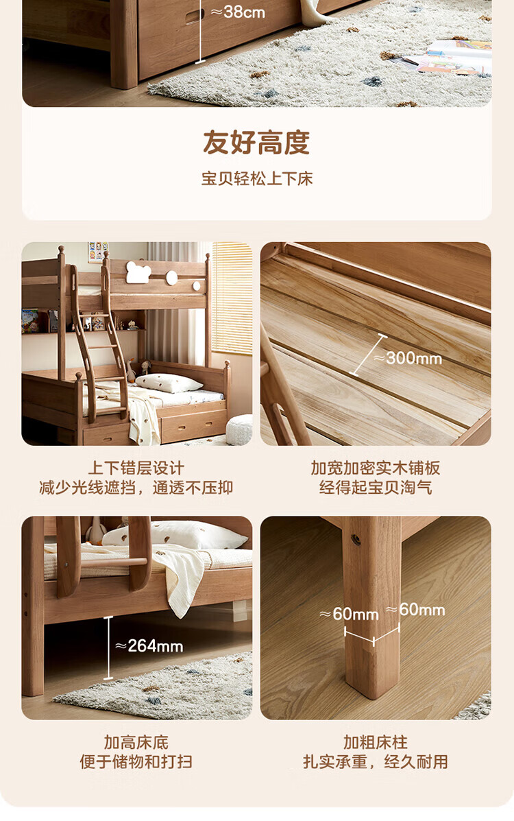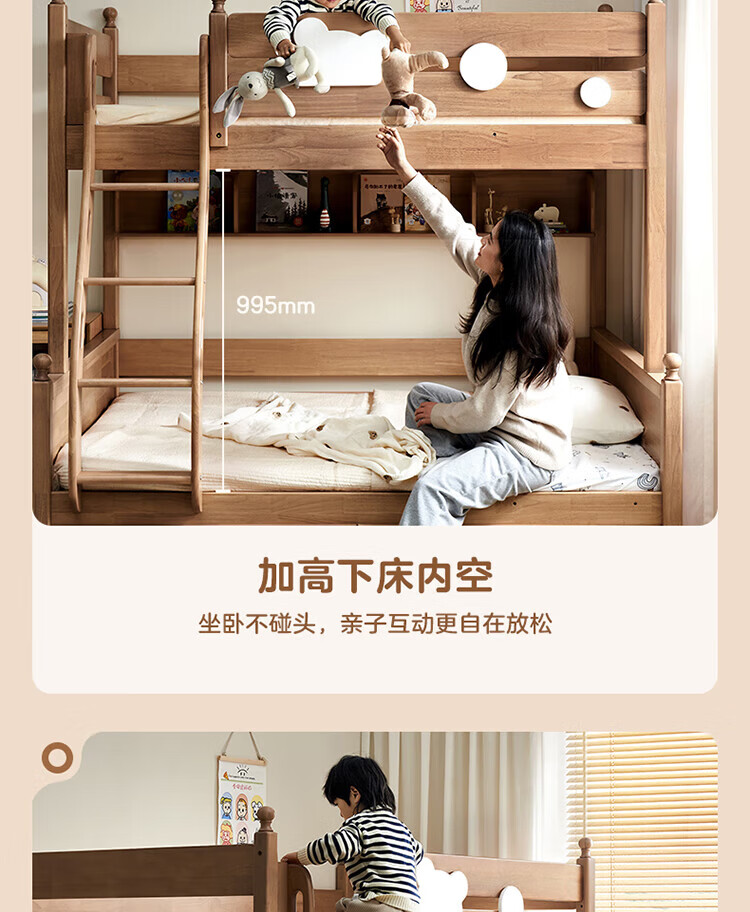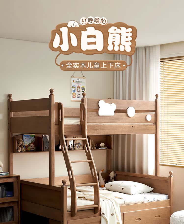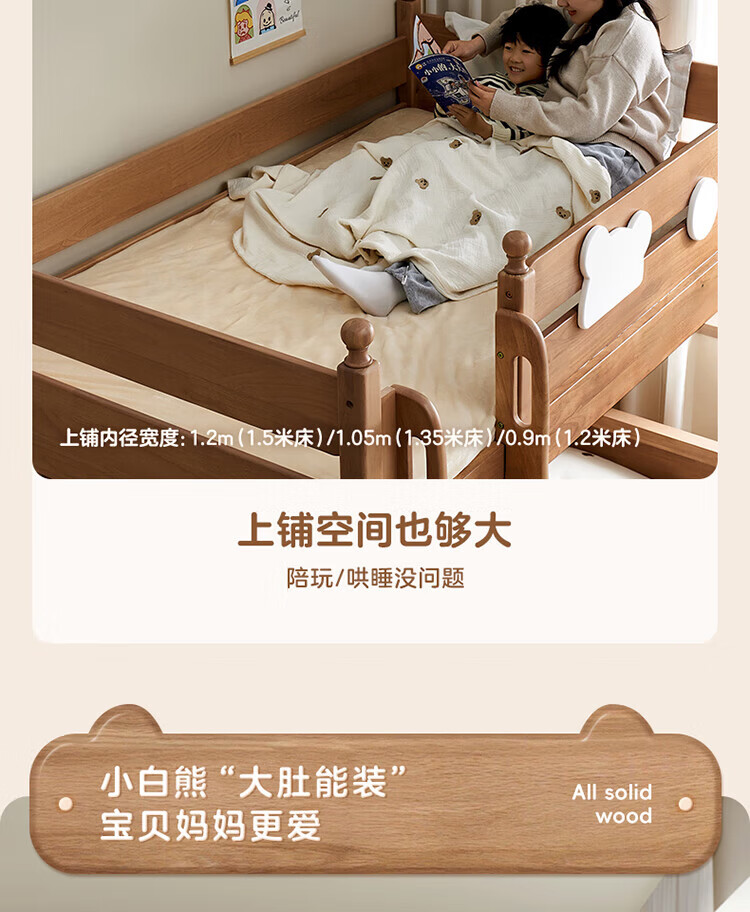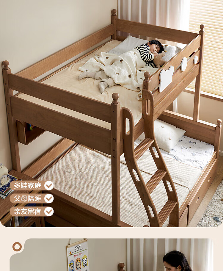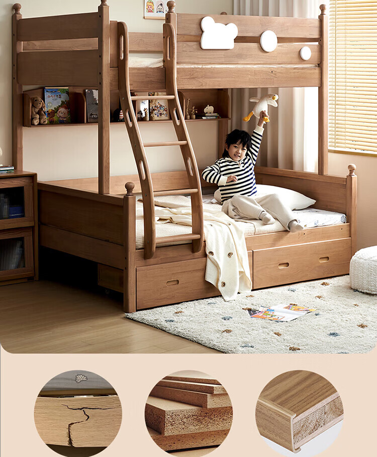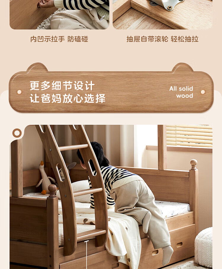 全友家居儿童上下铺全实木双层高低床带护栏男孩女孩小户型收纳储物床 橡胶木|上下床 1.35x1.9米