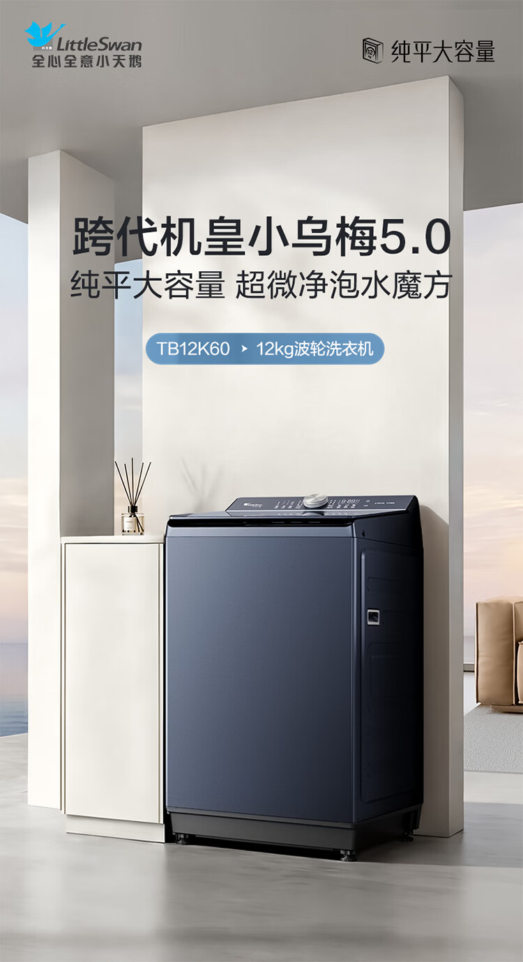 小天鹅(LittleSwan)小乌梅5.0 波轮洗衣机全自动家用 12KG大容量纯平 超微净泡 TB12K60 以旧换新 国家补贴 京东自营