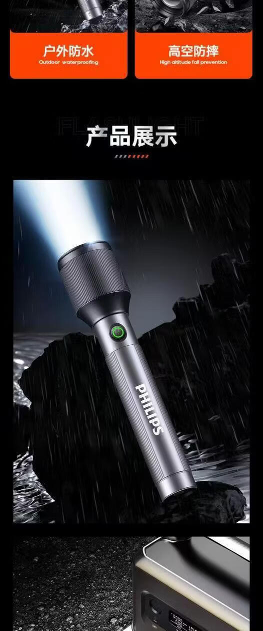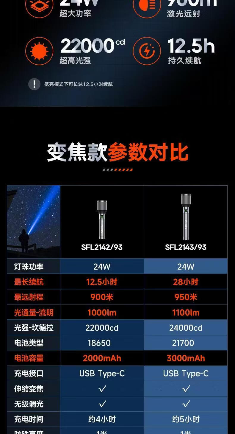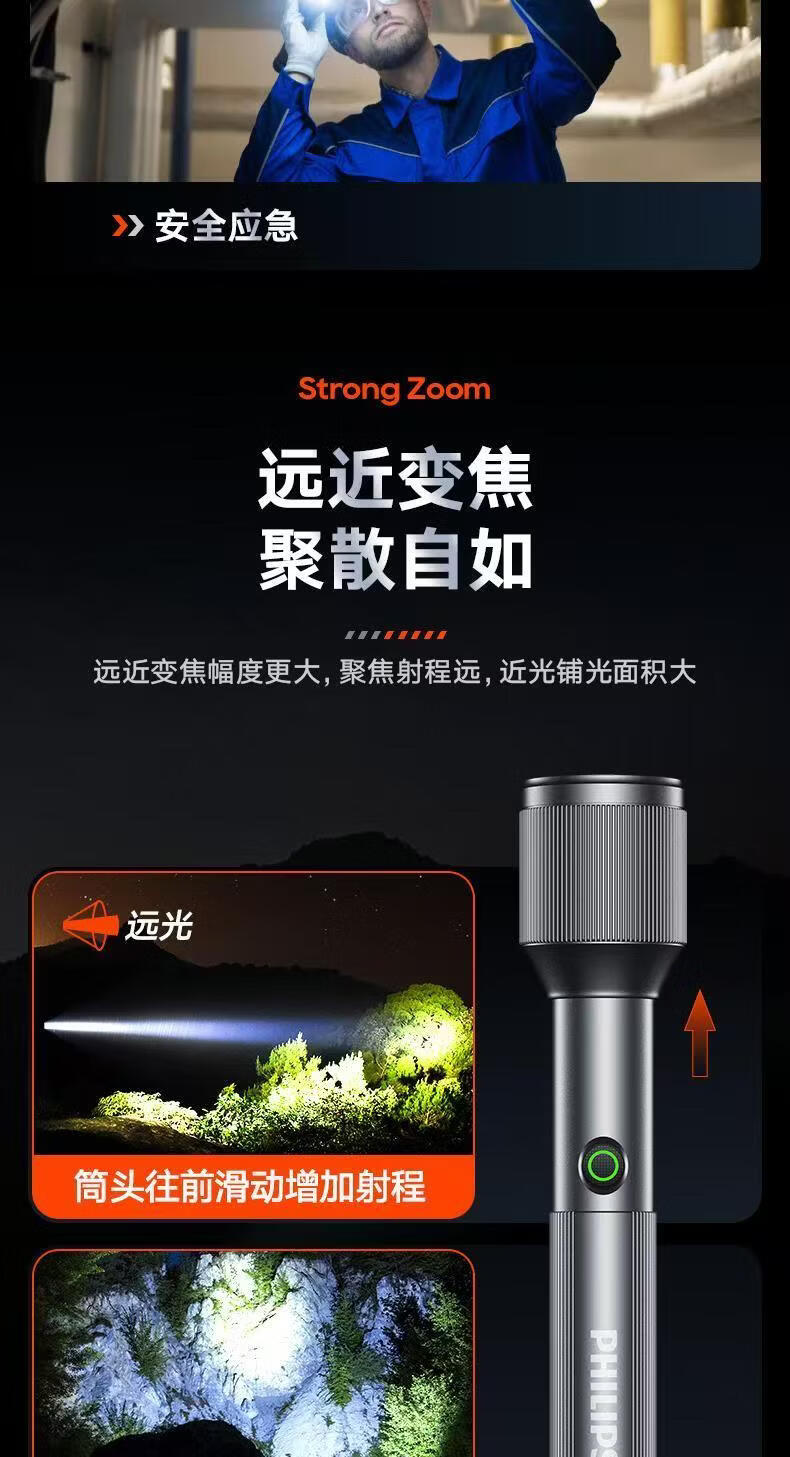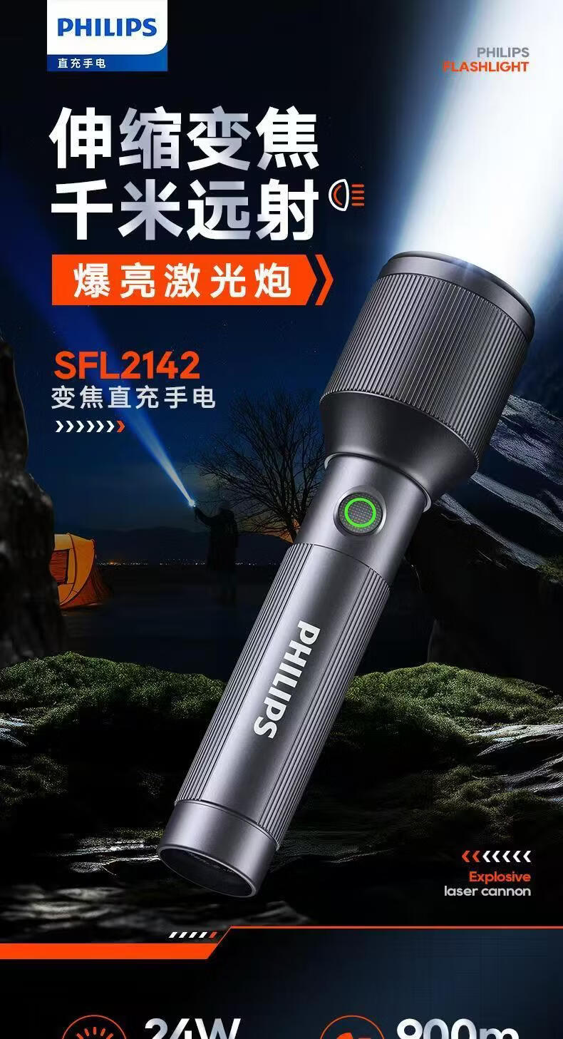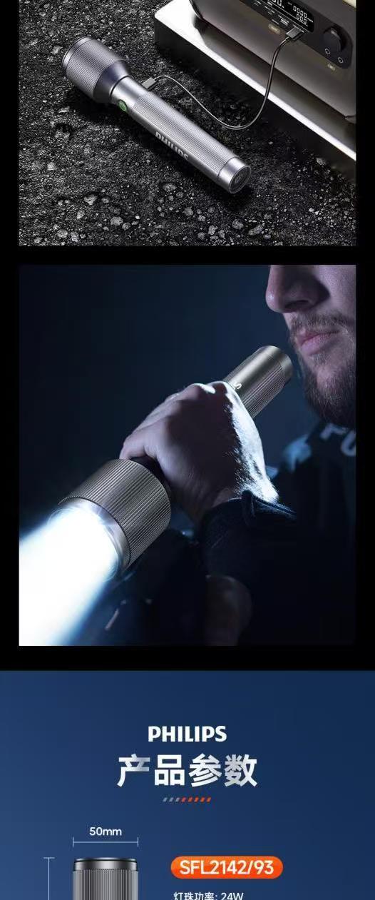 飞利浦(PHILIPS)伸缩变焦强光手电筒超长续航超亮充电家用户外远射SFL2142 24W/2000毫安/变焦/SFL2142