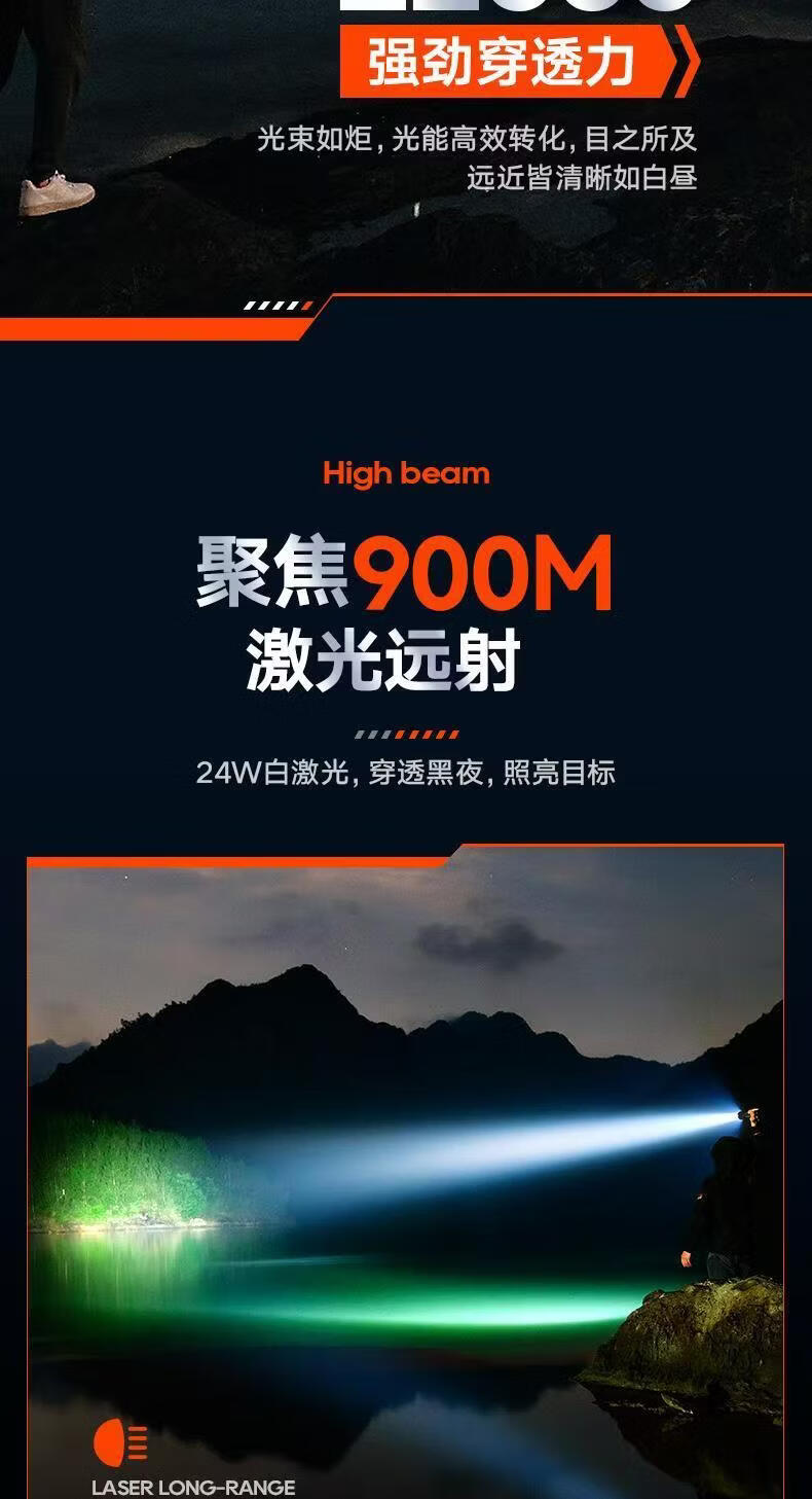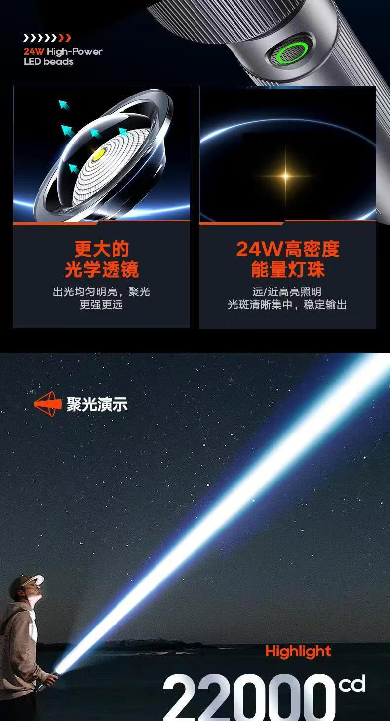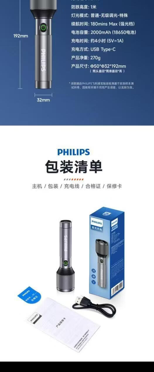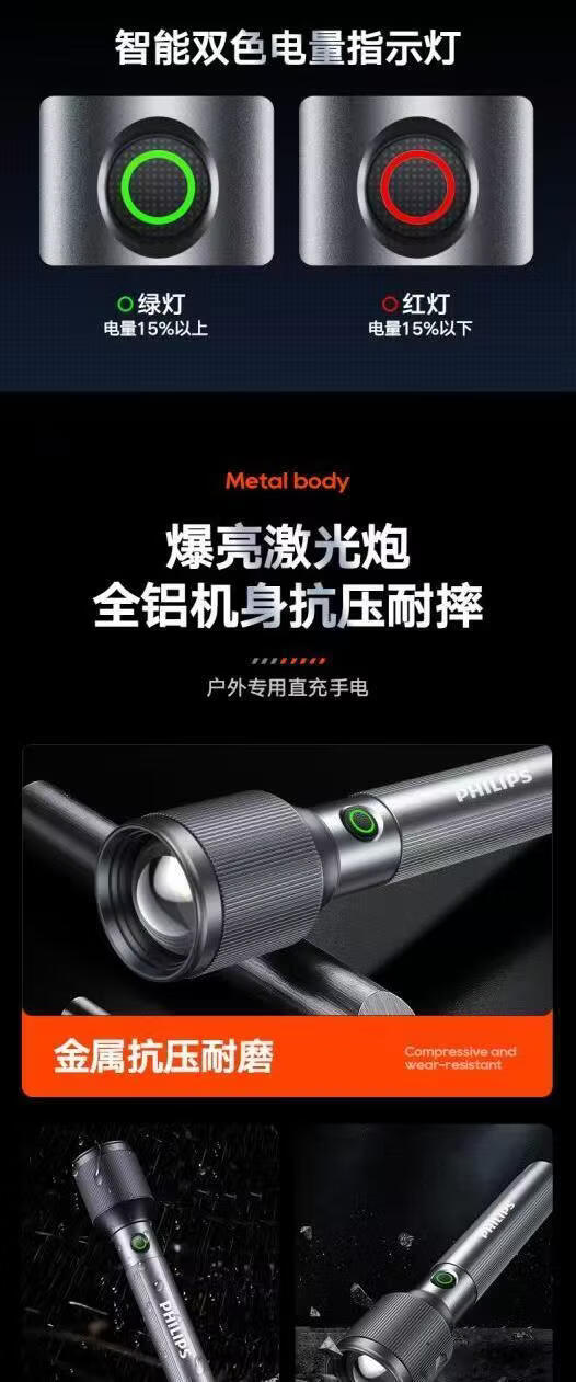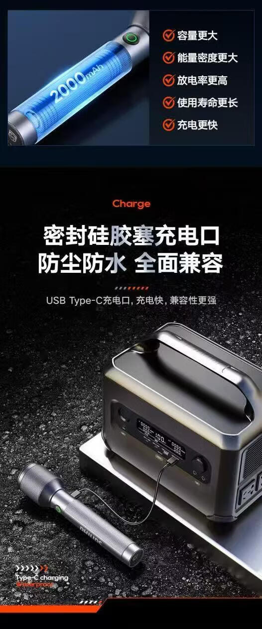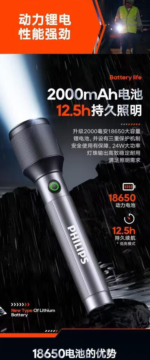 飞利浦(PHILIPS)伸缩变焦强光手电筒超长续航超亮充电家用户外远射SFL2142 24W/2000毫安/变焦/SFL2142