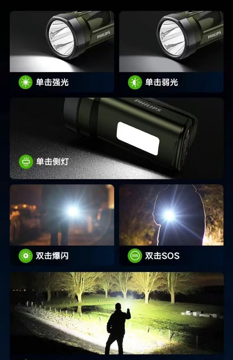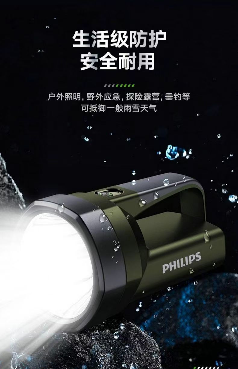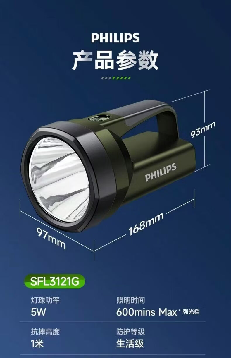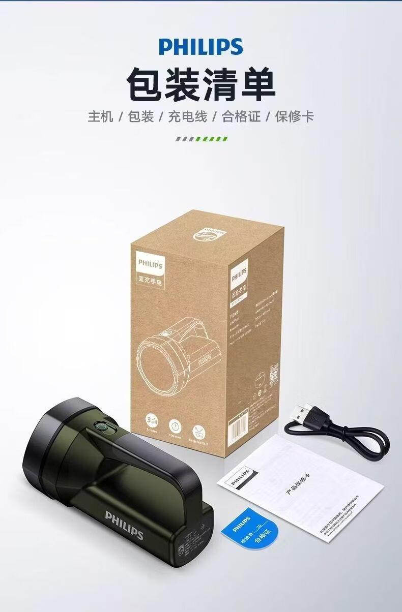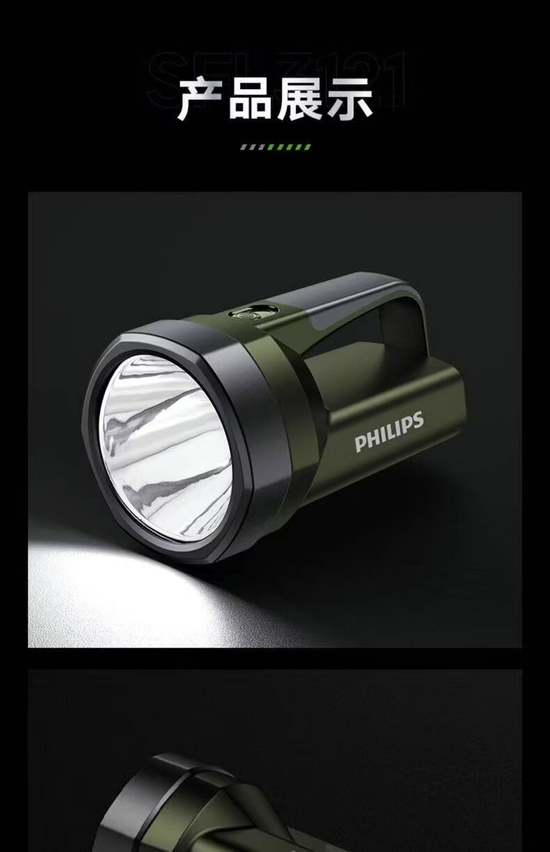 飞利浦(PHILIPS)手电筒强光高亮充电户外长续航远射手提巡逻探照灯应急灯SFL3121G 5W/6000毫安/SFL3121G