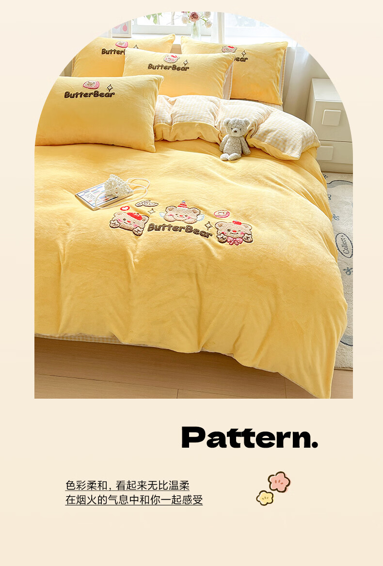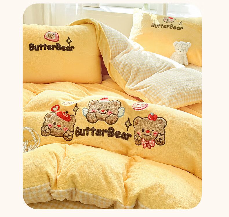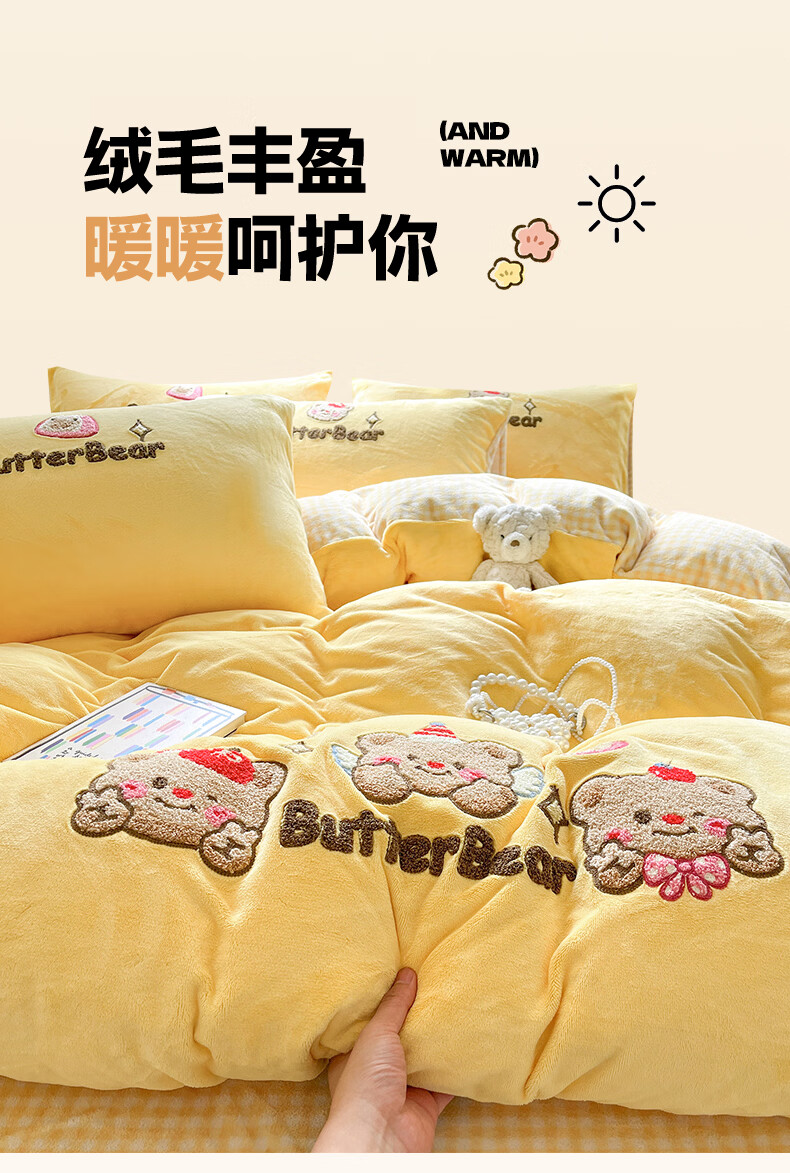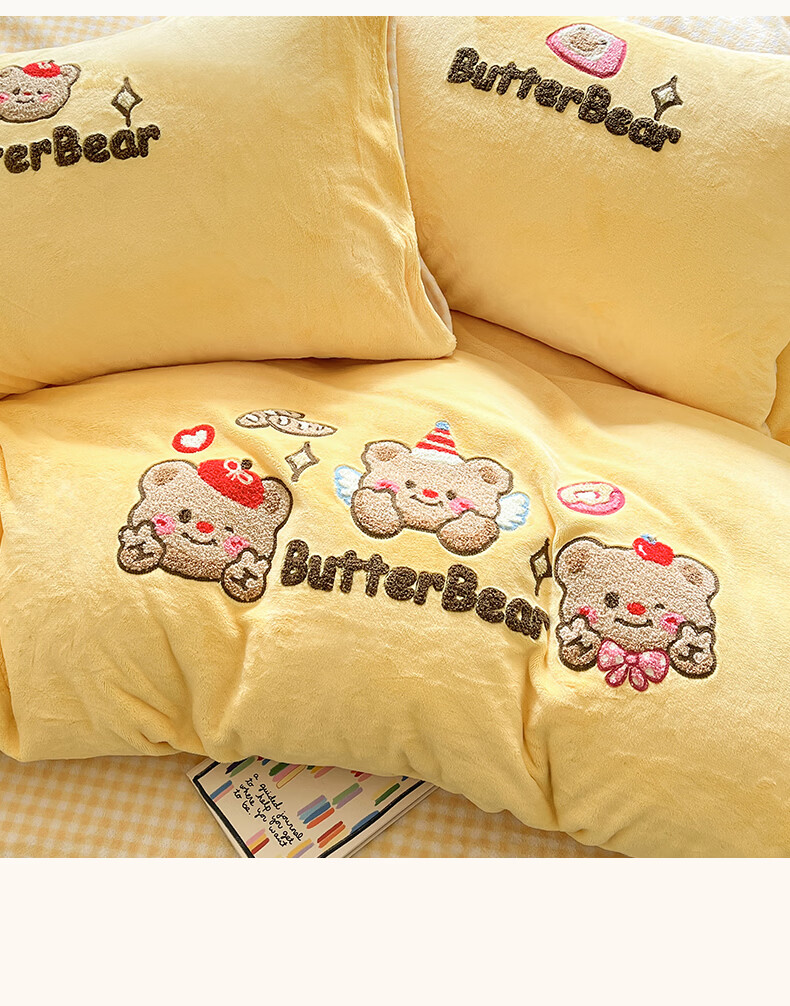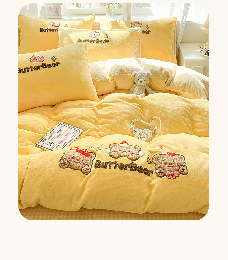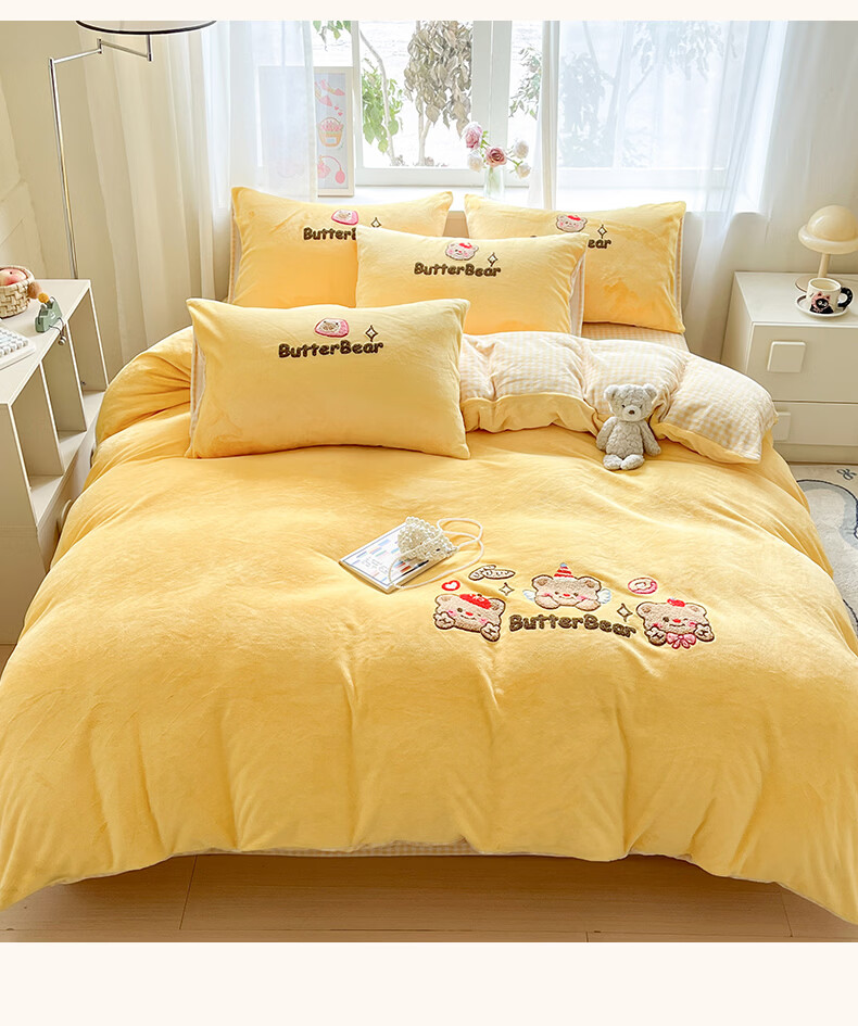 无印良品牛奶绒毛巾绣四件套冬季牛奶绒床单被套双面加绒被罩保暖床上用品 黄油熊-柠檬黄+格子黄 【加绒加厚 蓄热保暖】 1.8m 床单款 四件套-被套200x230cm