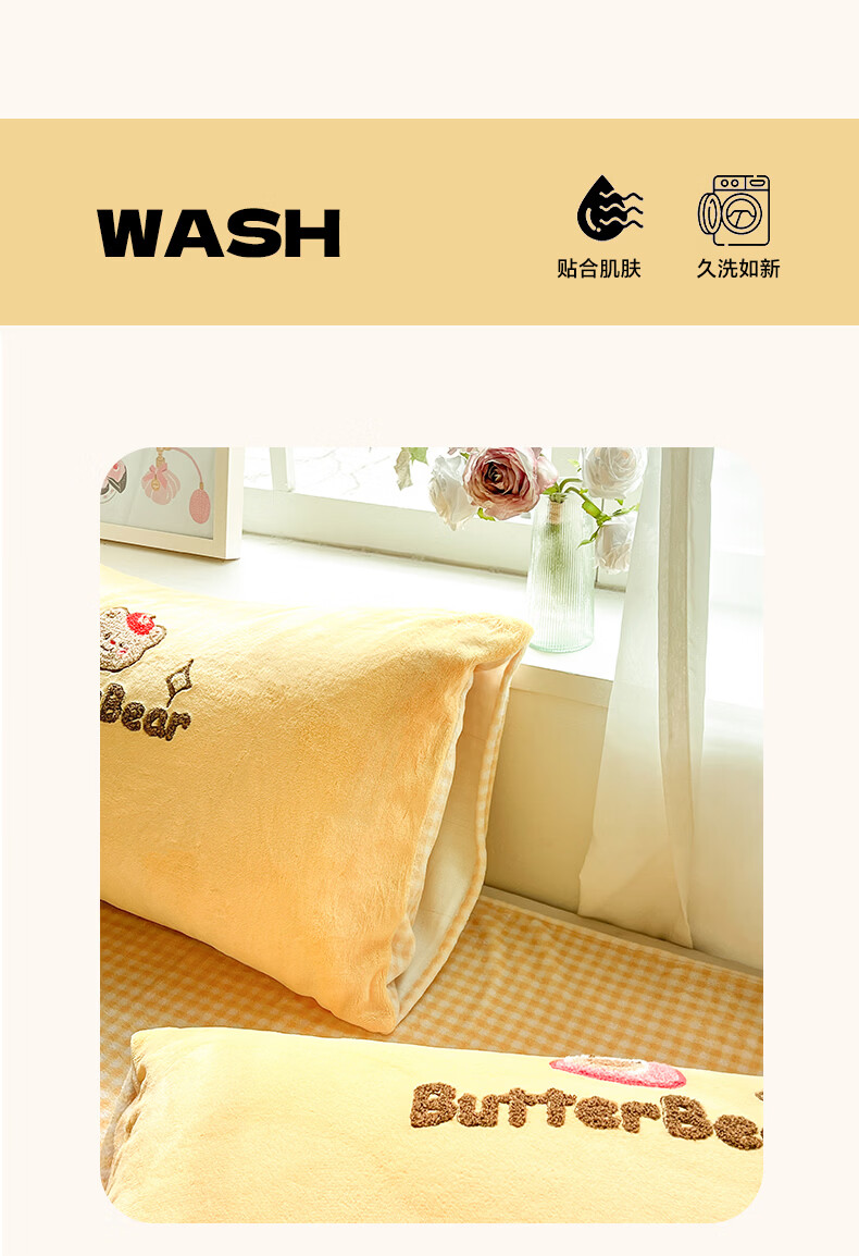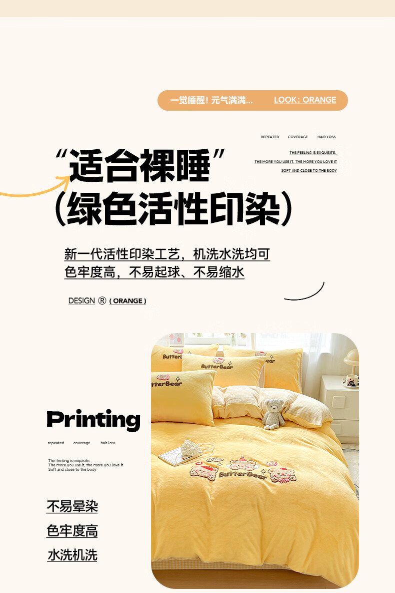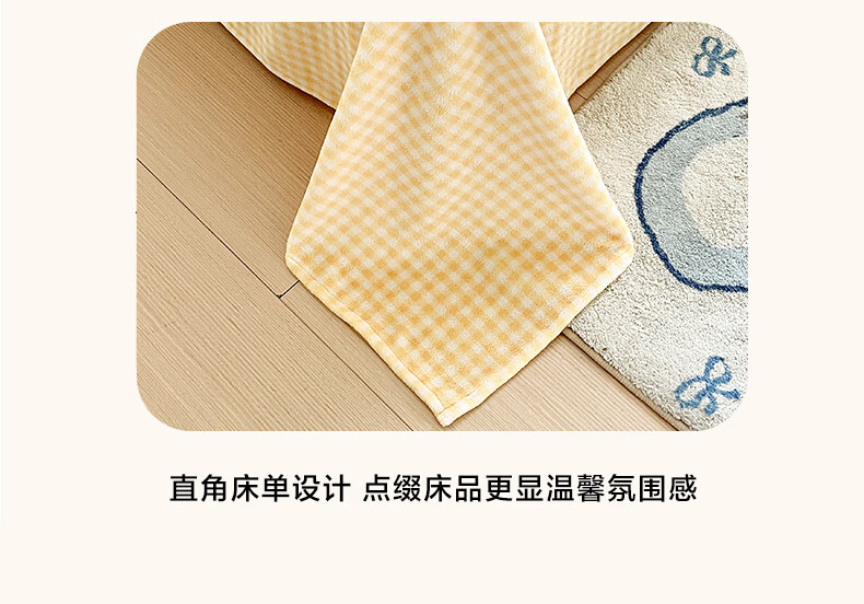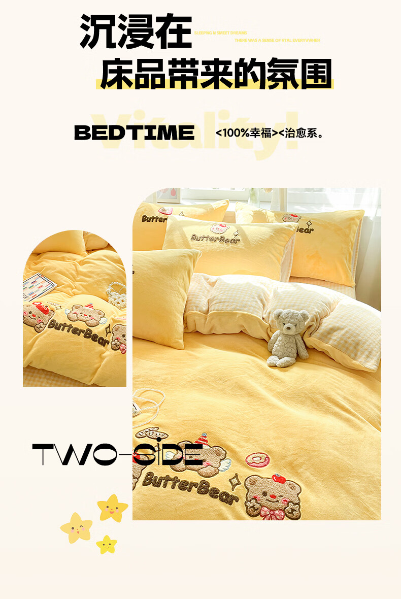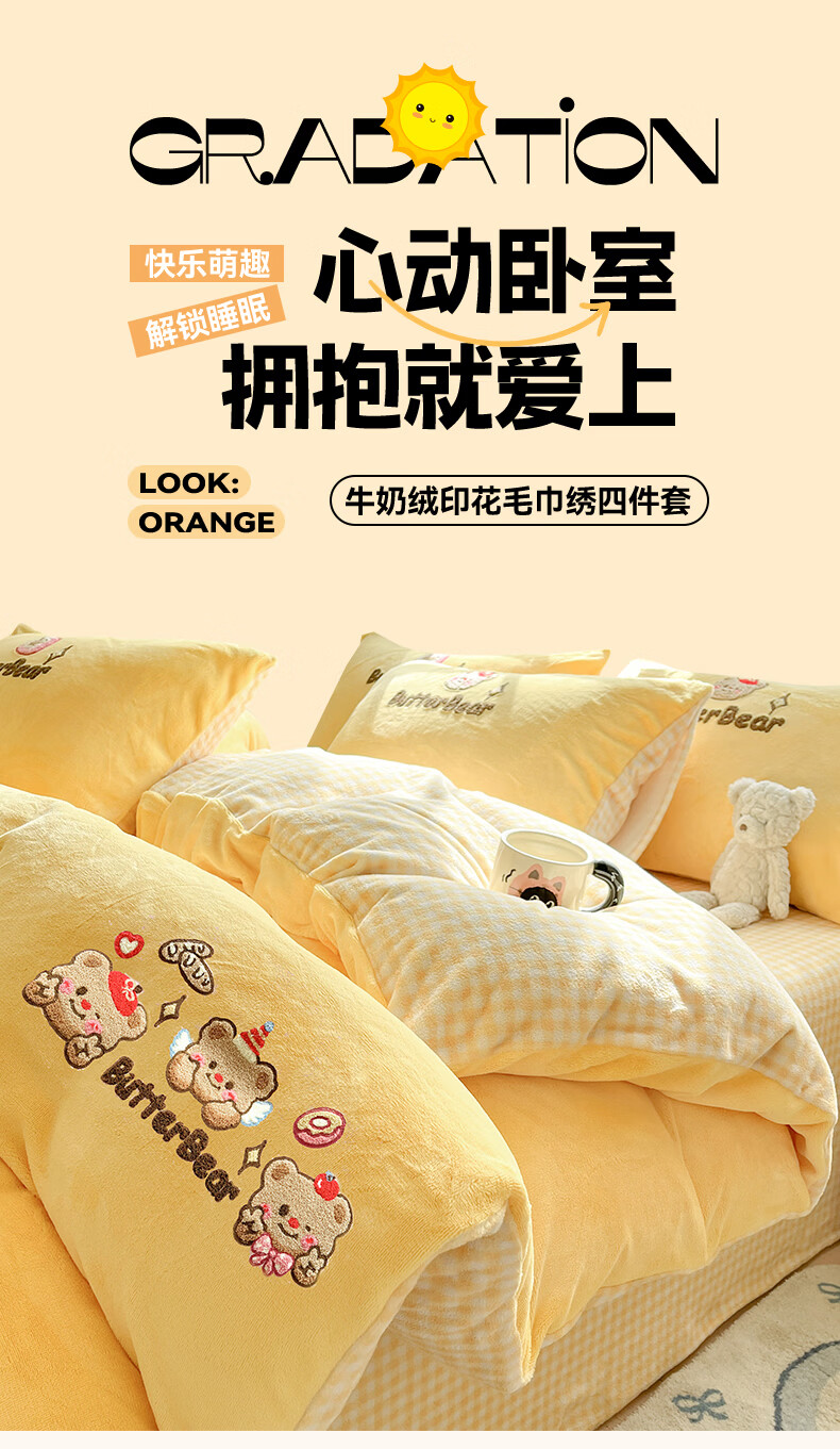 无印良品牛奶绒毛巾绣四件套冬季牛奶绒床单被套双面加绒被罩保暖床上用品 黄油熊-柠檬黄+格子黄 【加绒加厚 蓄热保暖】 1.8m 床单款 四件套-被套200x230cm