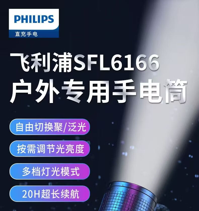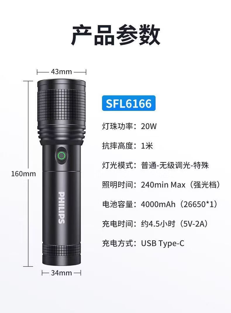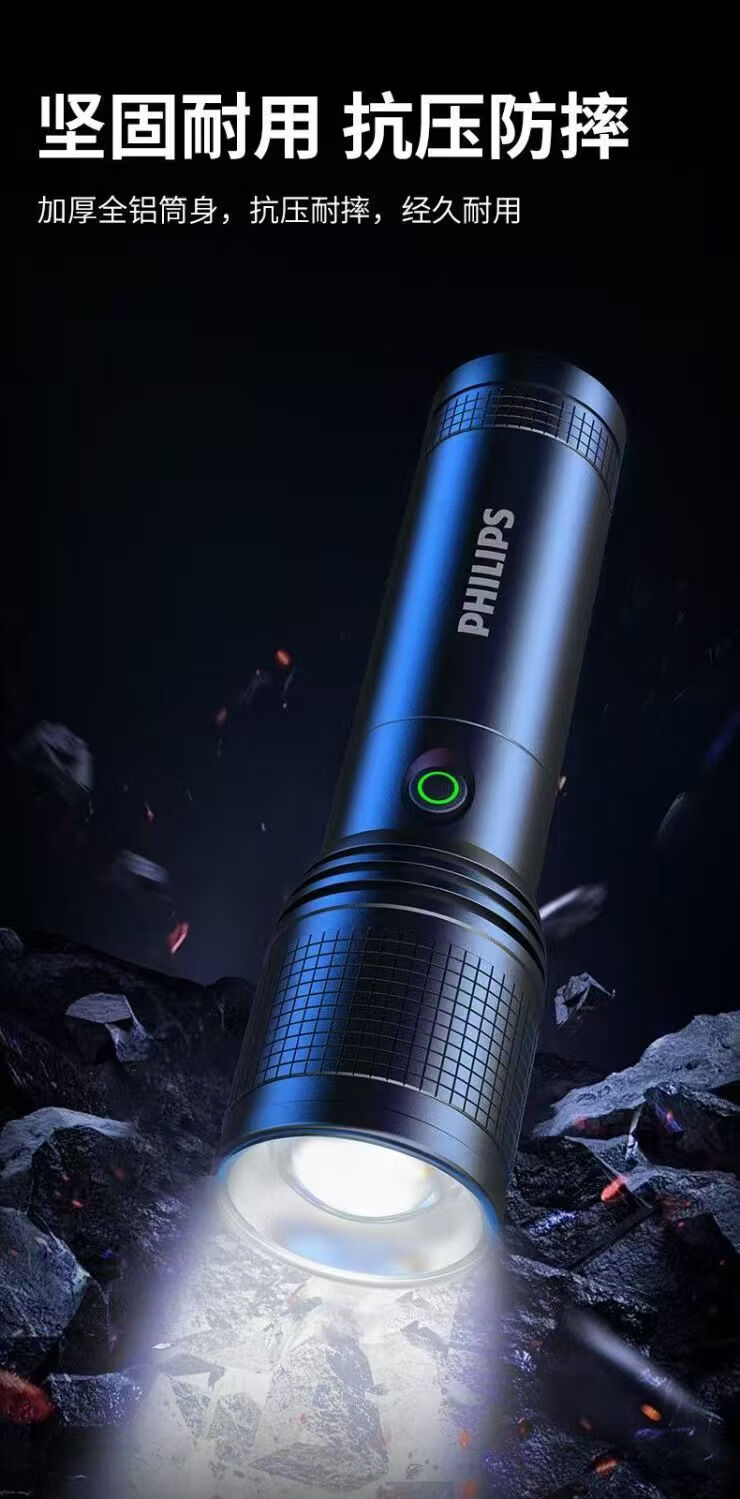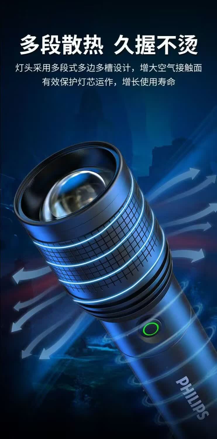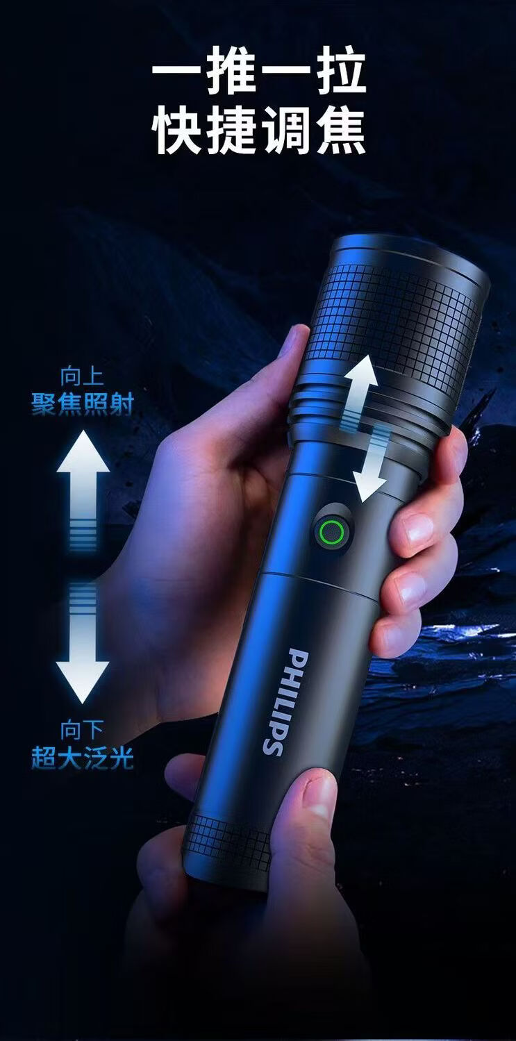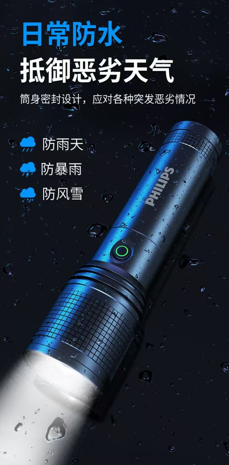 飞利浦(PHILIPS)强光变焦手电筒户外照明灯便携高亮充电照明长久续航应急手电筒SFL6166 20W/4000毫安/变焦/SFL6166