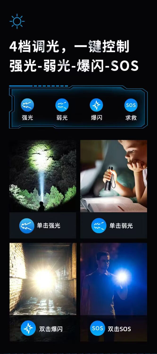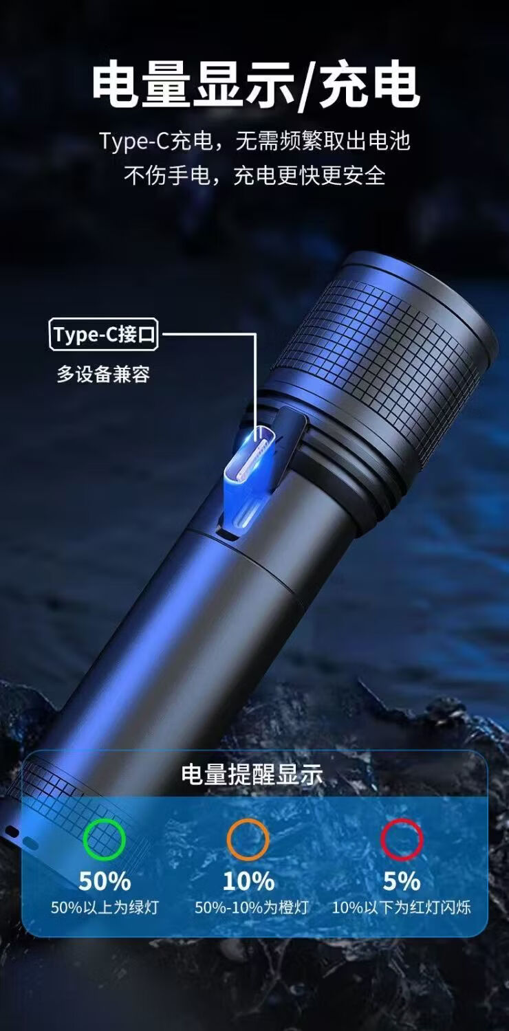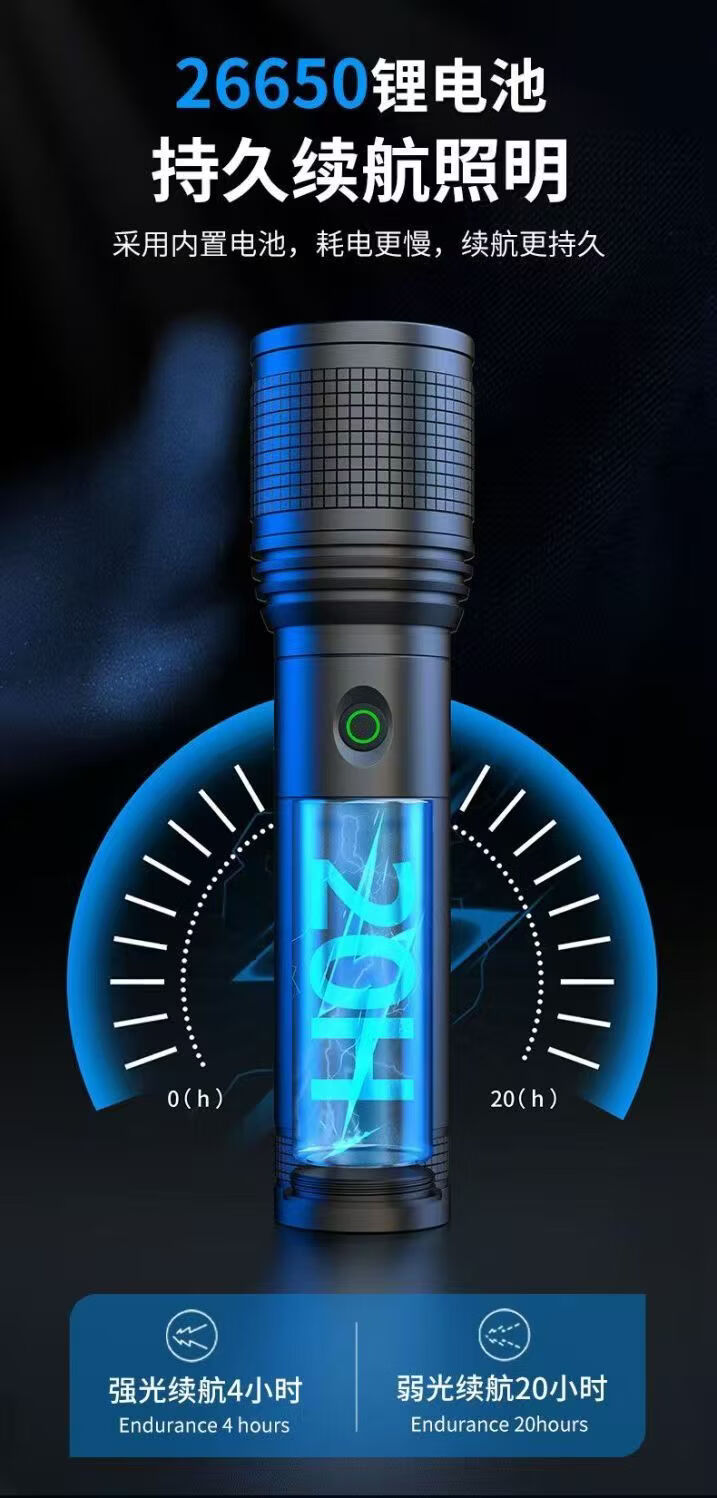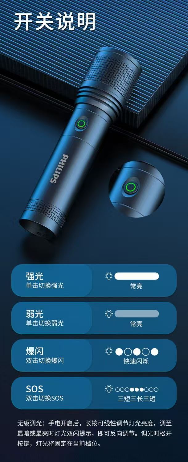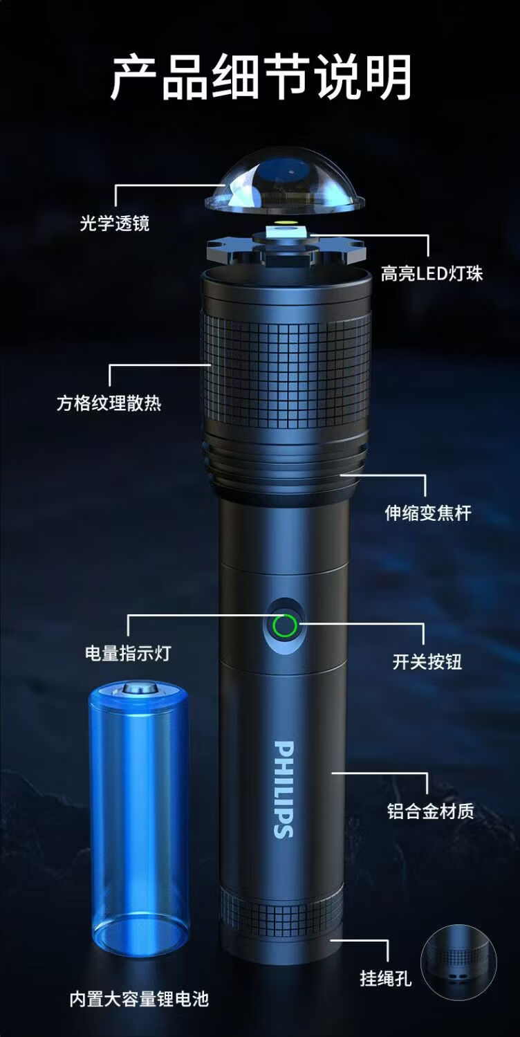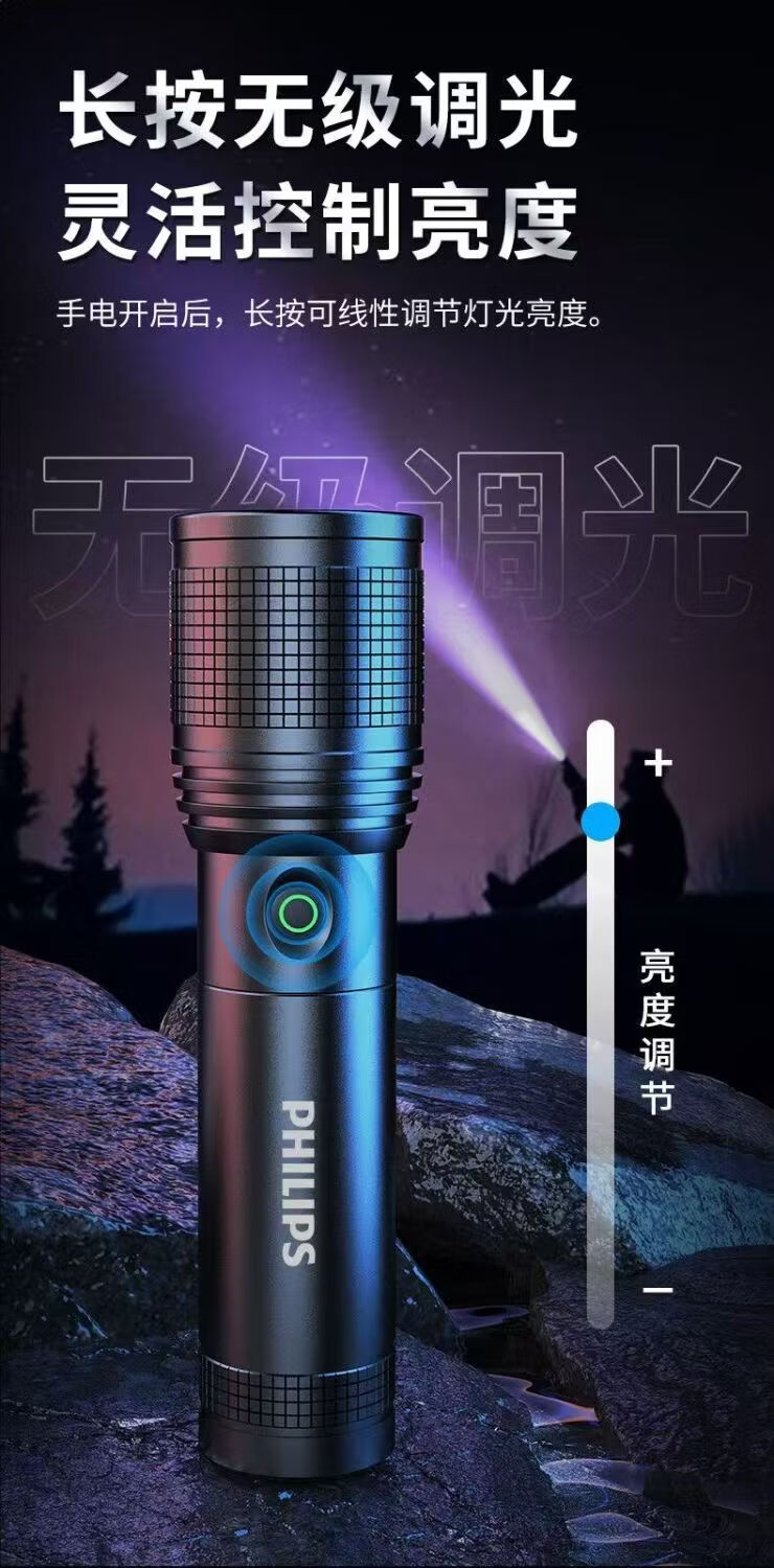 飞利浦(PHILIPS)强光变焦手电筒户外照明灯便携高亮充电照明长久续航应急手电筒SFL6166 20W/4000毫安/变焦/SFL6166