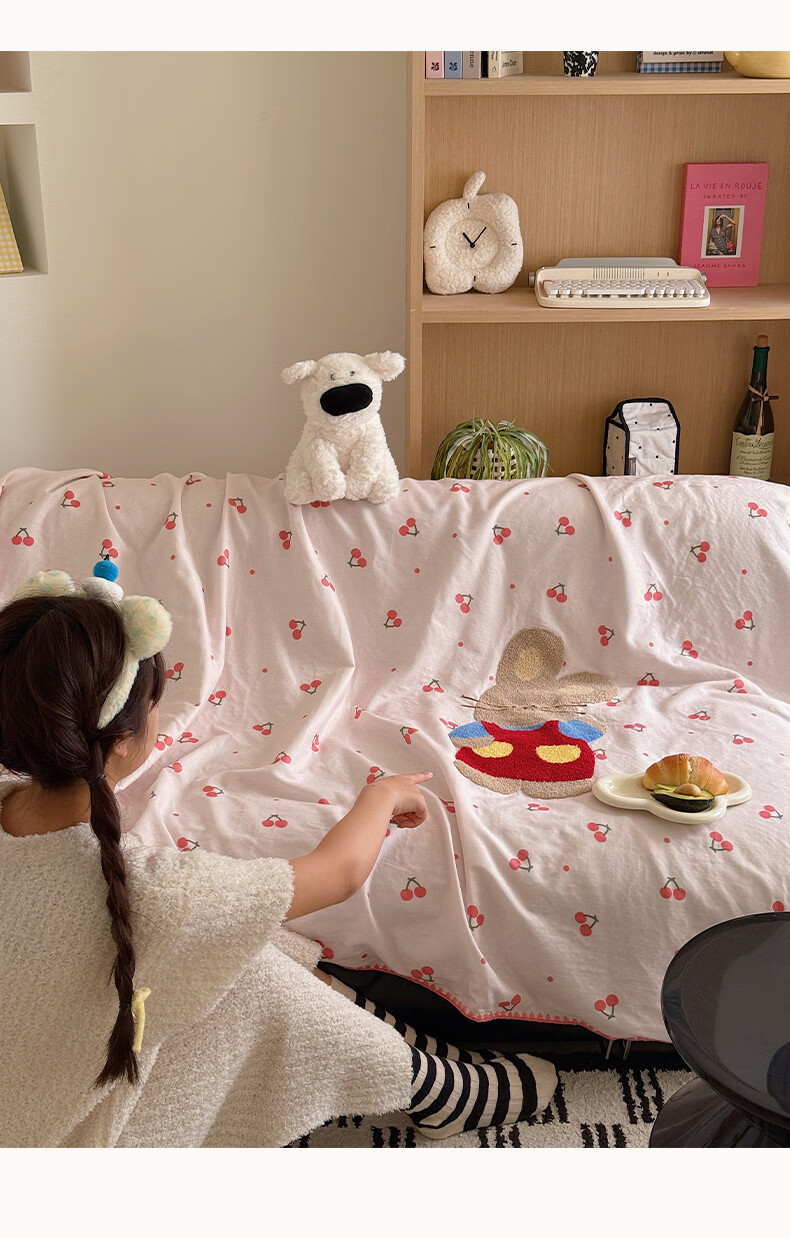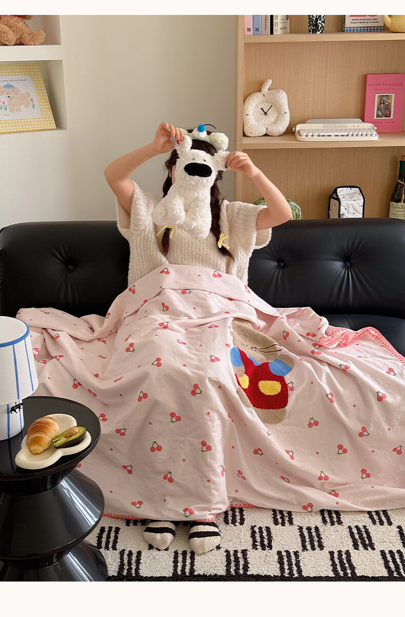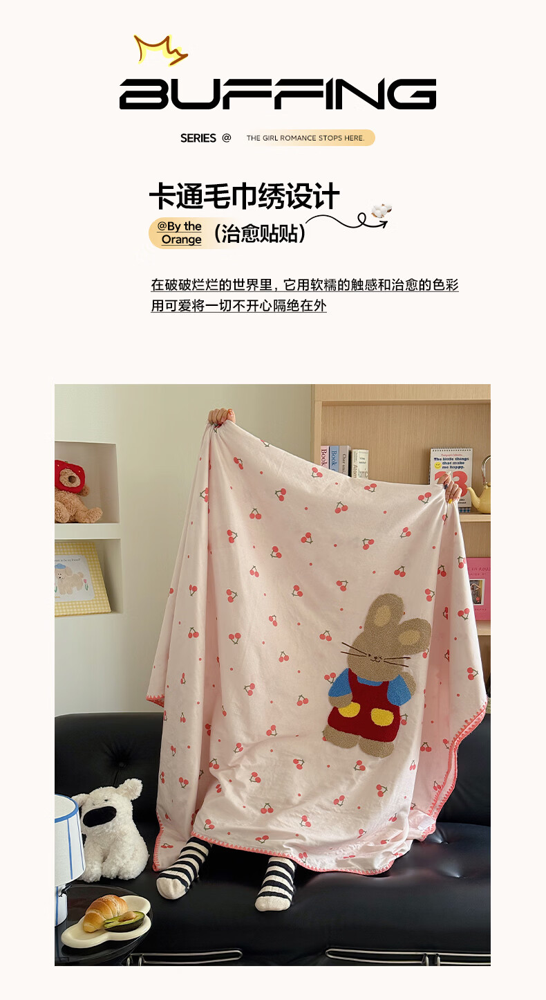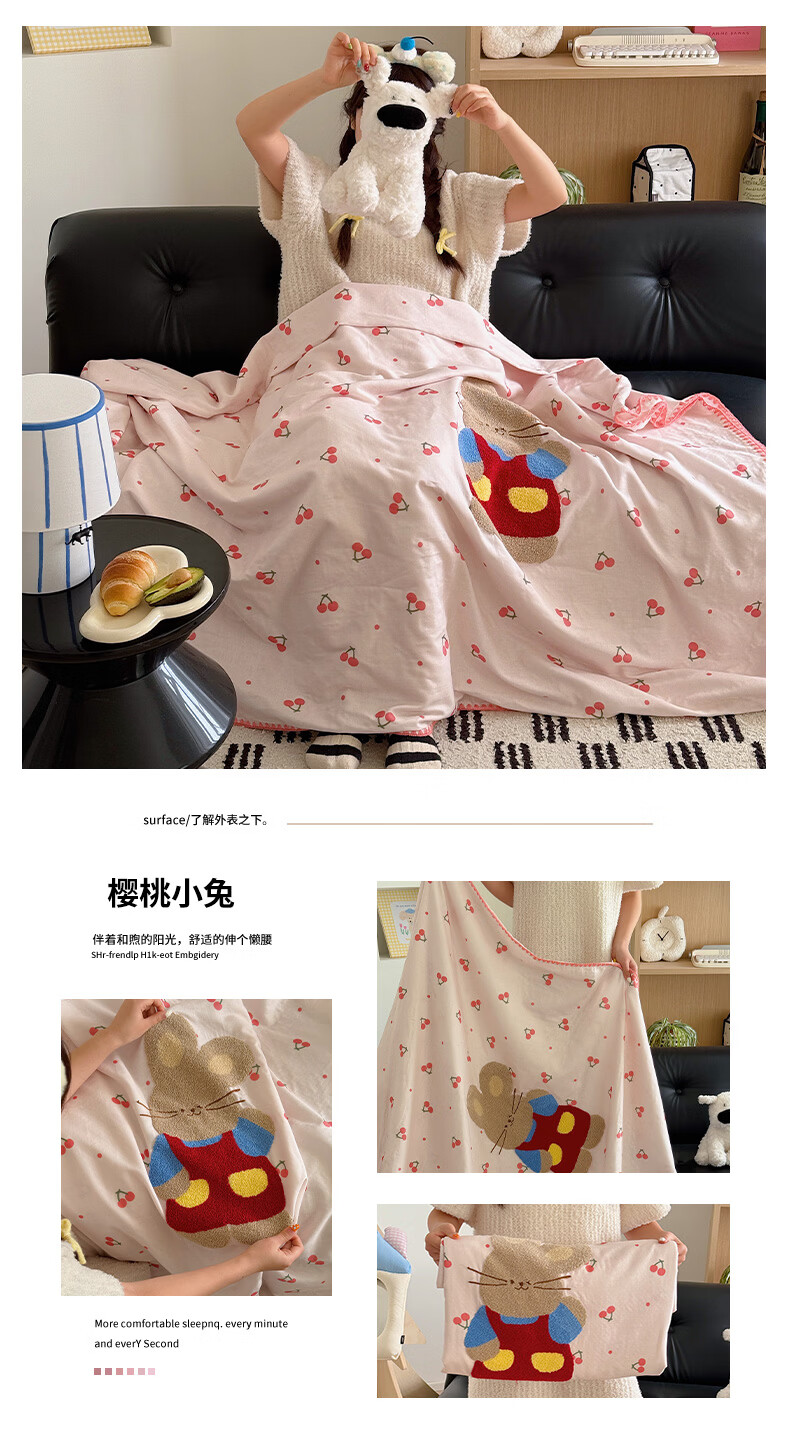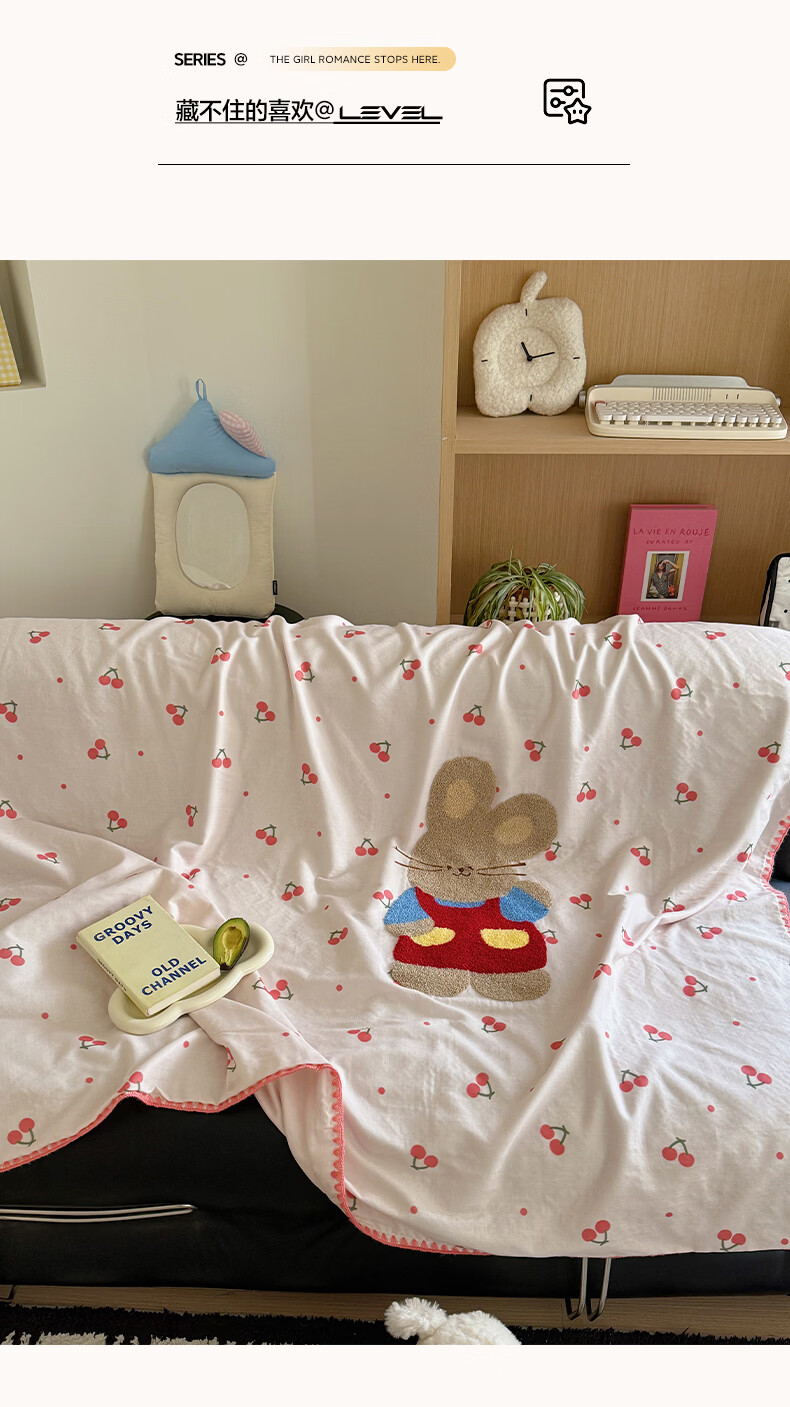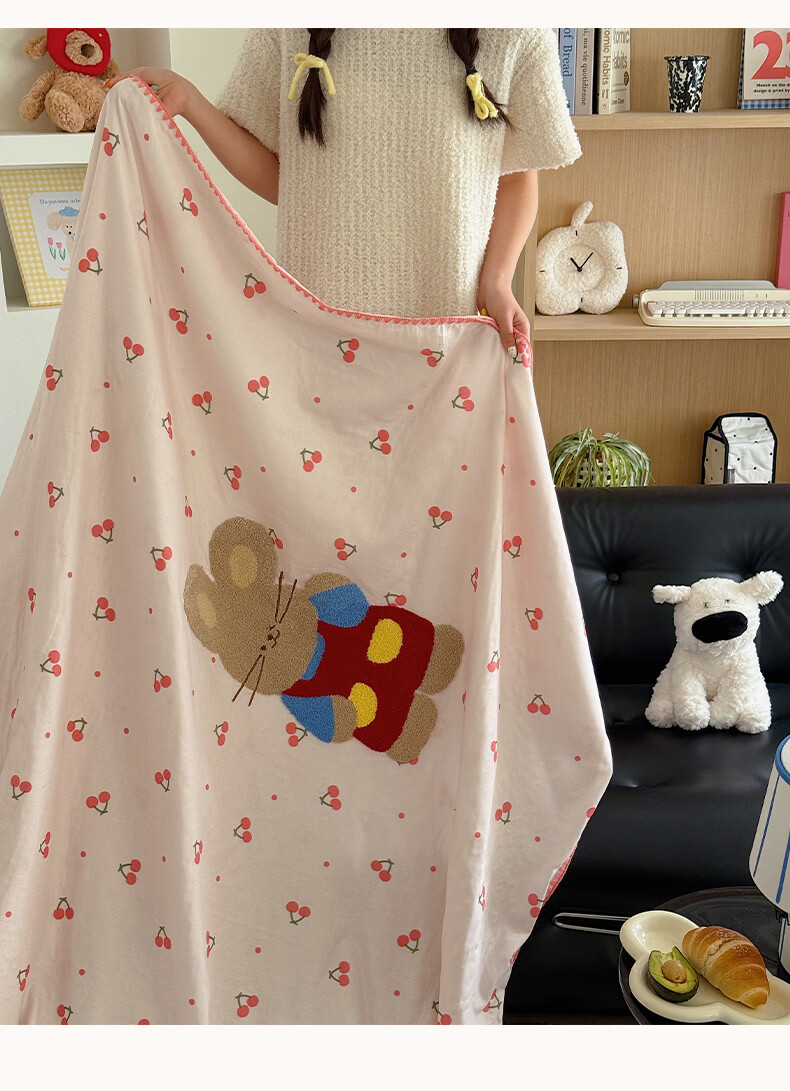 无印良品纯棉全棉毛巾绣毛毯被子办公室午睡毯午休毯子铺床单人双人盖毯 樱桃小兔【100%全棉 软糯亲肤 舒适透气】 100*150cm沙发毯