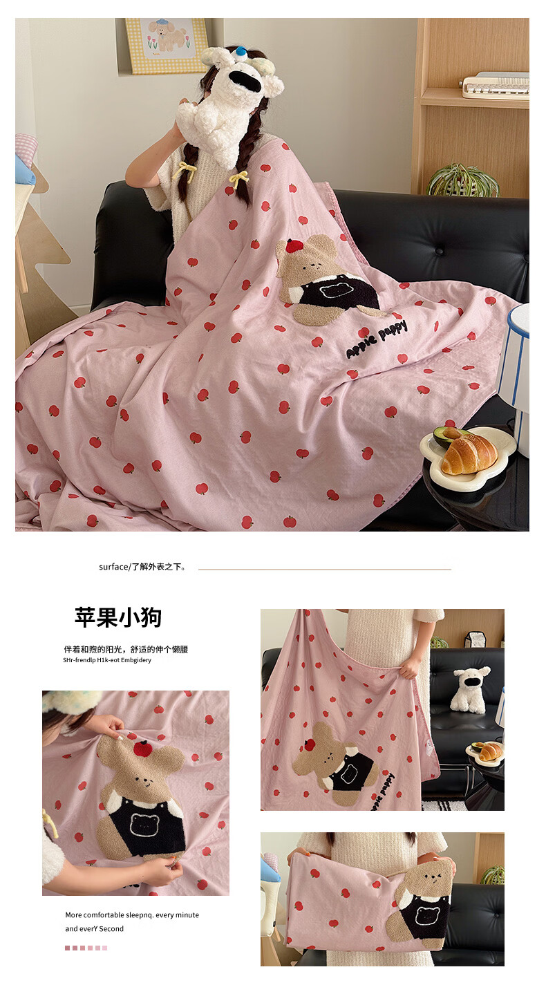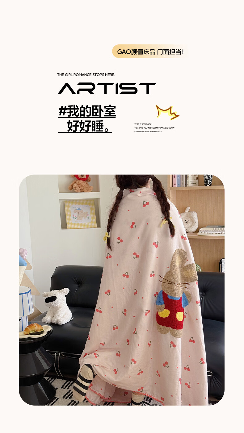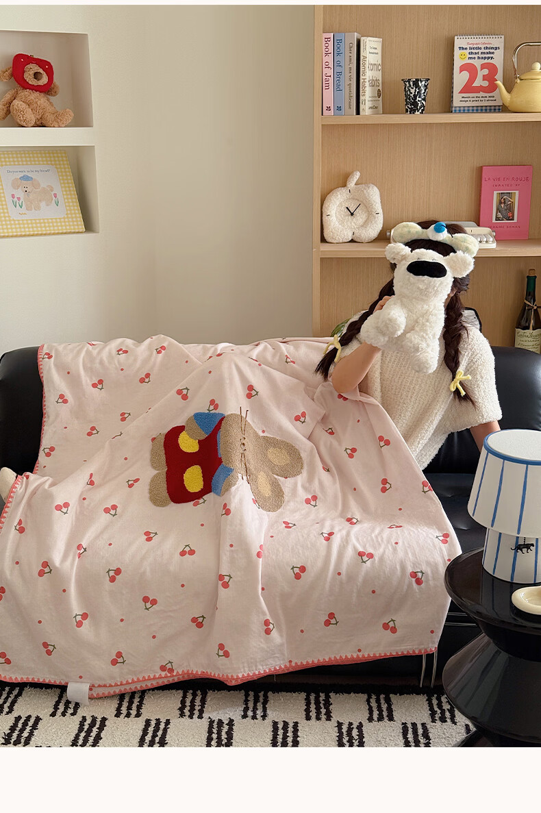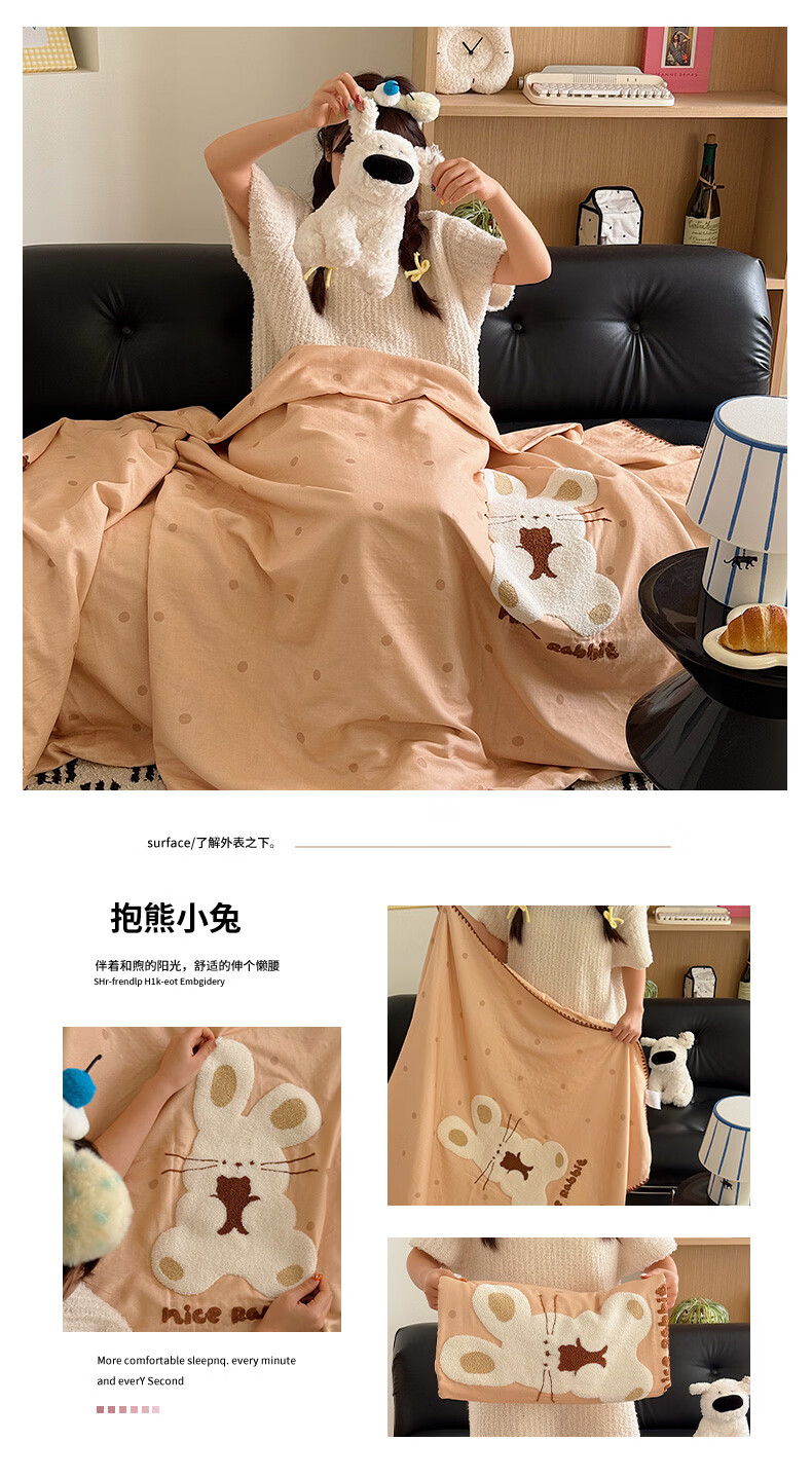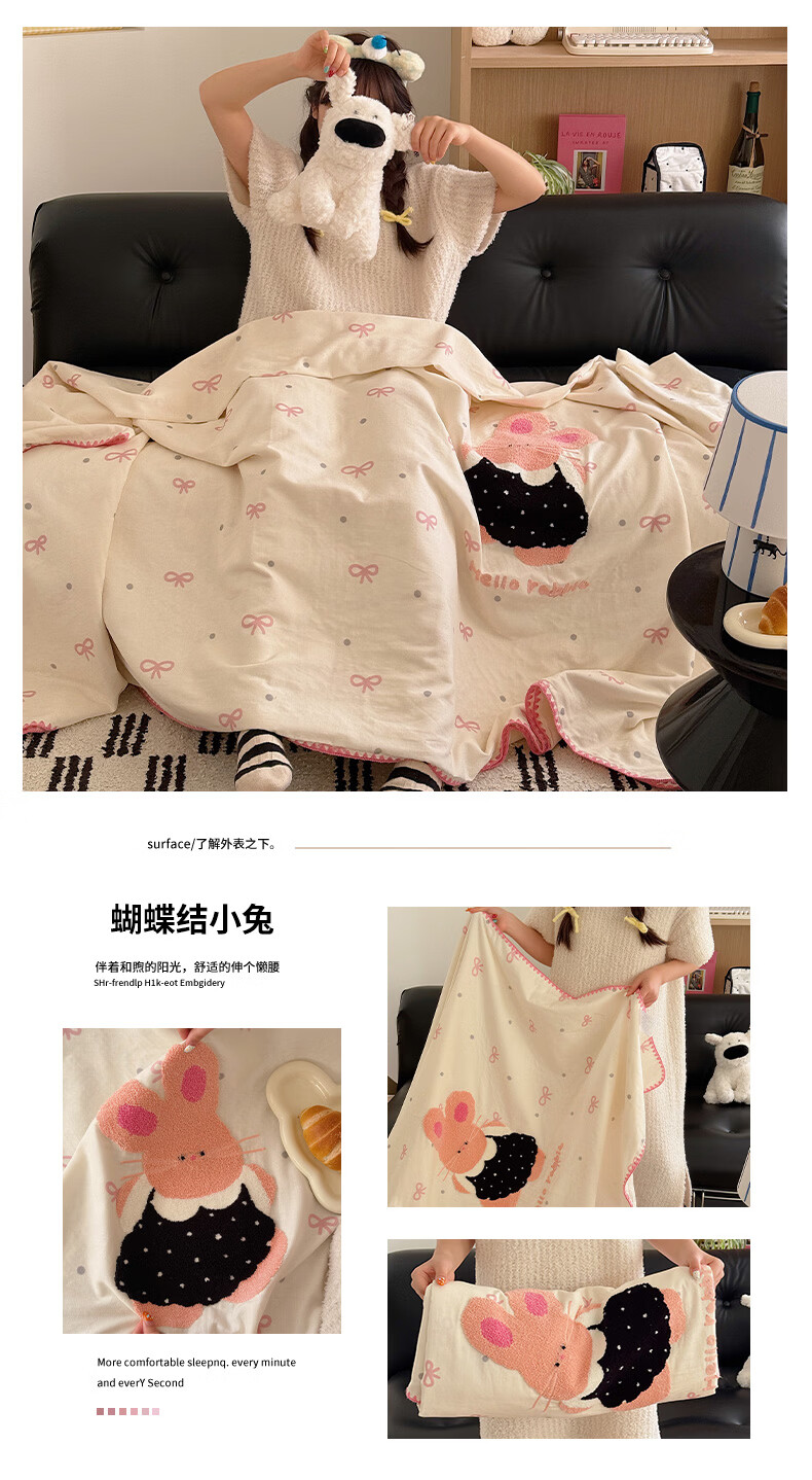 无印良品纯棉全棉毛巾绣毛毯被子办公室午睡毯午休毯子铺床单人双人盖毯 樱桃小兔【100%全棉 软糯亲肤 舒适透气】 100*150cm沙发毯