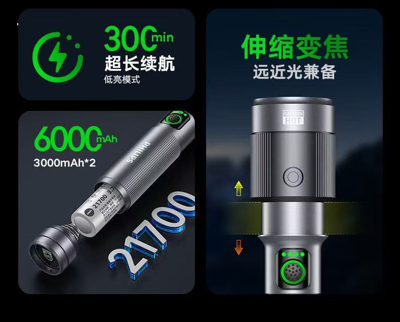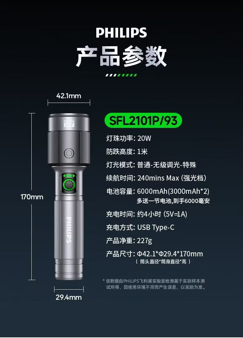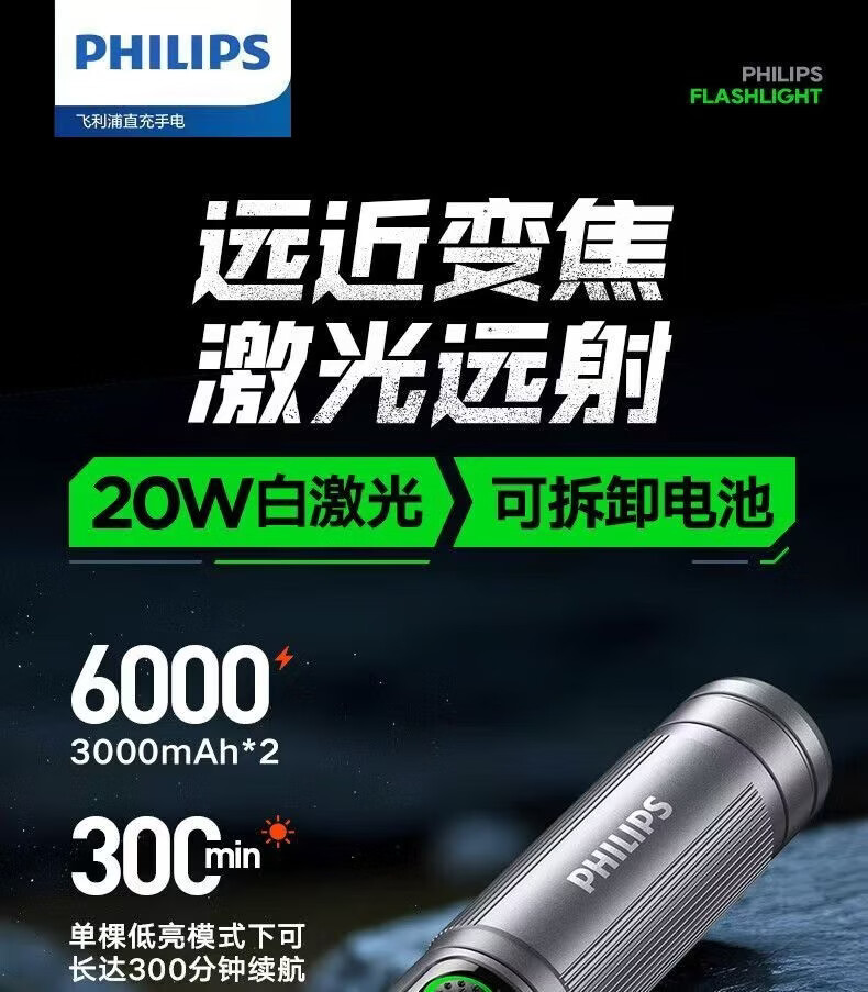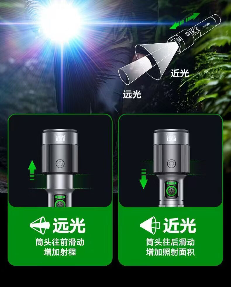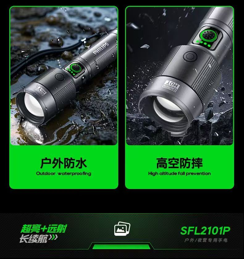 飞利浦强光手电筒可拆卸锂电池户外高亮变焦远射便携持久续航SFL2101P 20W/3000毫安/变焦/SFL2101P