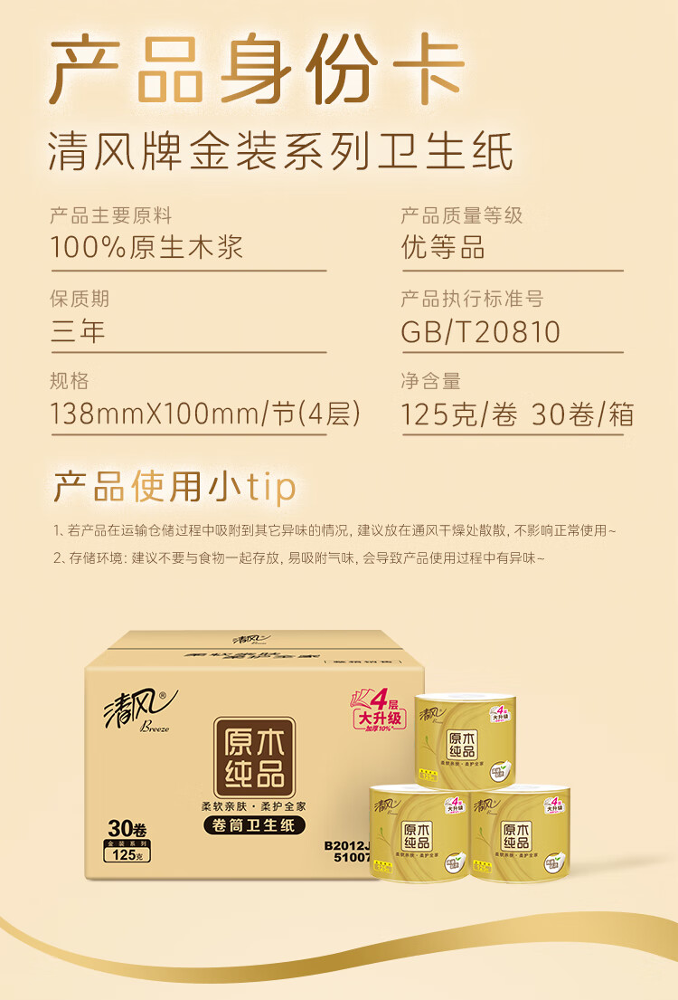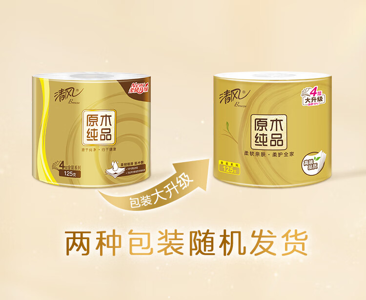 清风有芯卷纸 原木金装4层125克*30卷 卫生纸 纸巾整箱 厕纸 卷筒纸