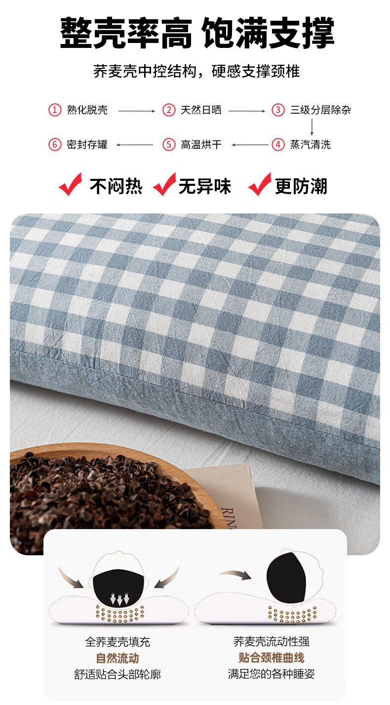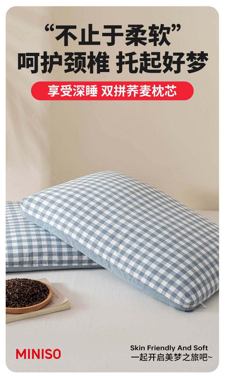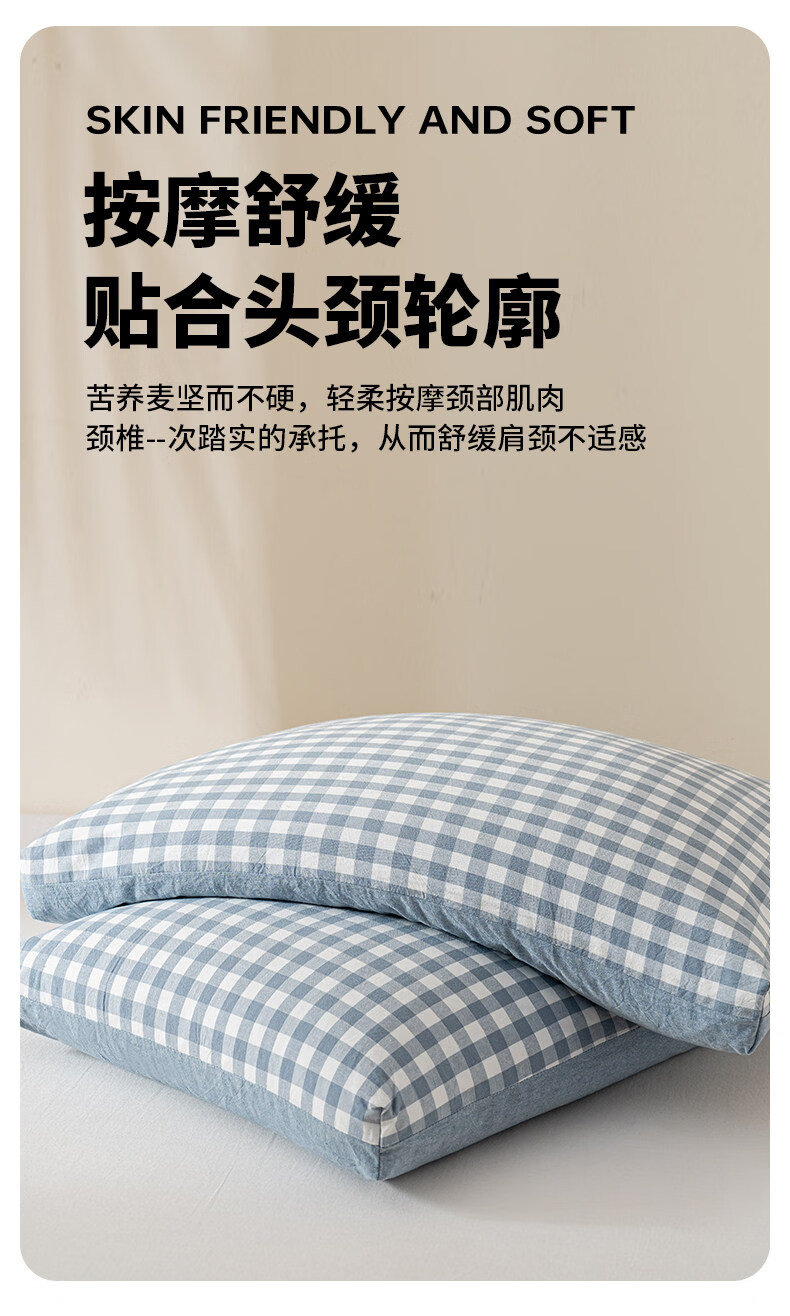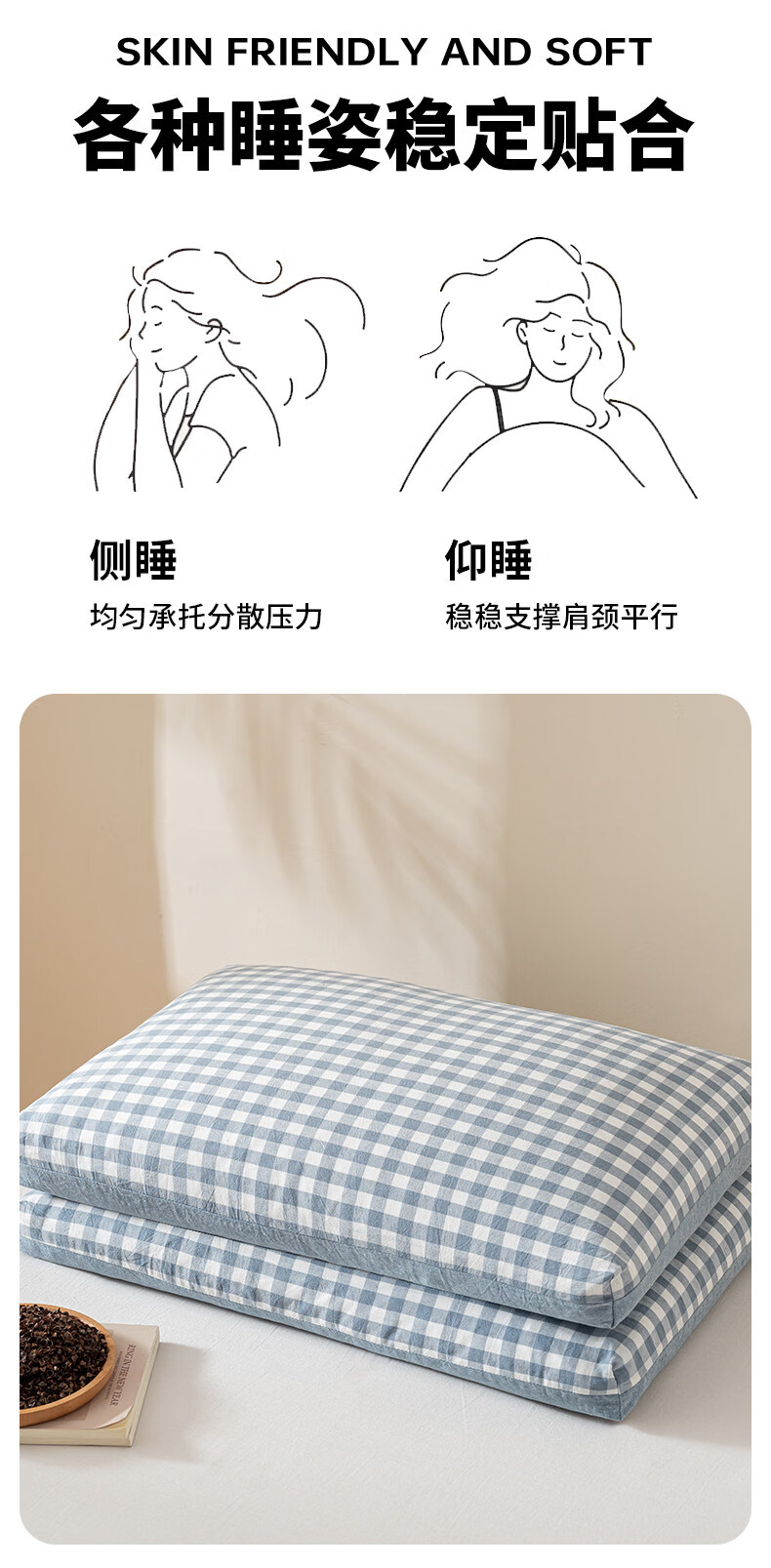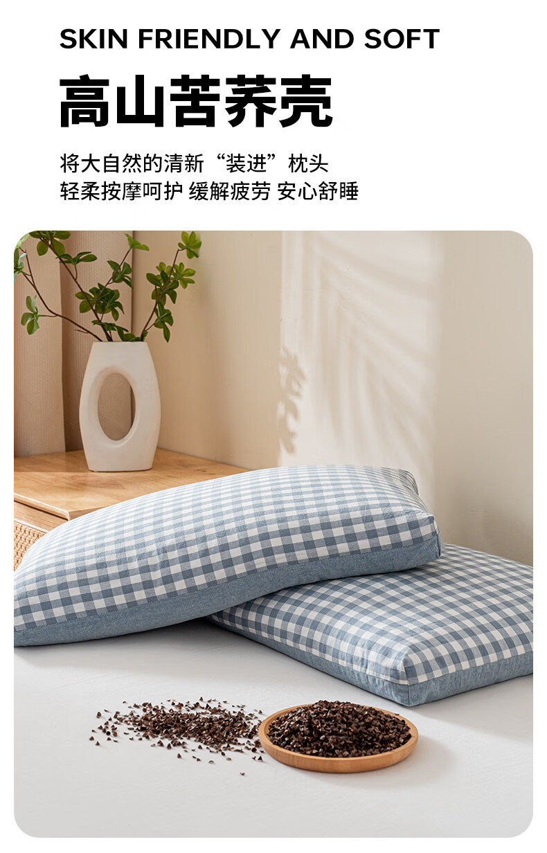 名创优品(MINISO)全棉荞麦壳枕头一对装 成人枕护颈枕芯宿舍学生枕单人小枕头 蓝小格+浅蓝【一只装】 35cm*55cm