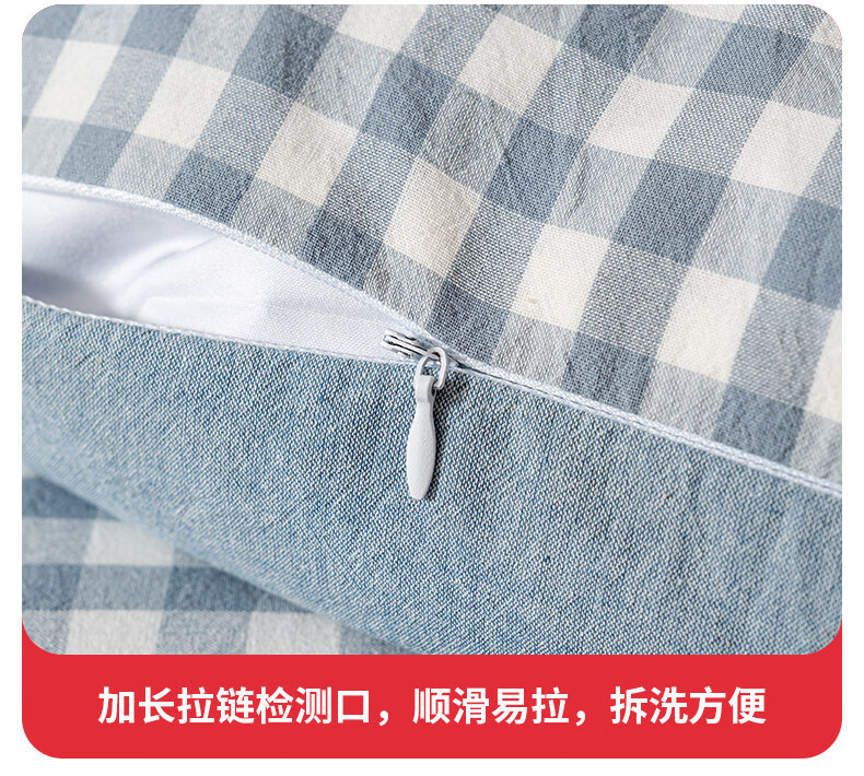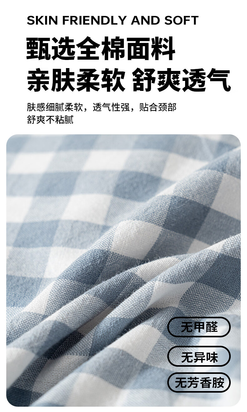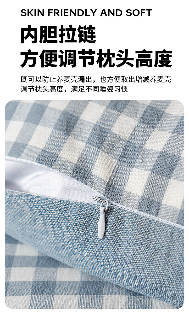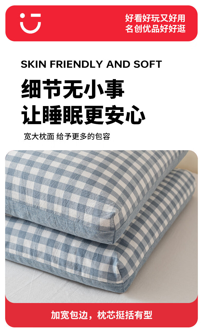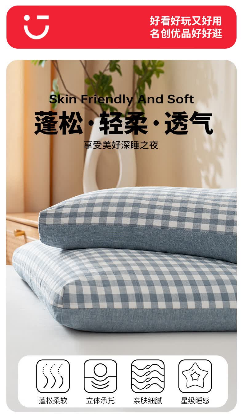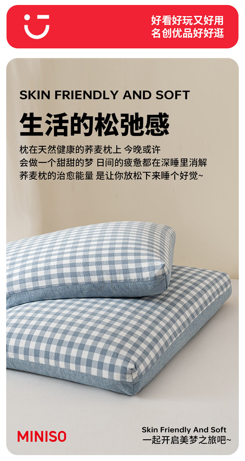 名创优品(MINISO)全棉荞麦壳枕头一对装 成人枕护颈枕芯宿舍学生枕单人小枕头 蓝小格+浅蓝【一只装】 35cm*55cm