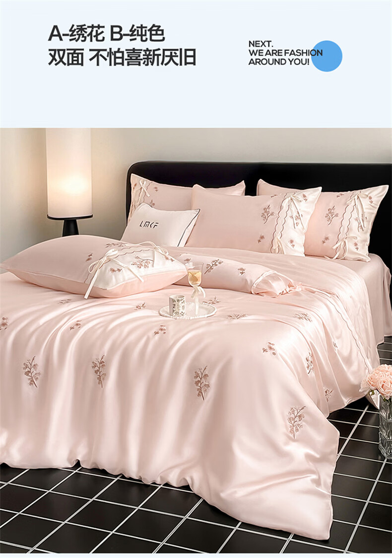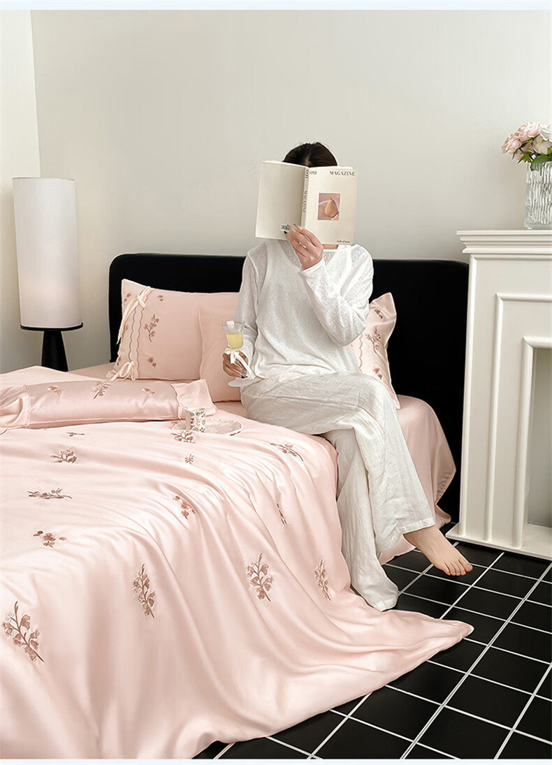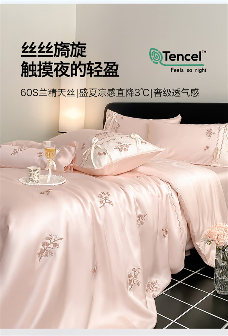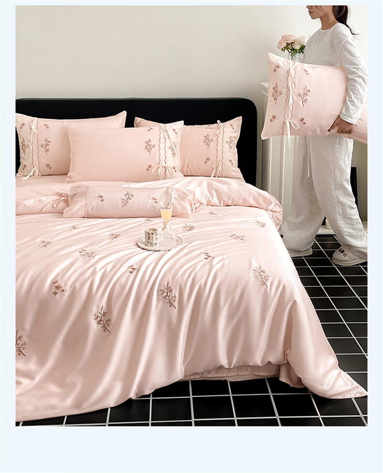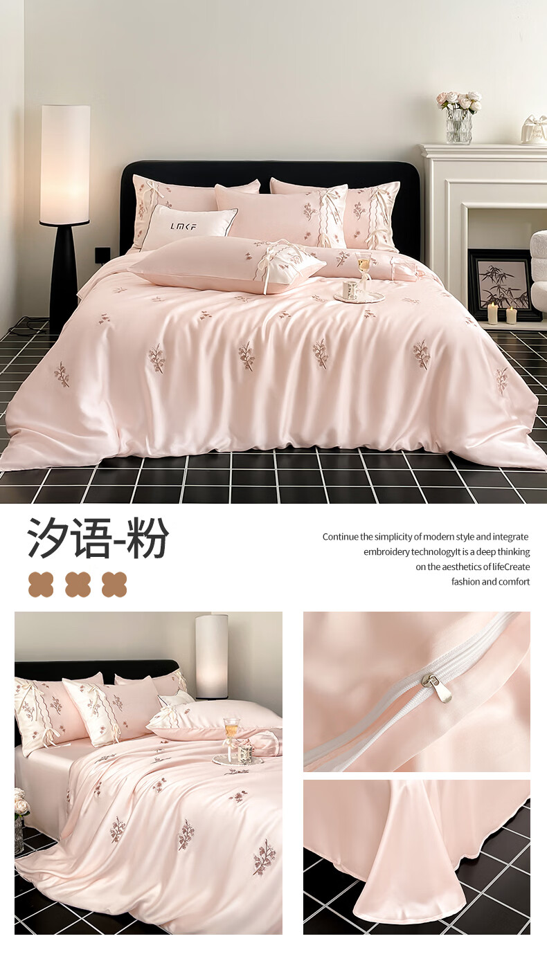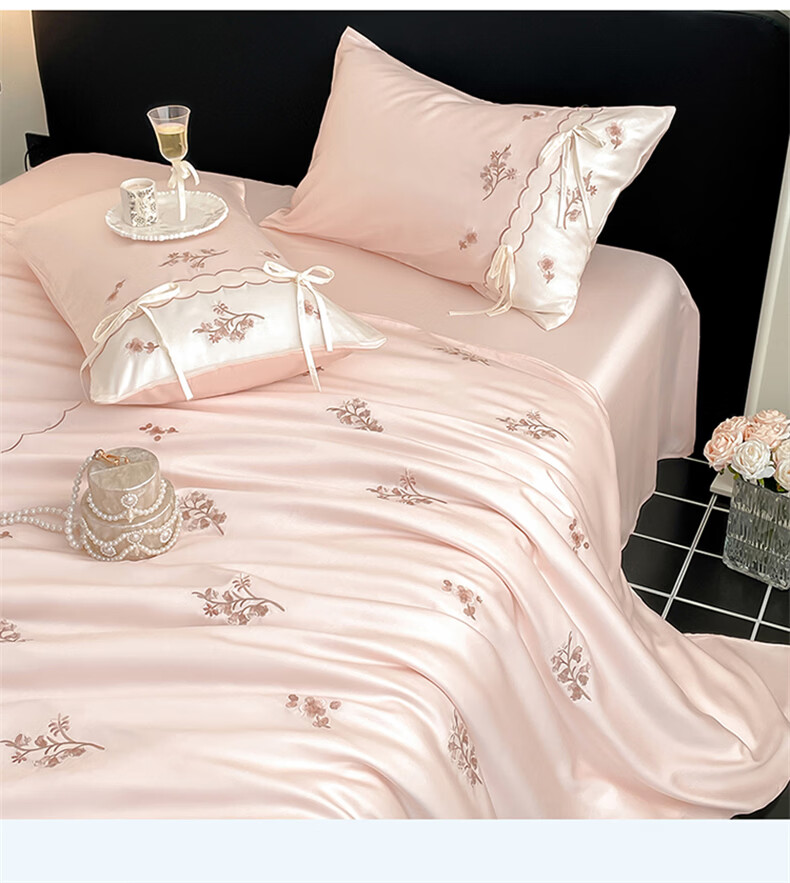 无印良品刺绣天丝四件套高端轻奢高级感夏季床单被套家用亲肤裸睡床上用品 汐语-粉 【裸睡级清凉 告别夏日黏腻】 1.8m 床单款 四件套-被套200x230cm