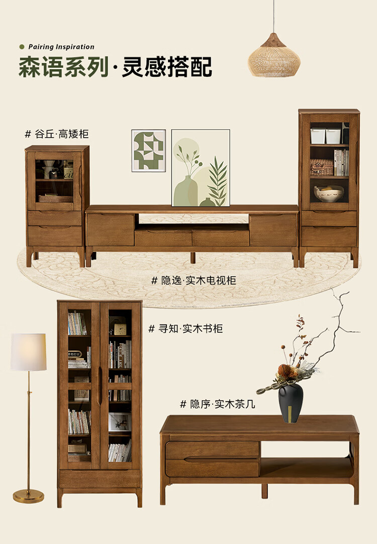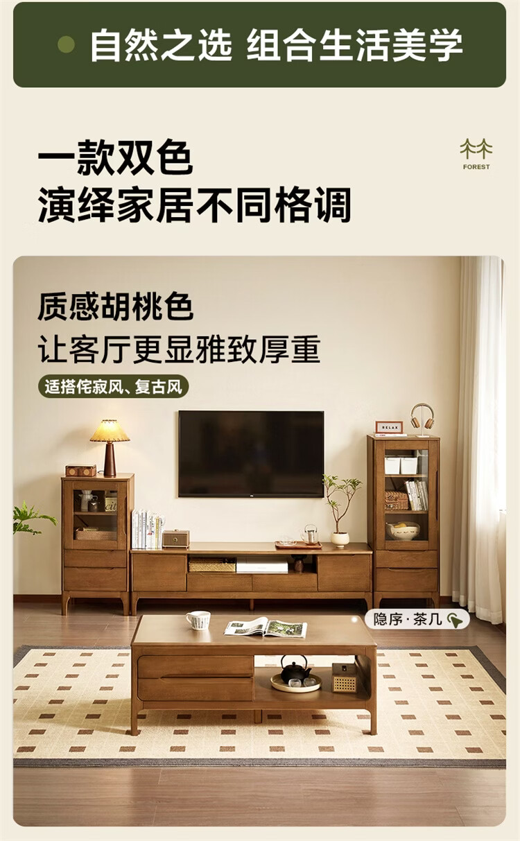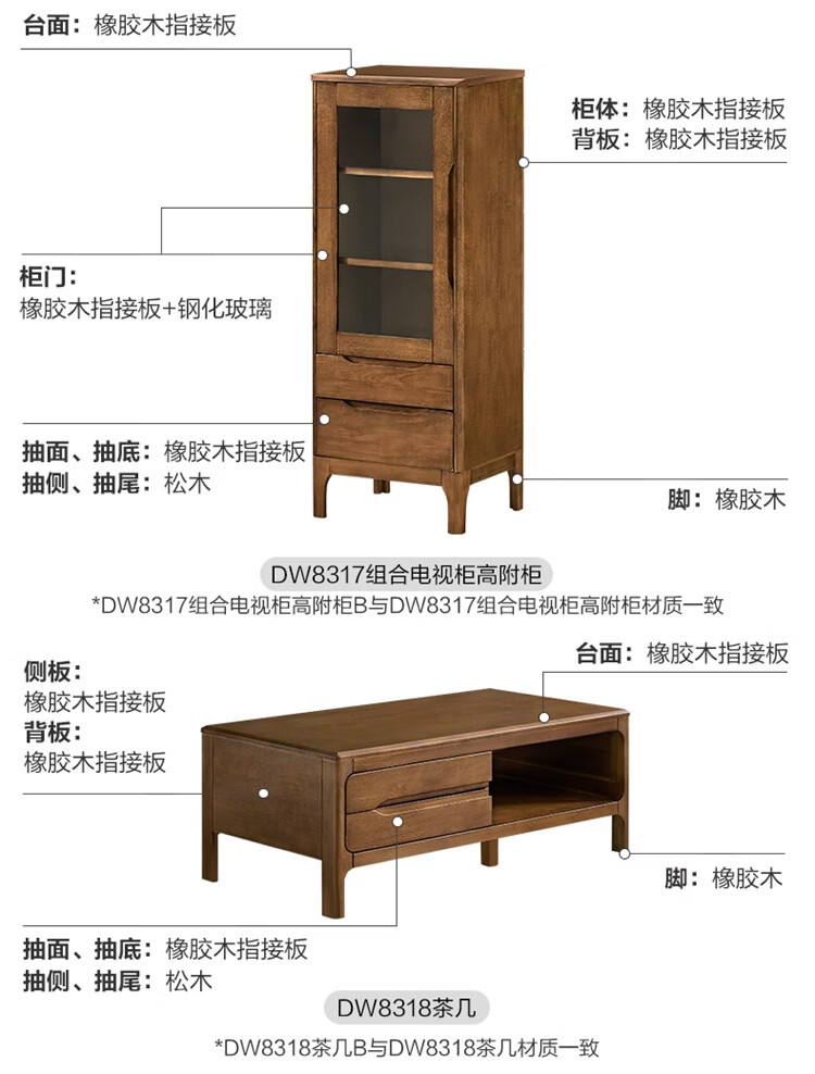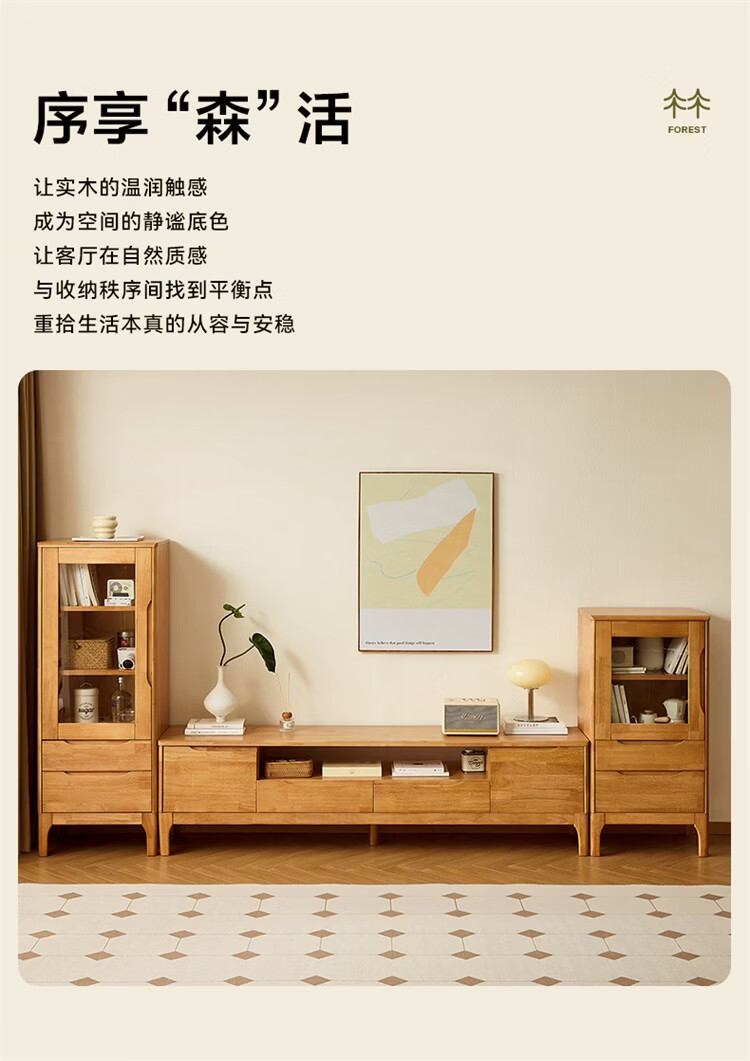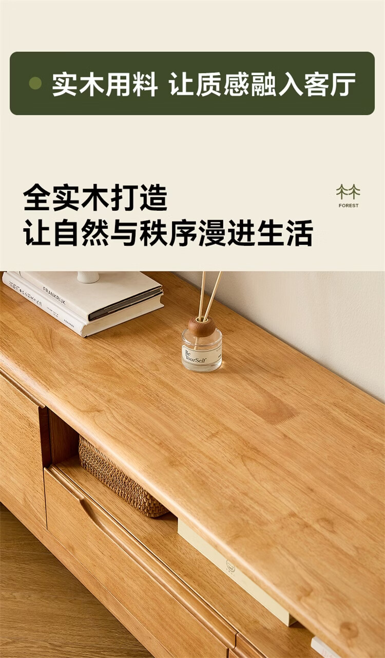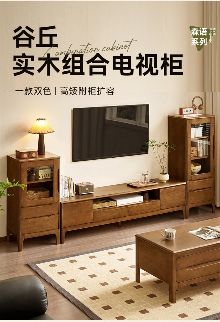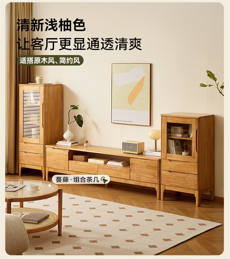 全友家居原木风实木家具客厅电视柜沙发边柜组合储物矮柜收纳展示柜 【浅柚色 | 橡胶木】茶几+电视柜主柜+矮附柜+高附柜