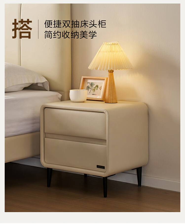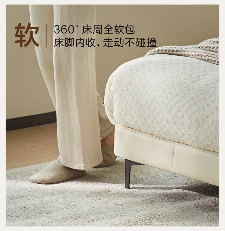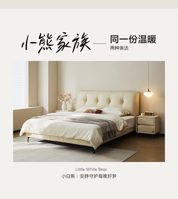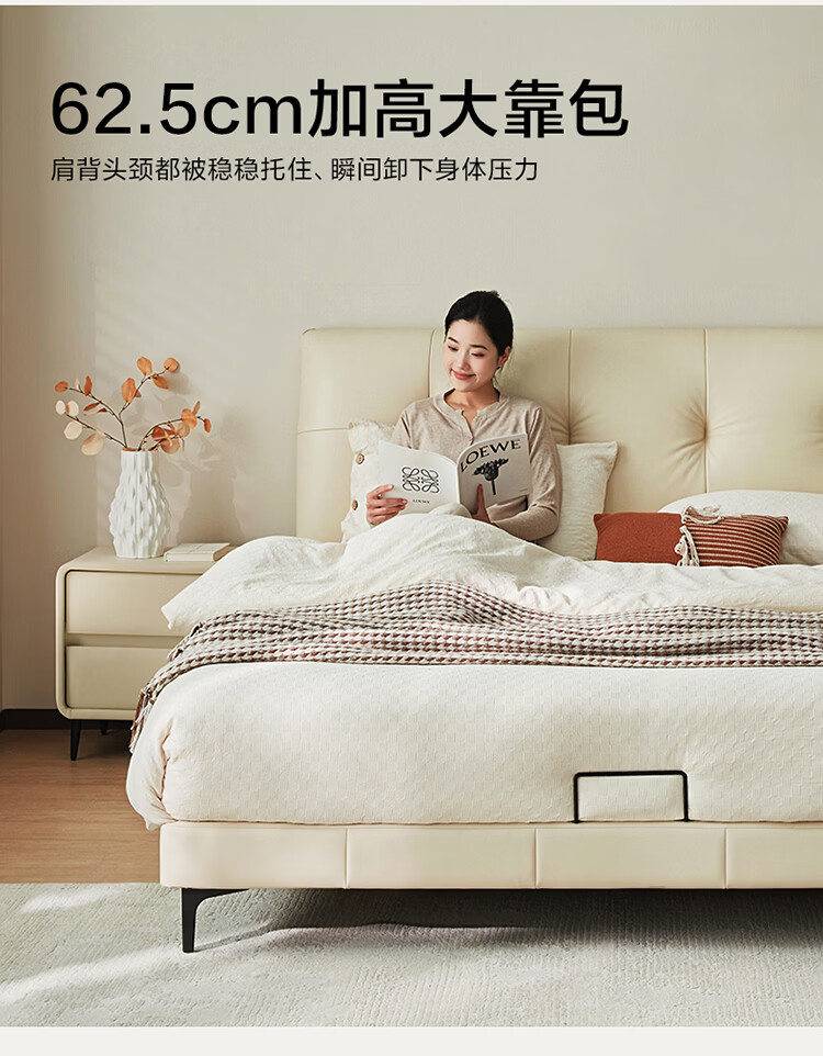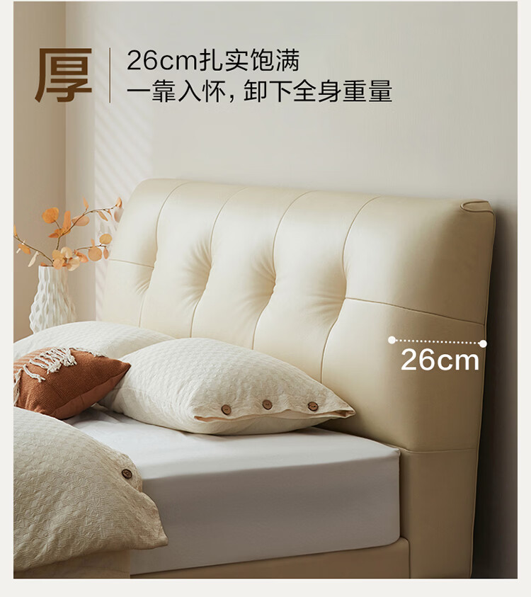 全友家居现代简约头层牛皮2026新款真皮床主卧室高脚双人床和床垫组合 【牛皮 | 奶油白】高脚款 1.8米x2米 床+床头柜*2
