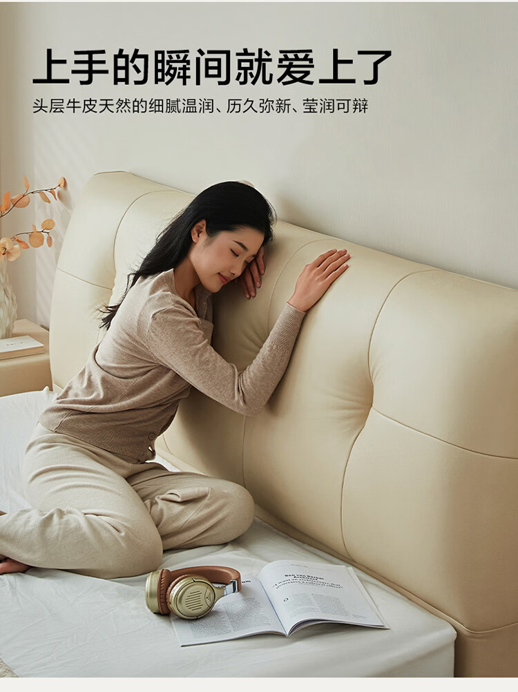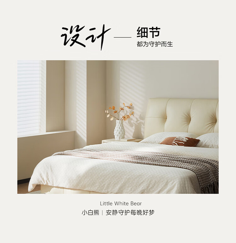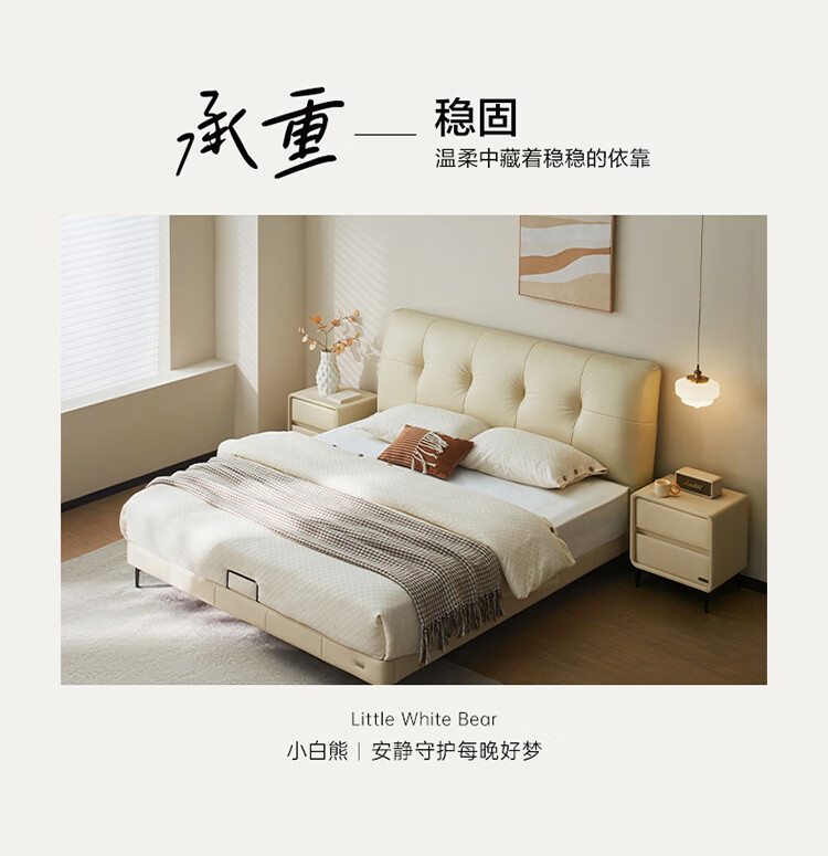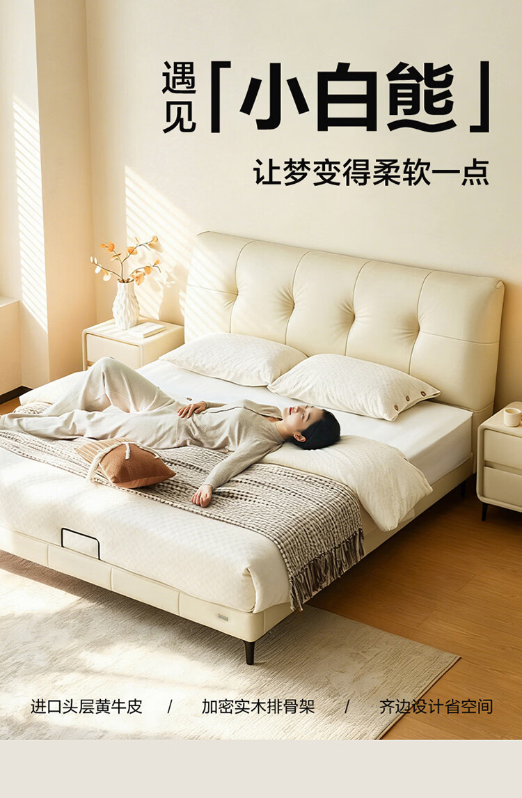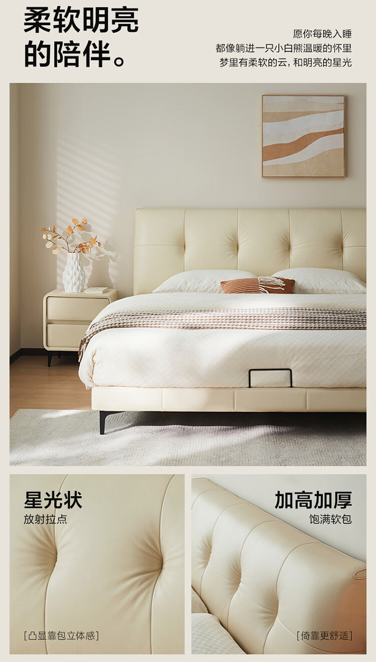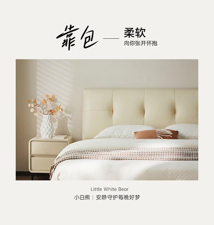 CBD家居现代简约真皮软包床双人主卧大床奶油风婚床头层牛皮甜心悬浮 甜心悬浮-奶油白单床 卷帘排骨架 1500*2000