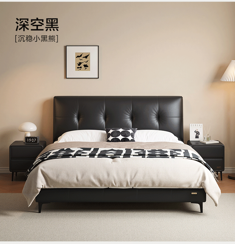 CBD家居现代简约真皮软包床双人主卧大床奶油风婚床头层牛皮甜心悬浮 甜心悬浮-水墨黑单床 卷帘排骨架 1800*2000