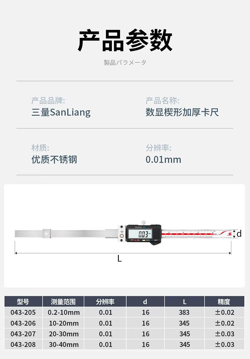 三量(sanliang)正品三量楔形加厚数显卡尺不锈钢塞尺尖头间隙尺楔形塞尺缝隙测量 加厚型043-205 0.2-10mm 无规格