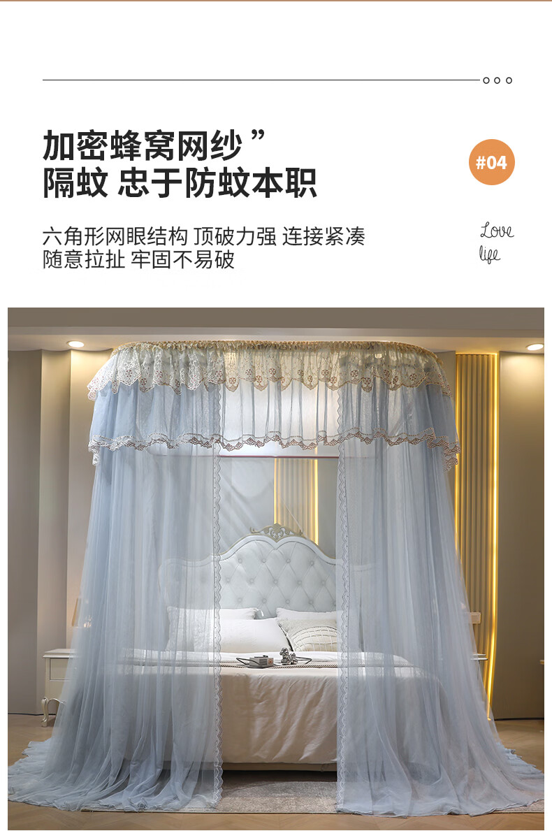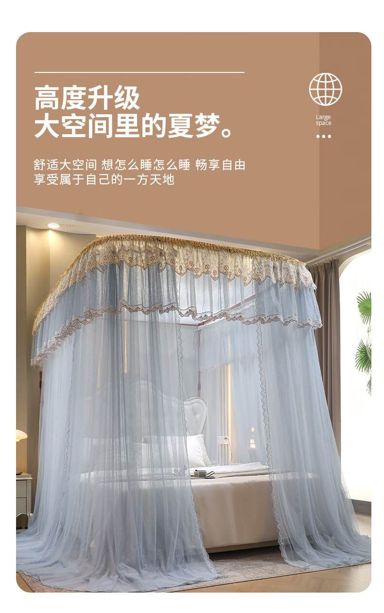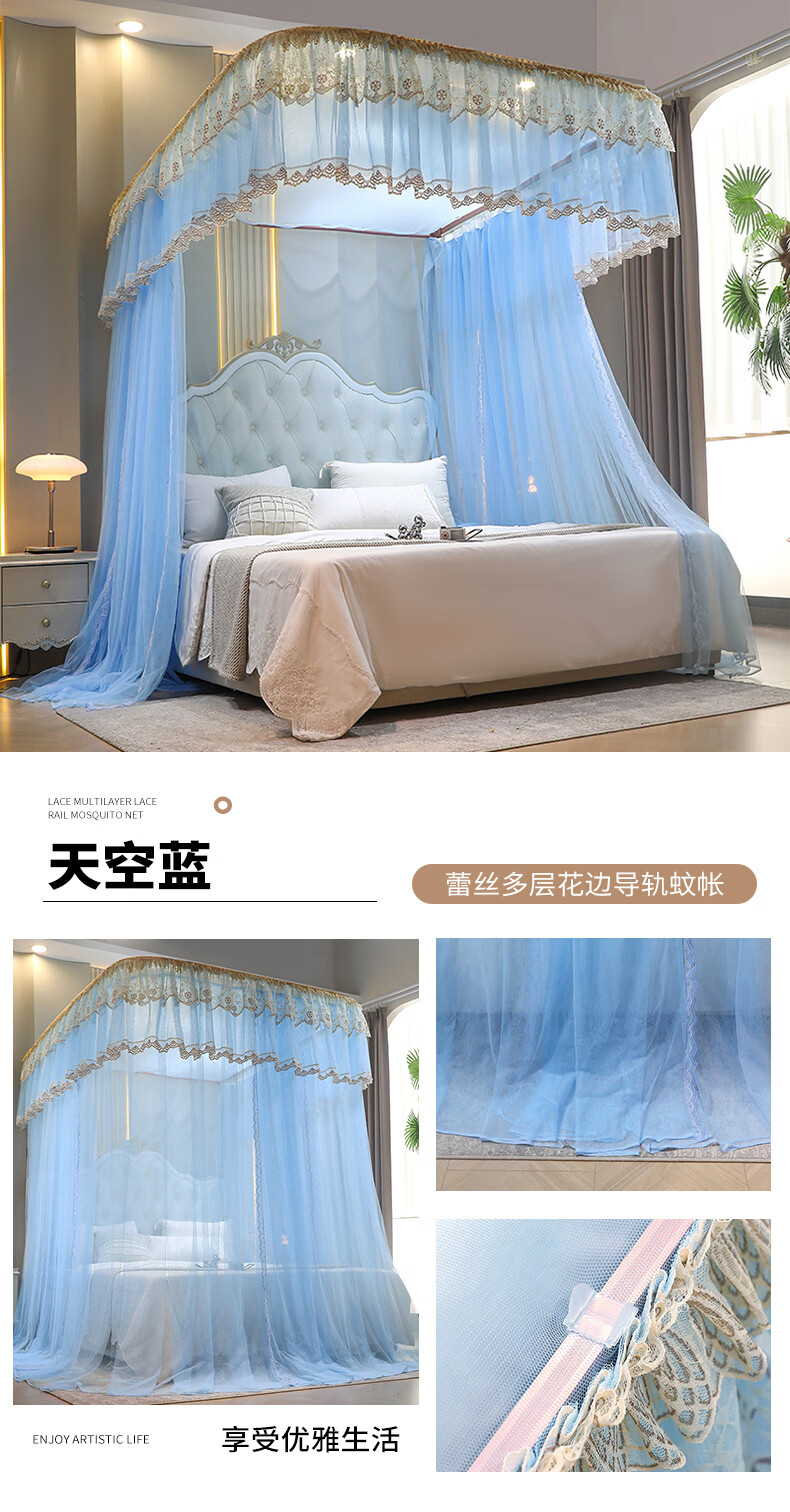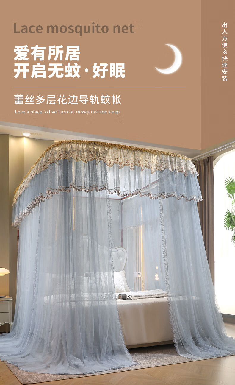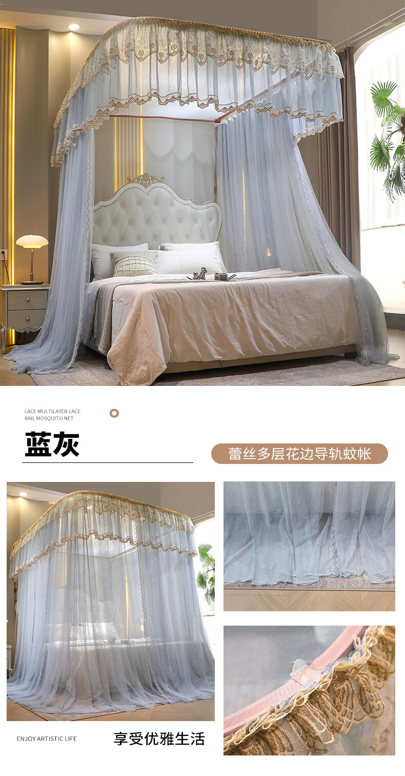 无印良品公主风u型导轨蚊帐1.8x2米家用高级感伸缩一体式防蚊床上落地蚊帐 蓝灰【加密帐纱+加粗支架】 120cm*200cm*170cm 【尼龙弯头】