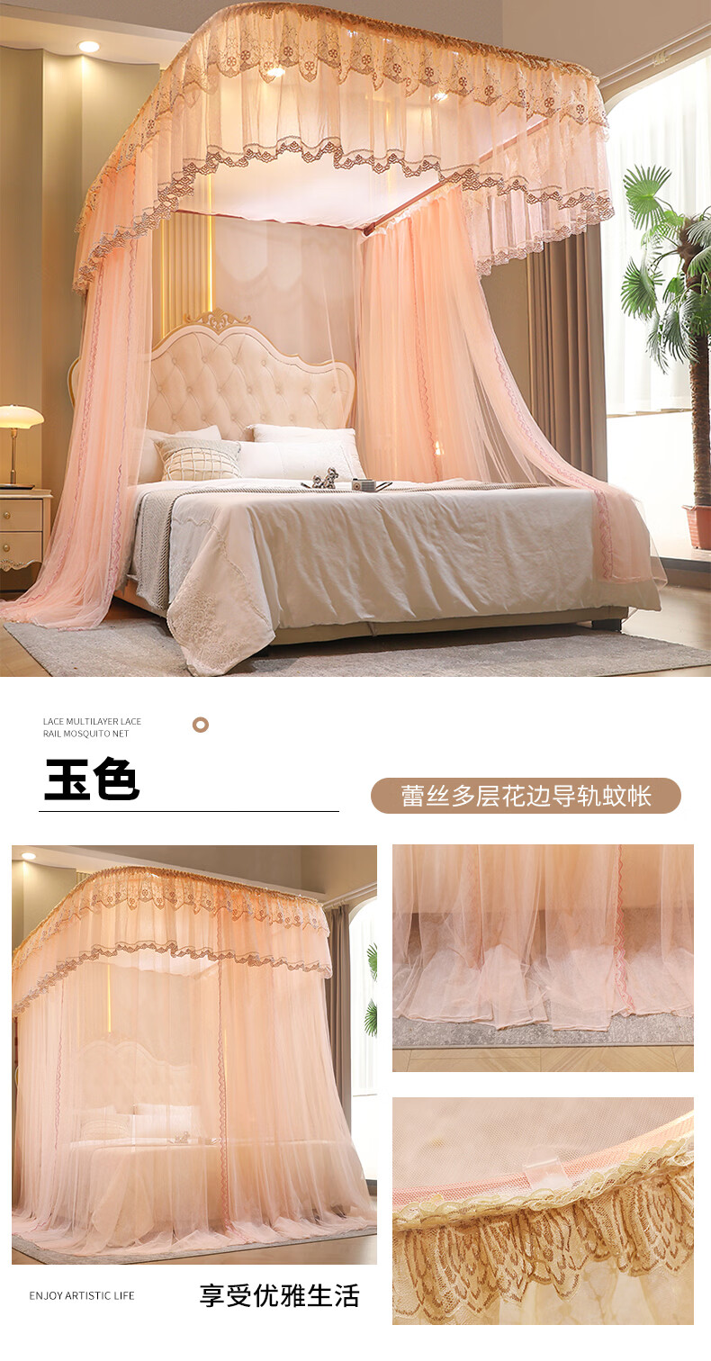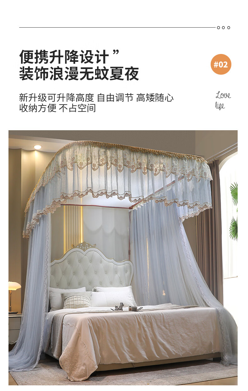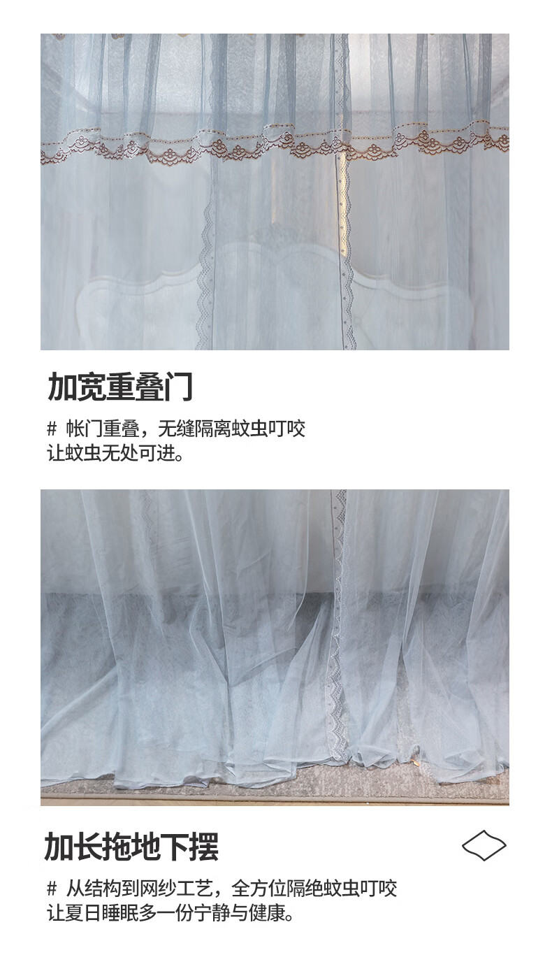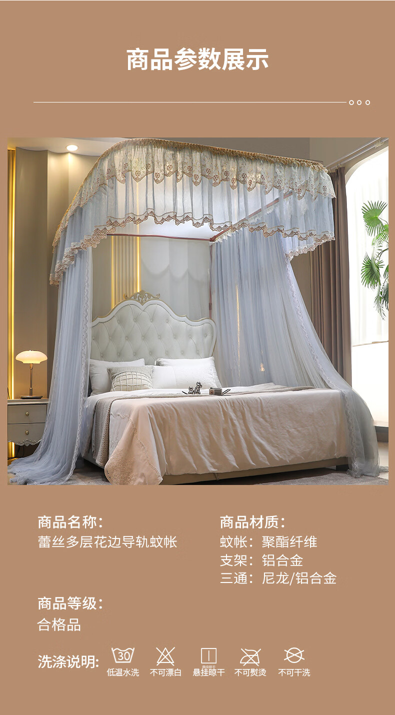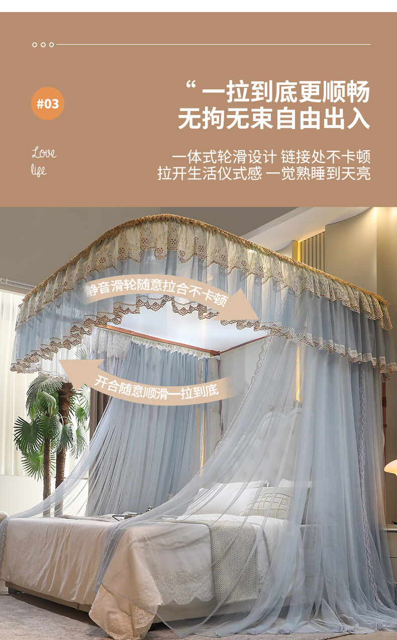 无印良品公主风u型导轨蚊帐1.8x2米家用高级感伸缩一体式防蚊床上落地蚊帐 蓝灰【加密帐纱+加粗支架】 120cm*200cm*170cm 【尼龙弯头】