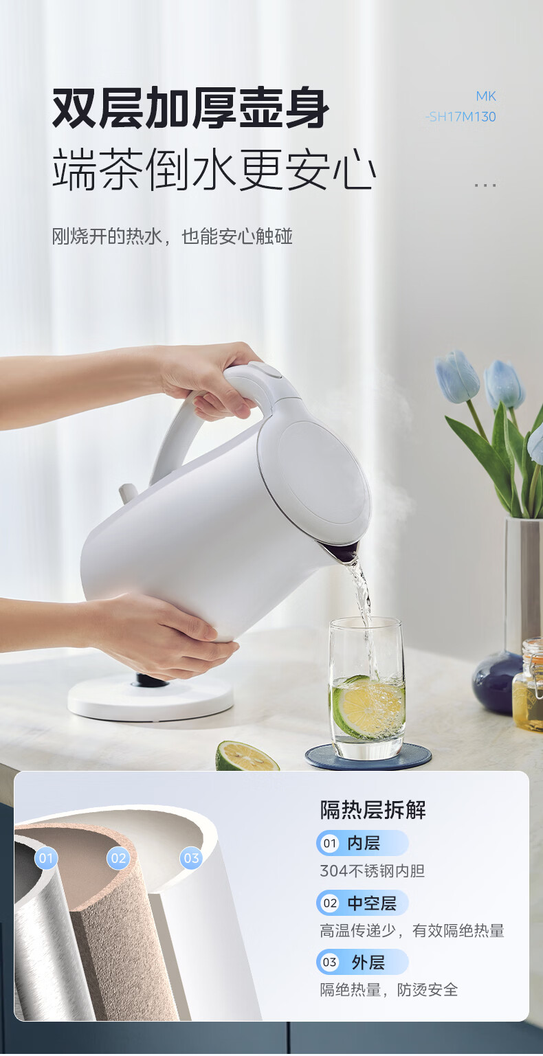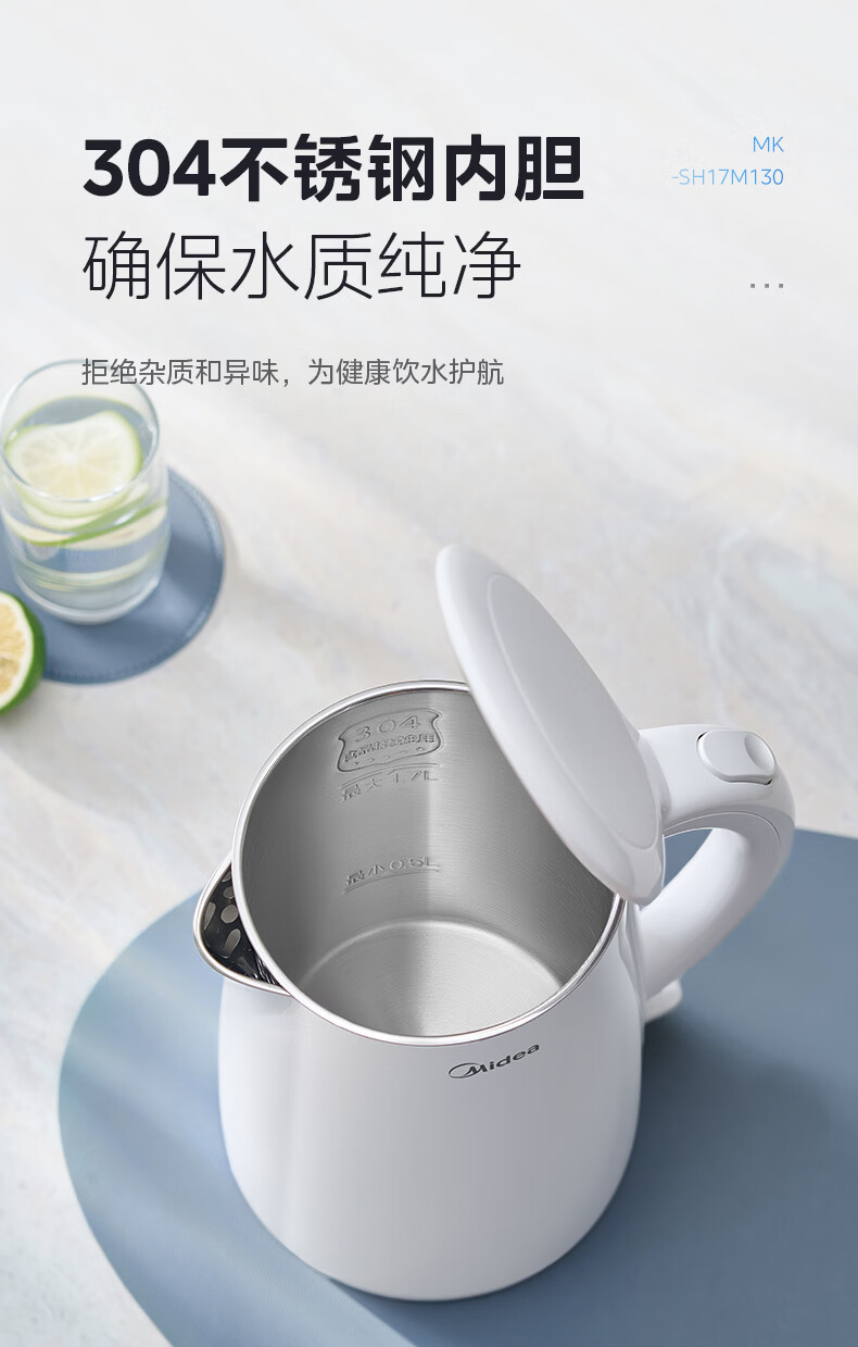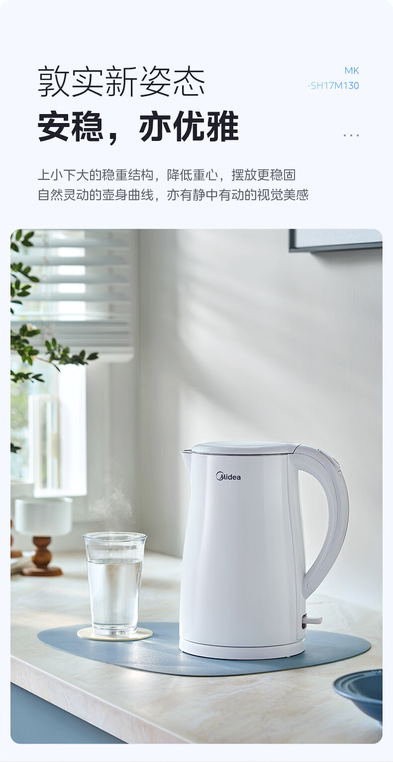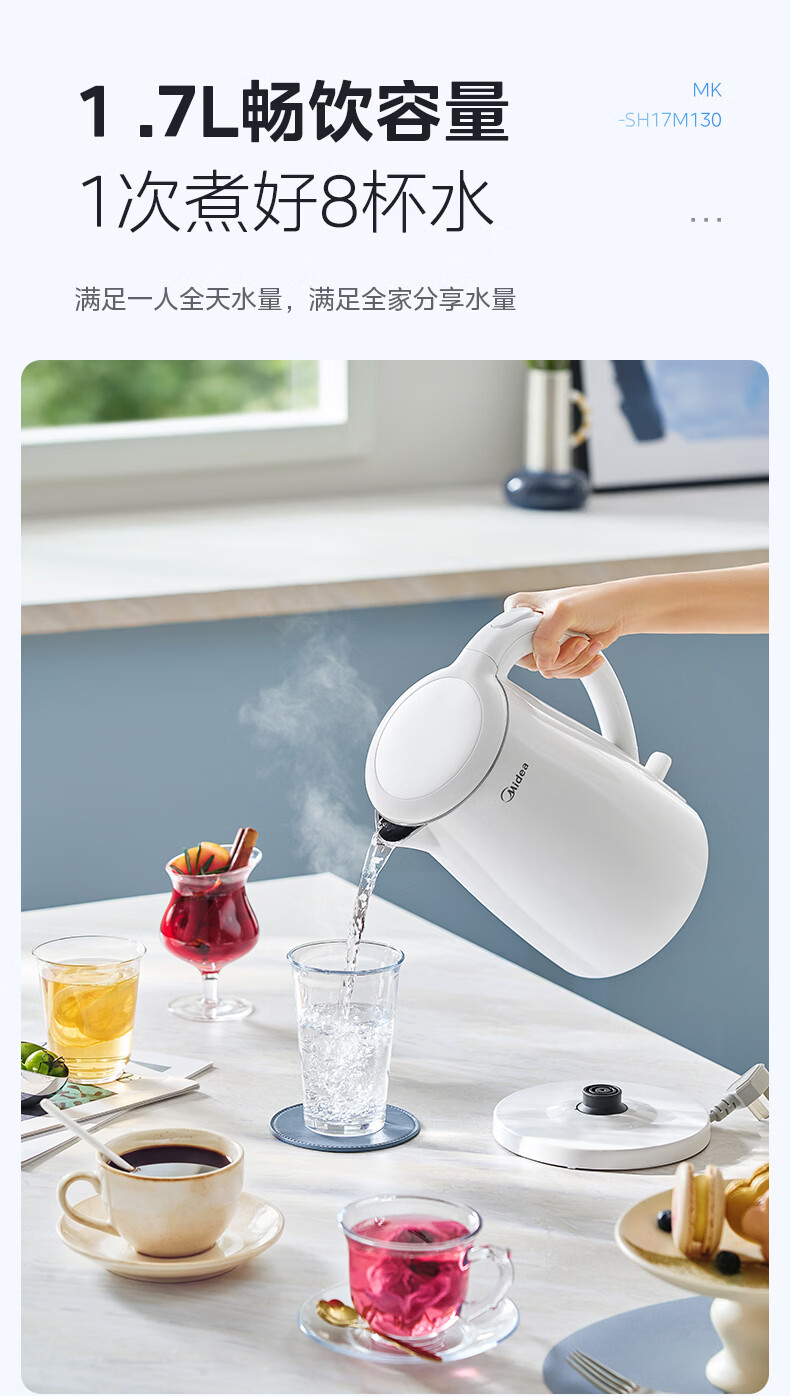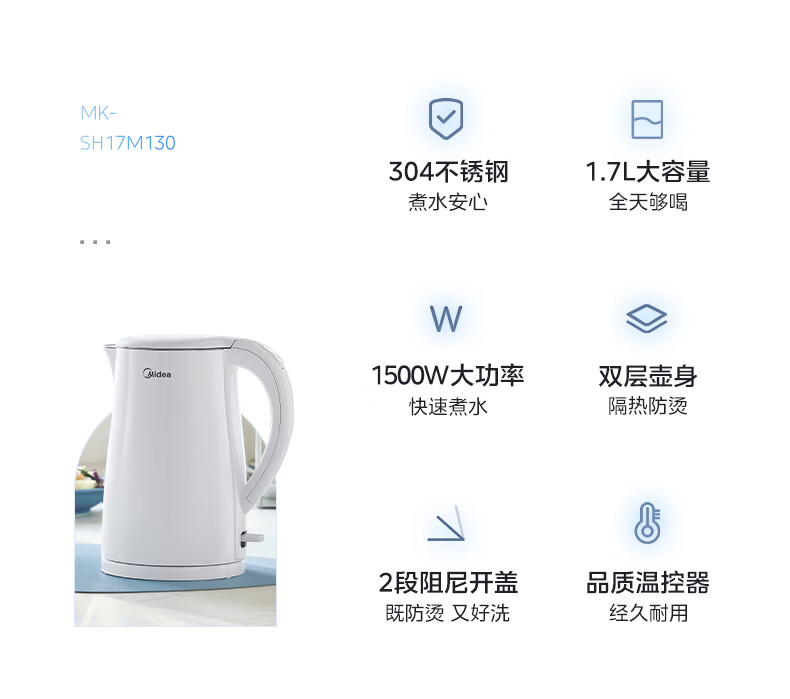 美的(Midea)电热水壶烧水壶1.7L304不锈钢0涂层双层隔热自动断电1500W养生冲奶泡茶 MK-SH17M130