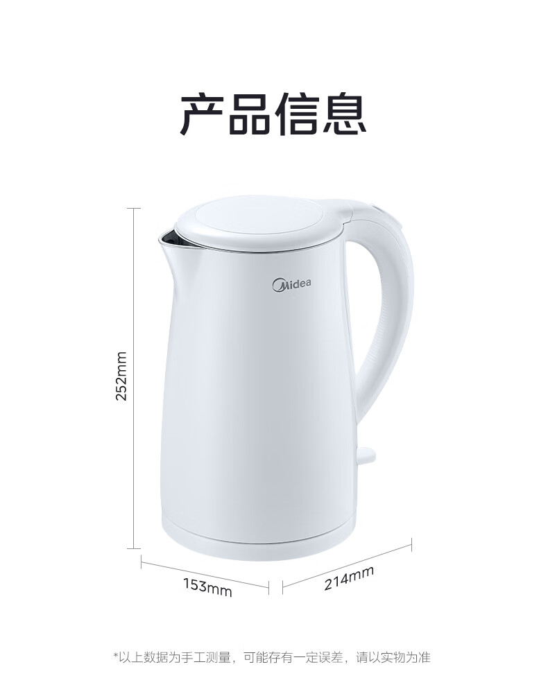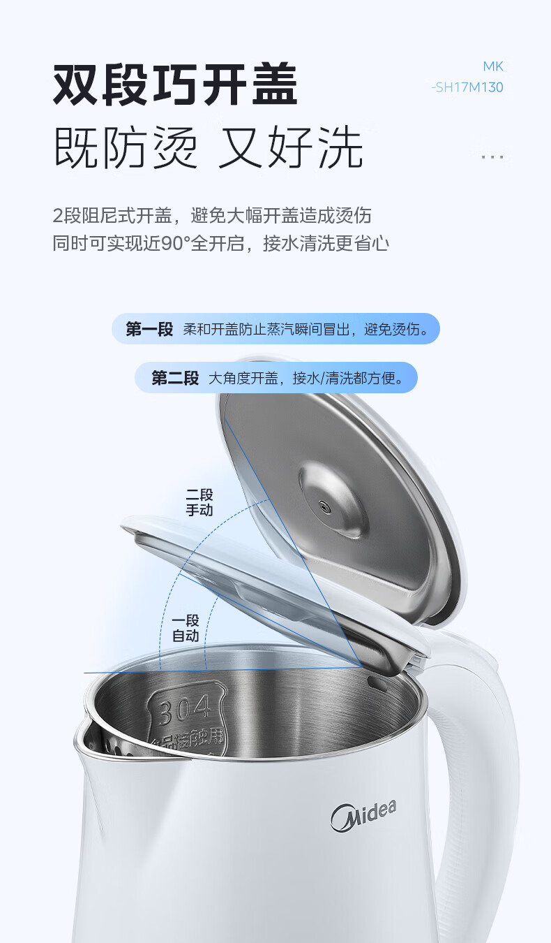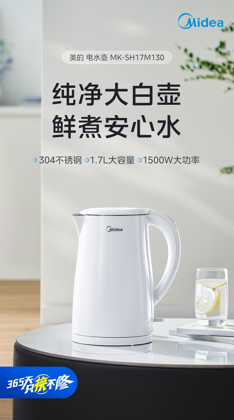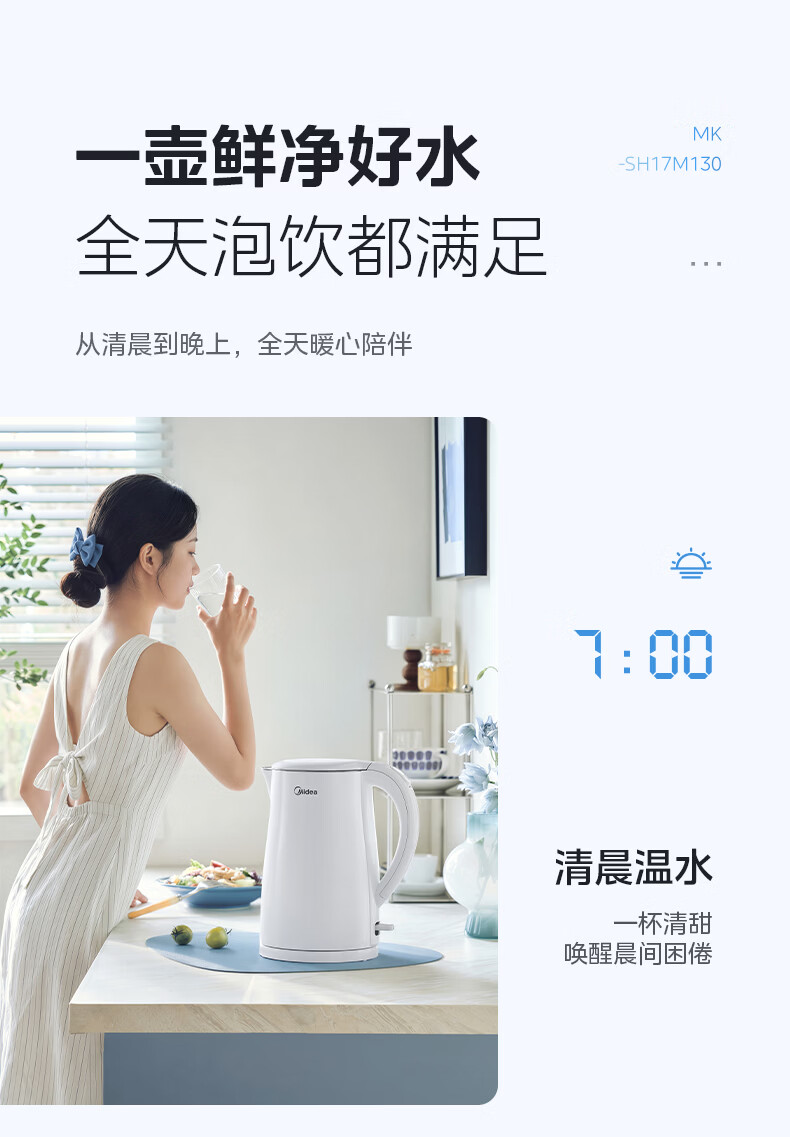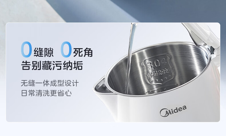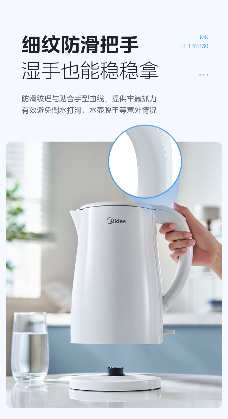 美的(Midea)电热水壶烧水壶1.7L304不锈钢0涂层双层隔热自动断电1500W养生冲奶泡茶 MK-SH17M130