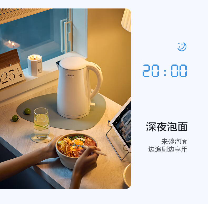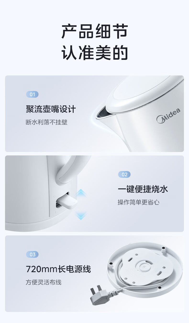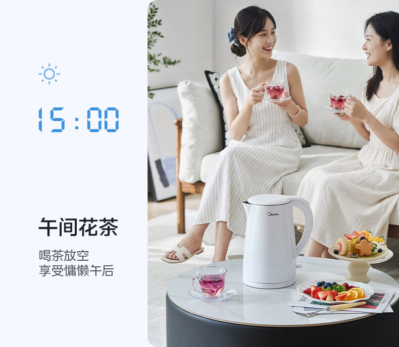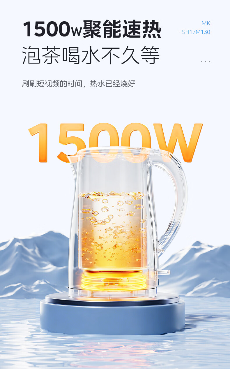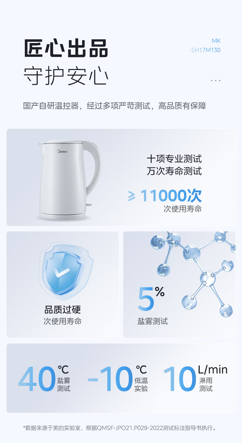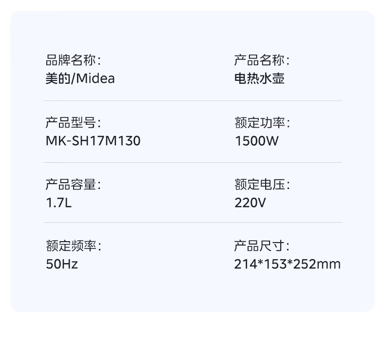 美的(Midea)电热水壶烧水壶1.7L304不锈钢0涂层双层隔热自动断电1500W养生冲奶泡茶 MK-SH17M130