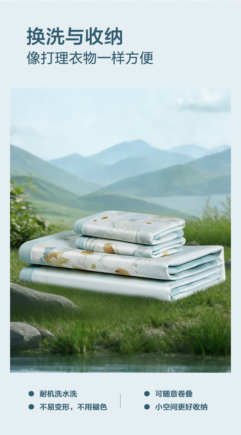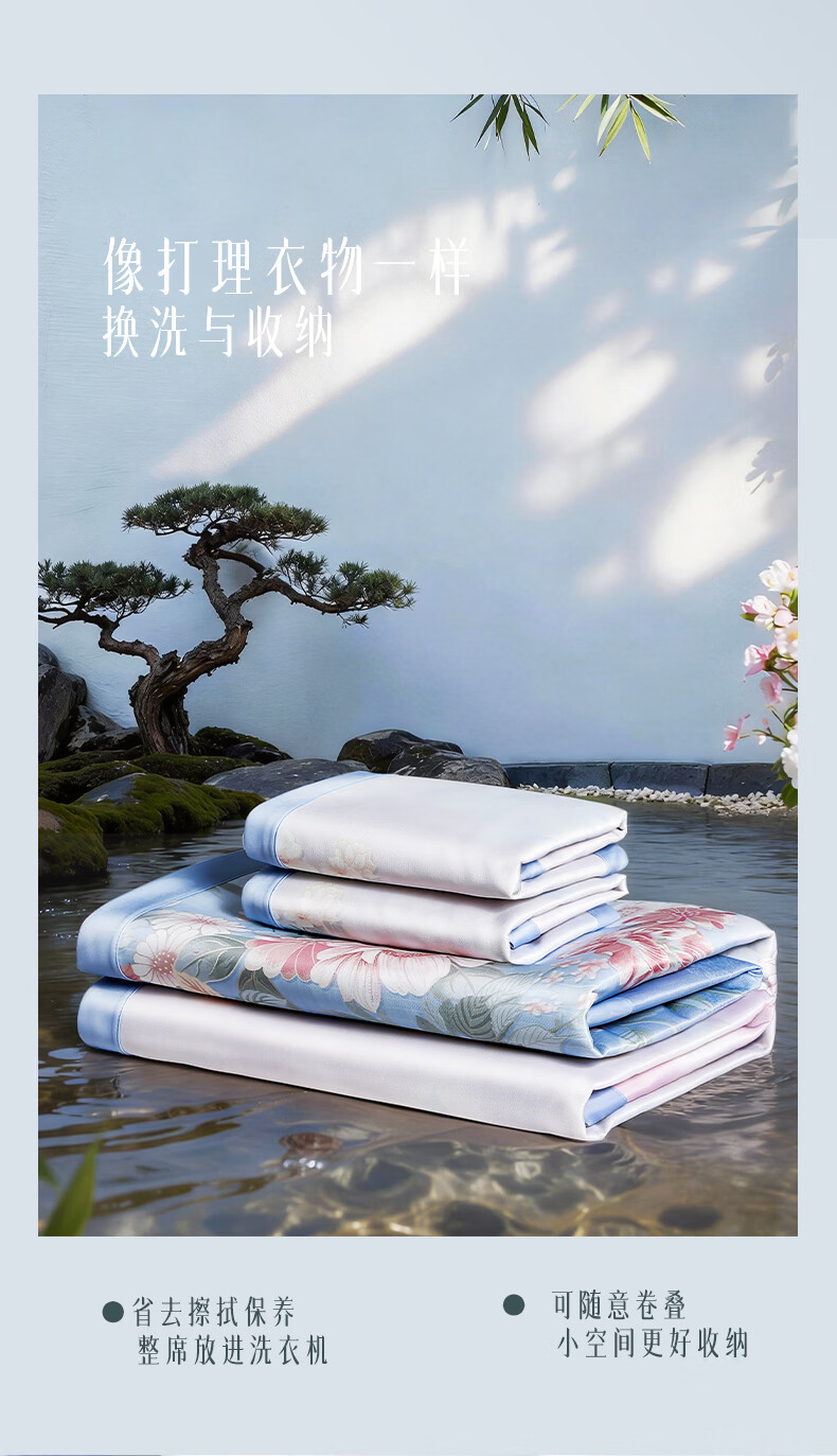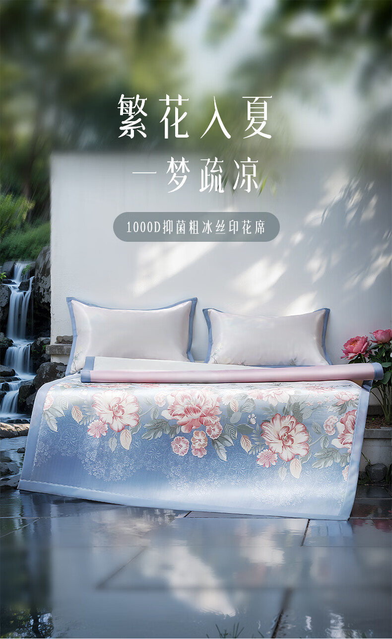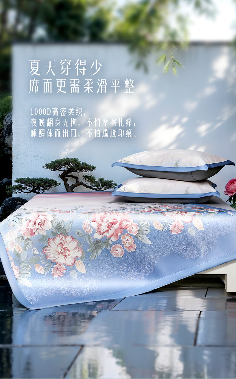 富安娜 凉席冰丝席1000D粗丝加密席子透气国风印花防滑可折叠空调席 【A类1000D粗冰丝印花 橡筋款】山河 1.2米 200cm*120cm 席子*1 枕套*1