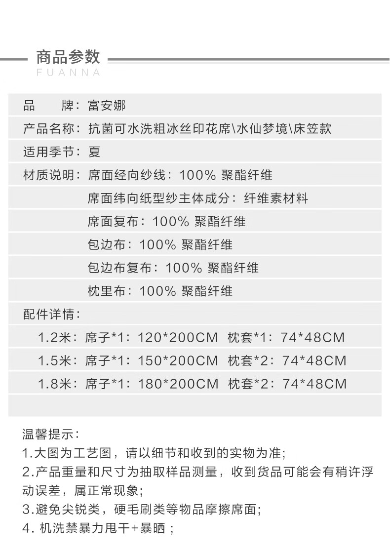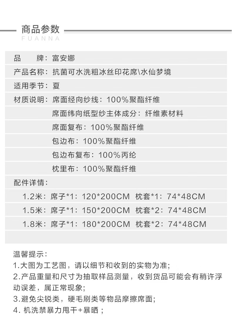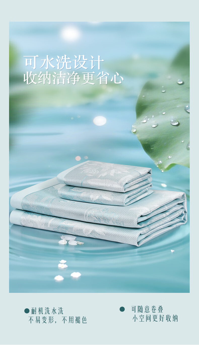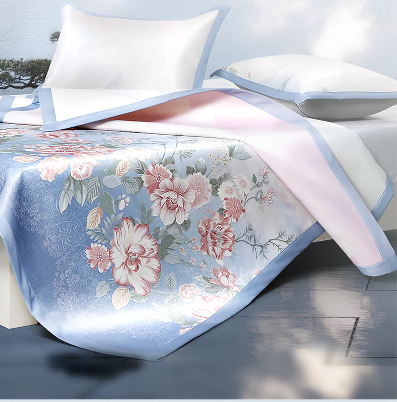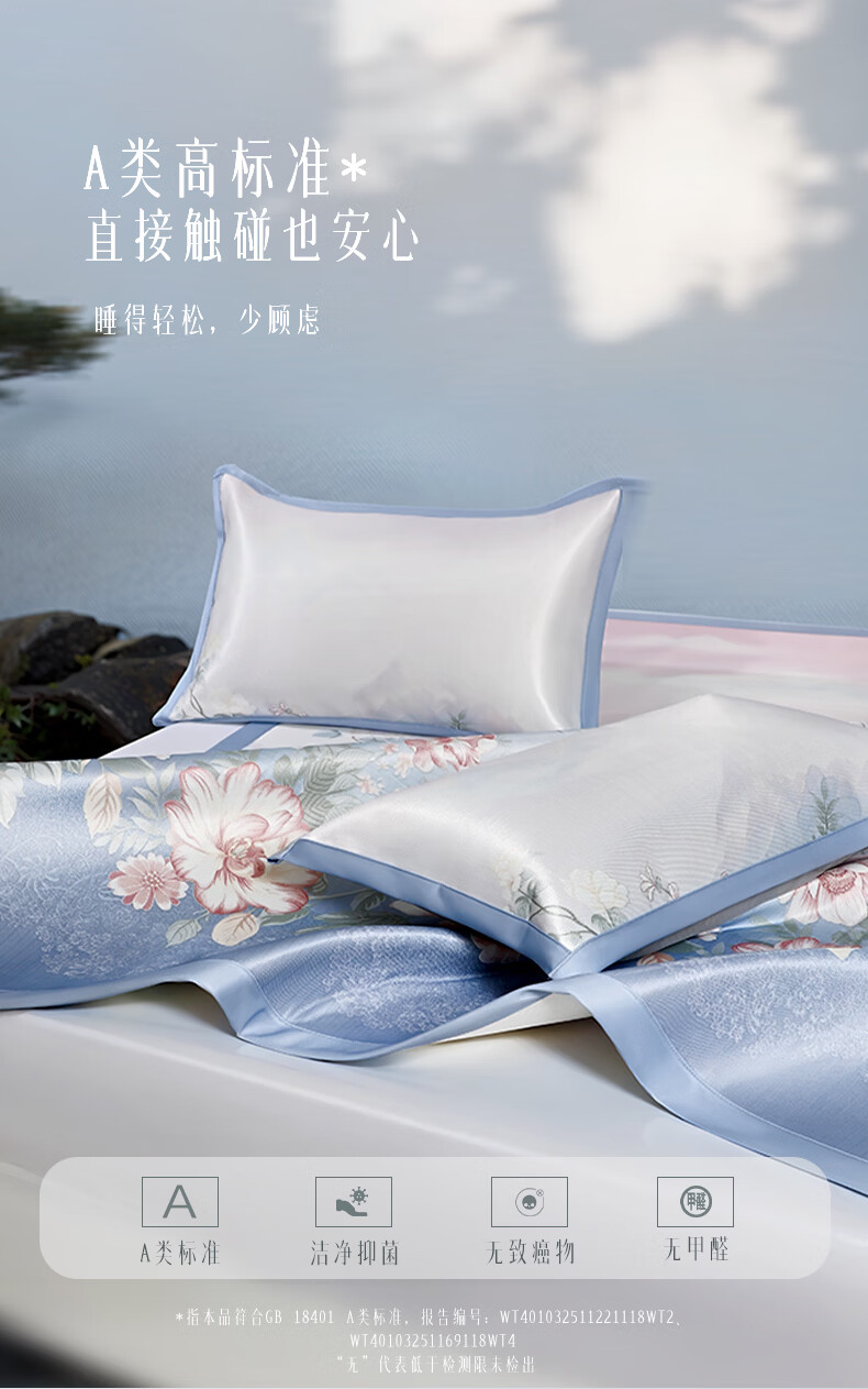 富安娜 凉席冰丝席1000D粗丝加密席子透气国风印花防滑可折叠空调席 【A类1000D粗冰丝印花 橡筋款】山河 1.2米 200cm*120cm 席子*1 枕套*1