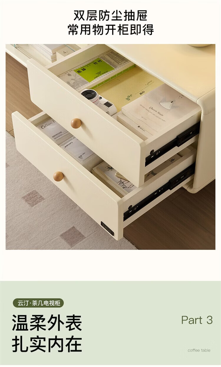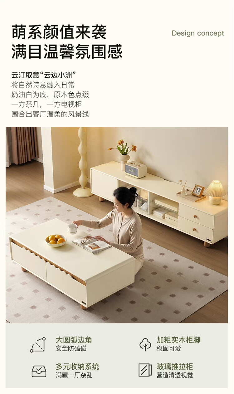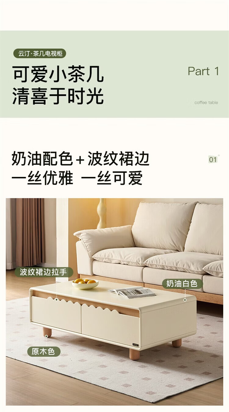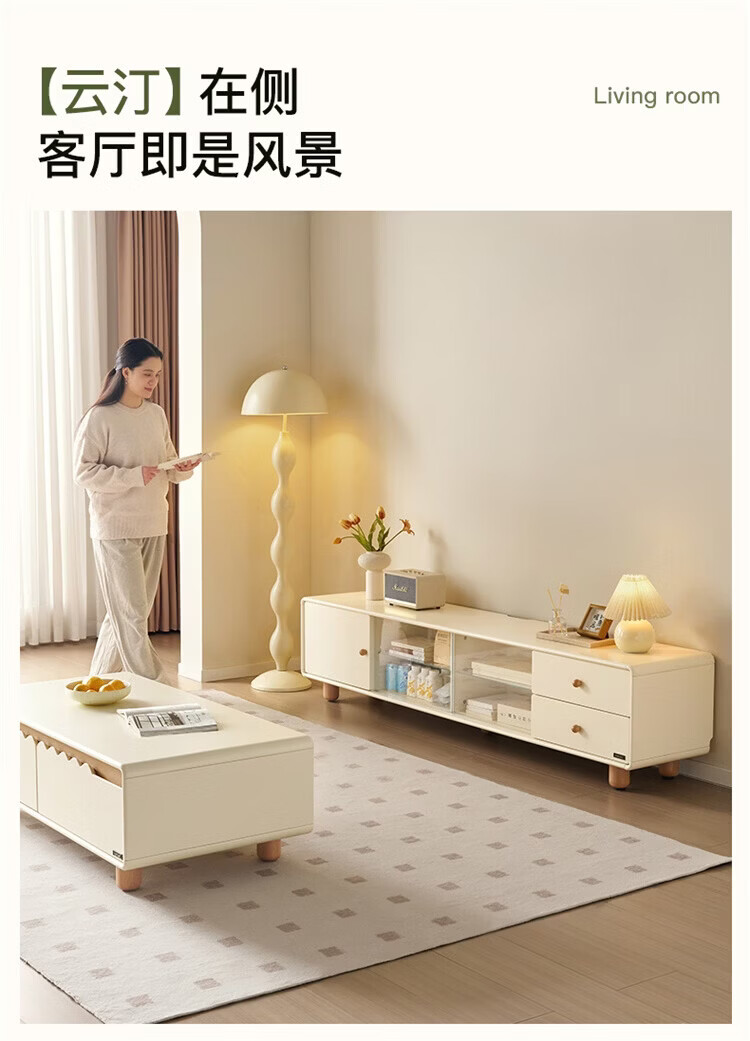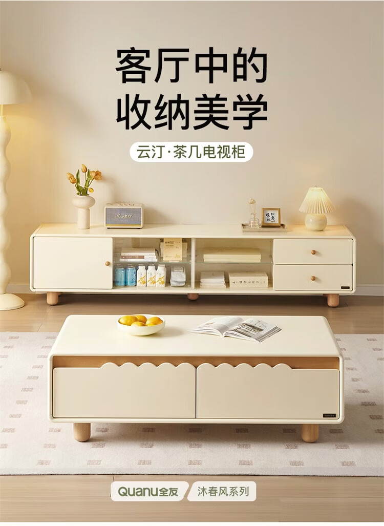 全友家居原木奶油风电视柜茶几组合家用加宽实木脚收纳储物桌置物柜 【奶油白+原木色】电视柜
