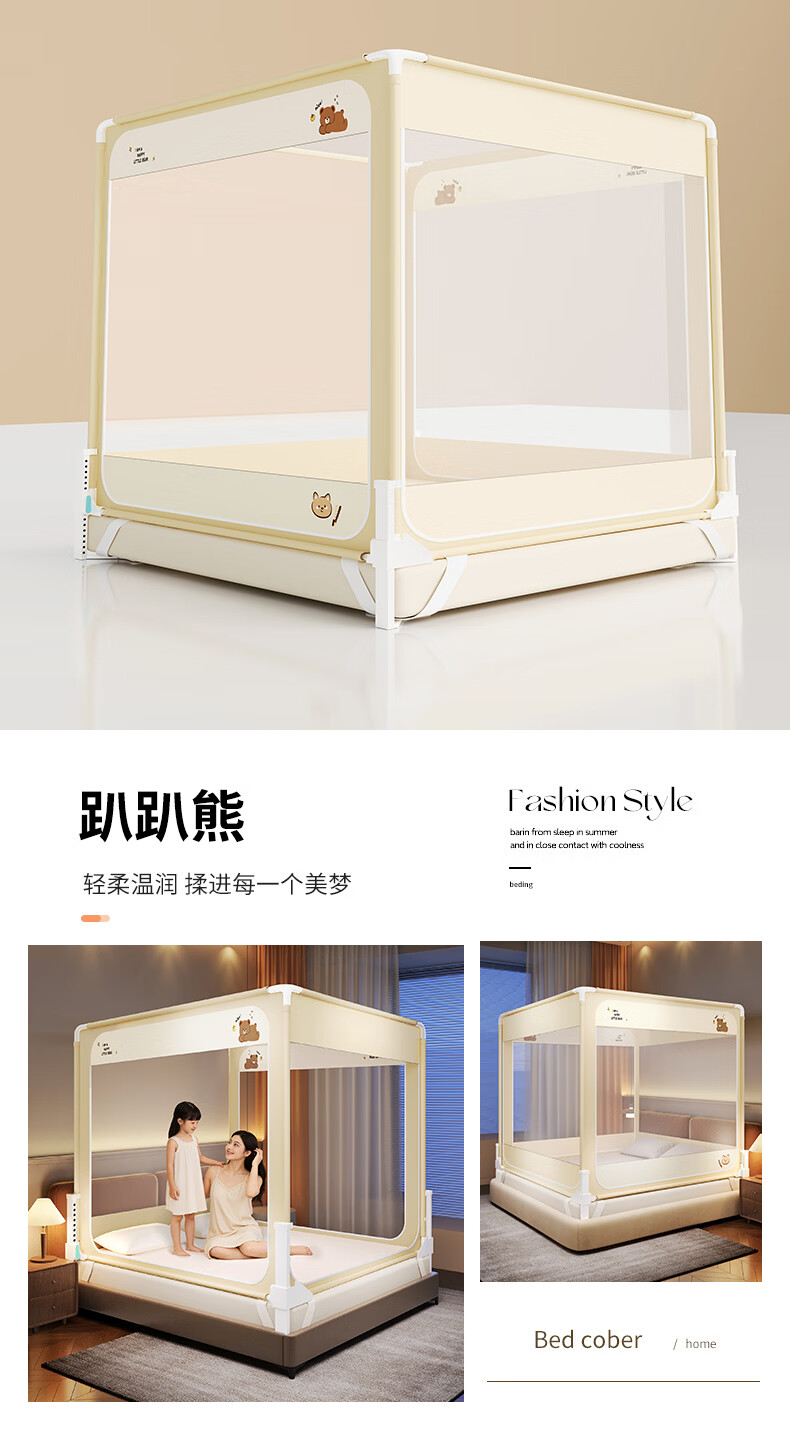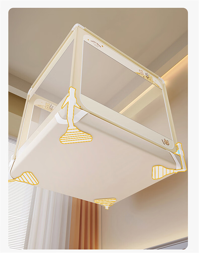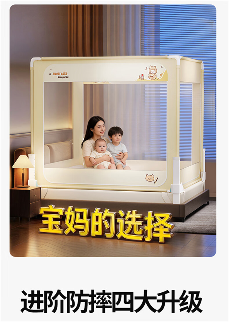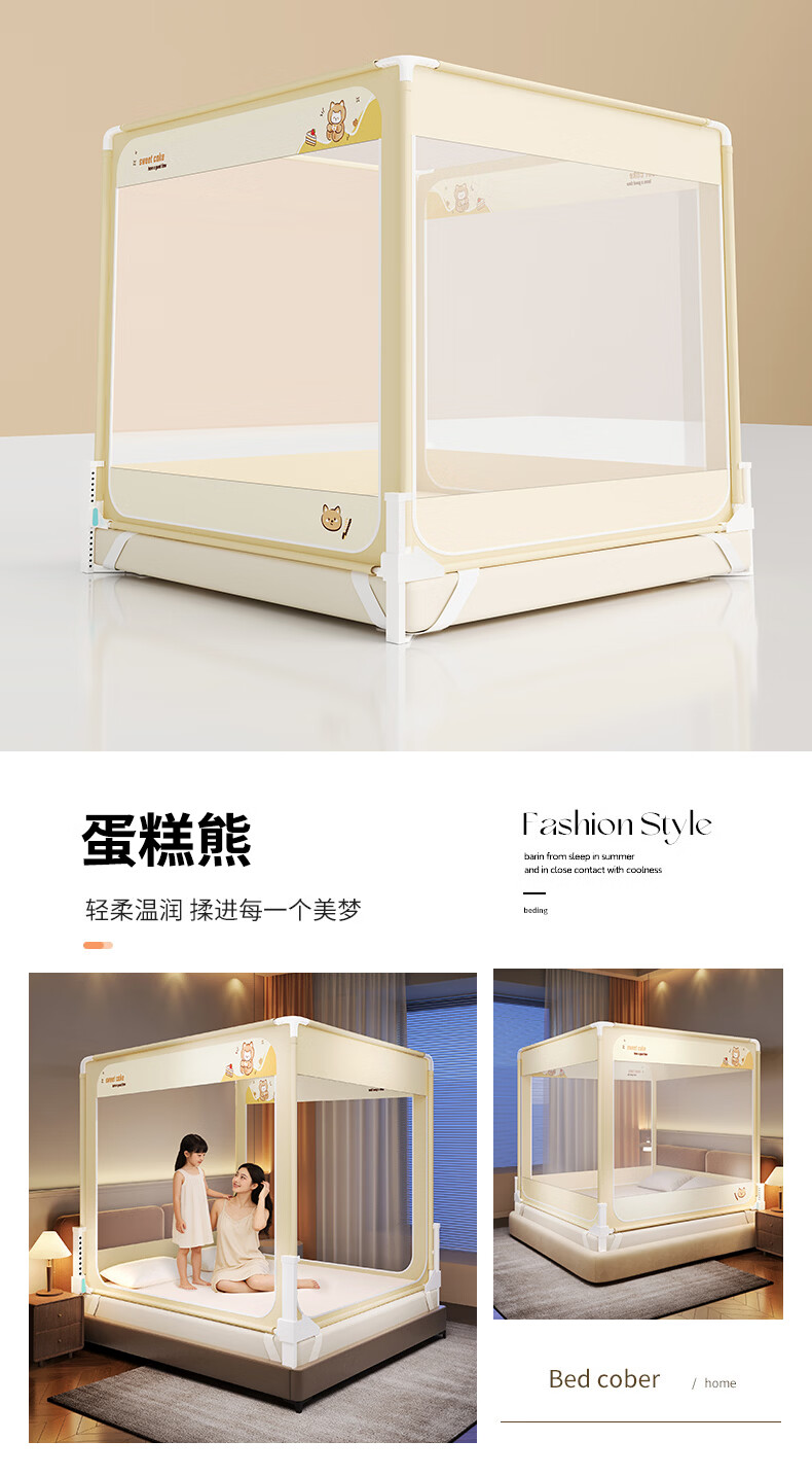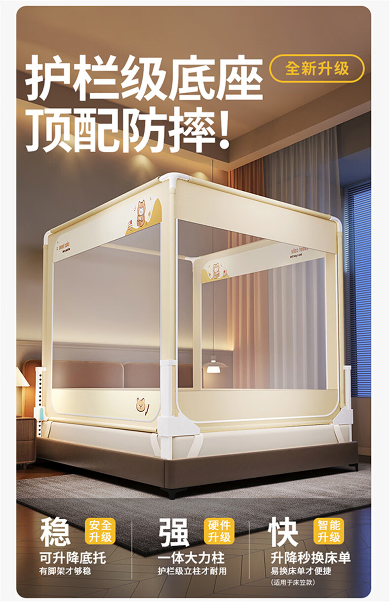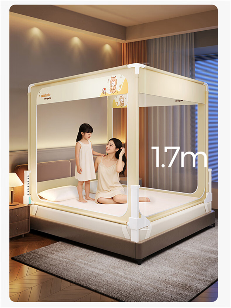 无印良品防摔蚊帐1.5米x2米家用卧室婴儿童防掉床可升降床围栏加固蚊帐架 蛋糕熊-全底【防摔防蚊+遮光顶】 180cm*200cm*170cm 【大力士压脚支架】