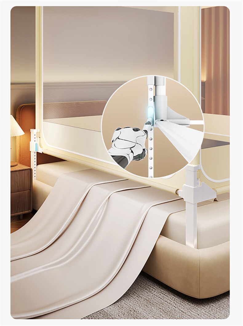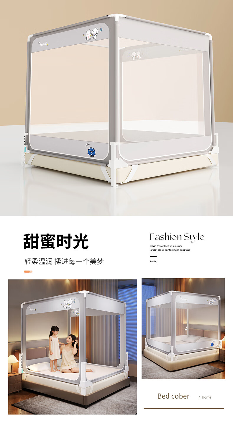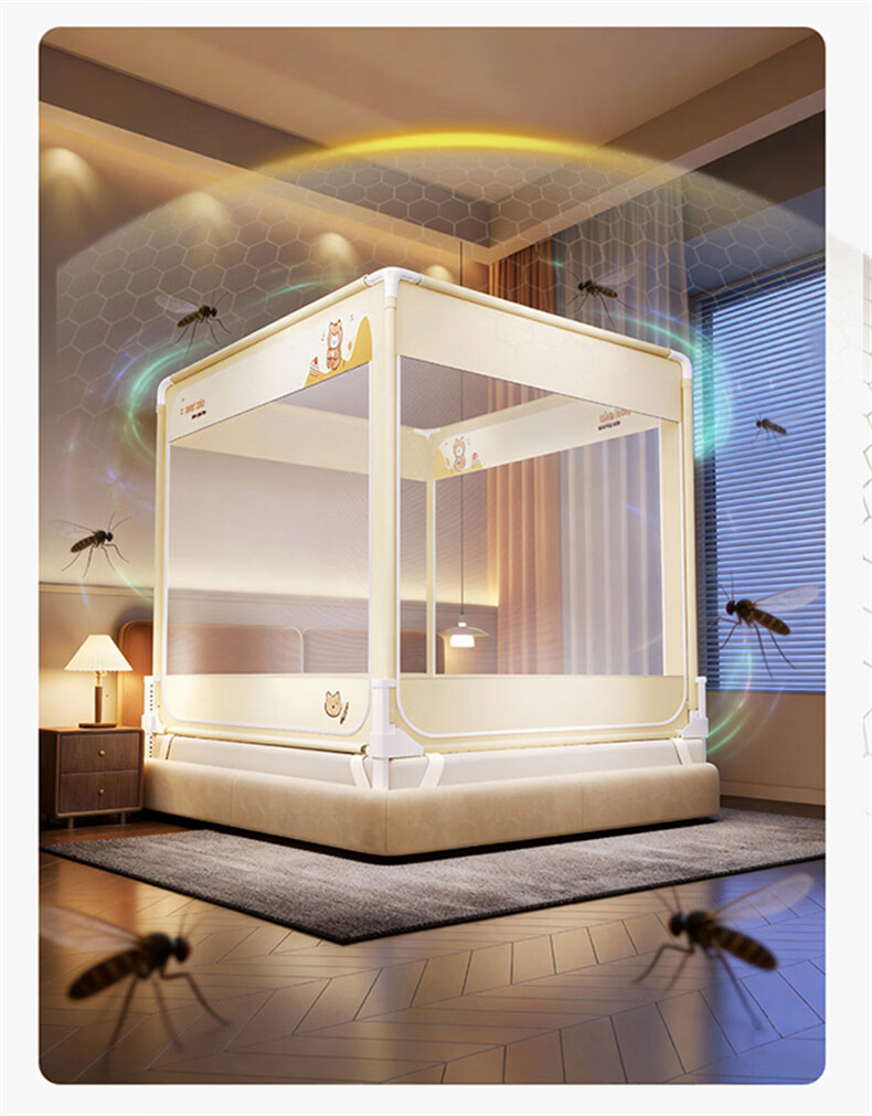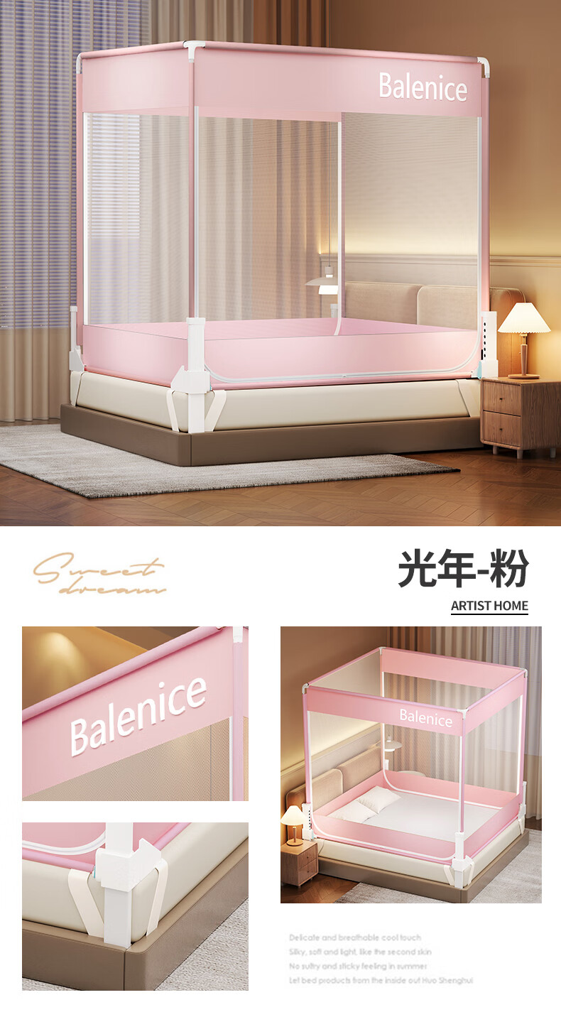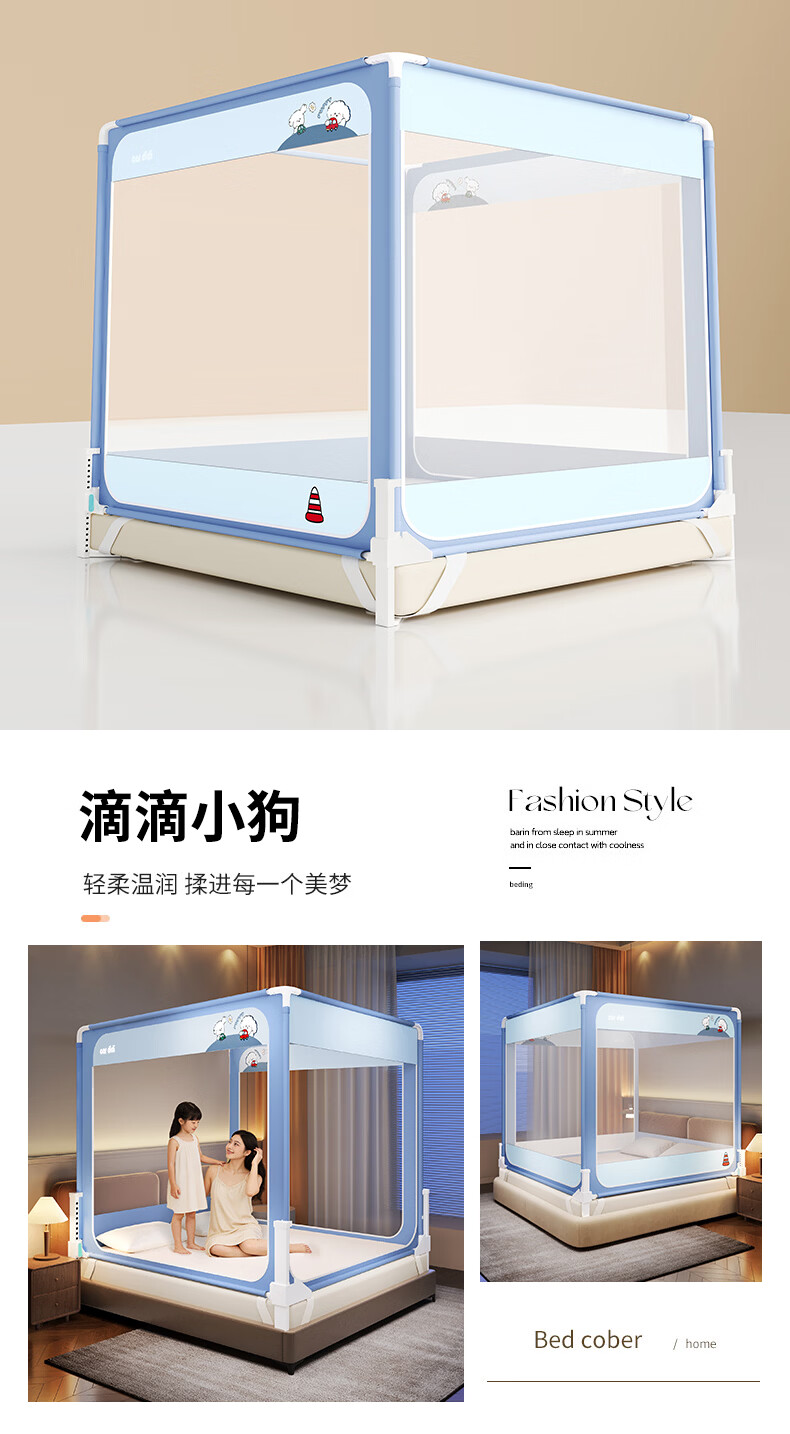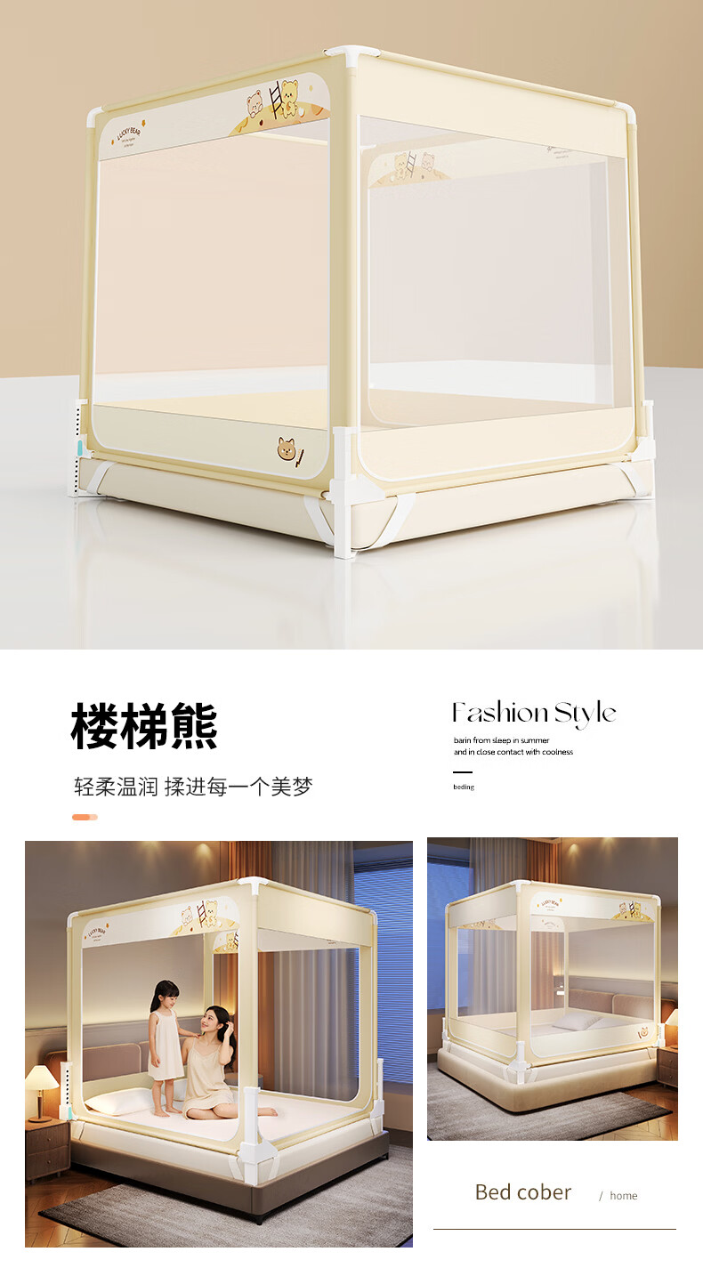 无印良品防摔蚊帐1.5米x2米家用卧室婴儿童防掉床可升降床围栏加固蚊帐架 蛋糕熊-全底【防摔防蚊+遮光顶】 180cm*200cm*170cm 【大力士压脚支架】