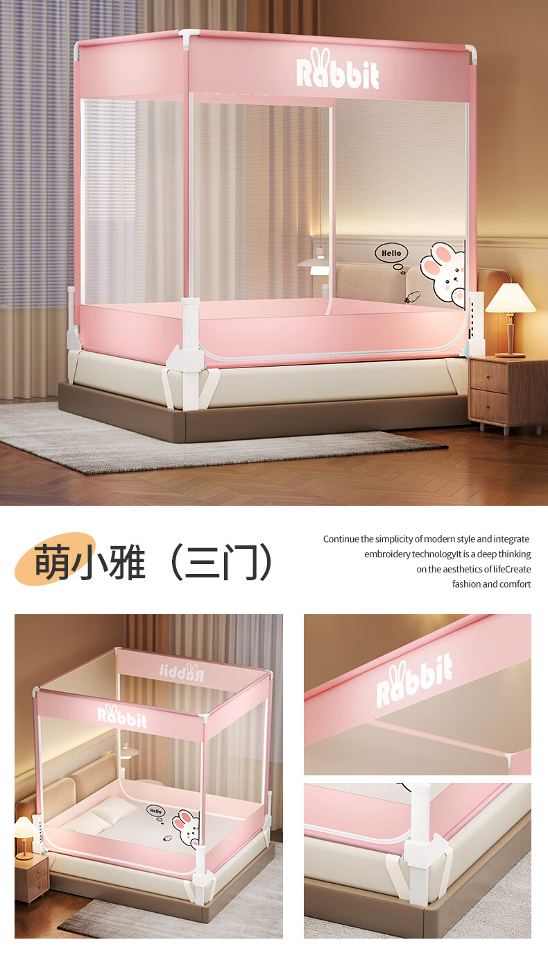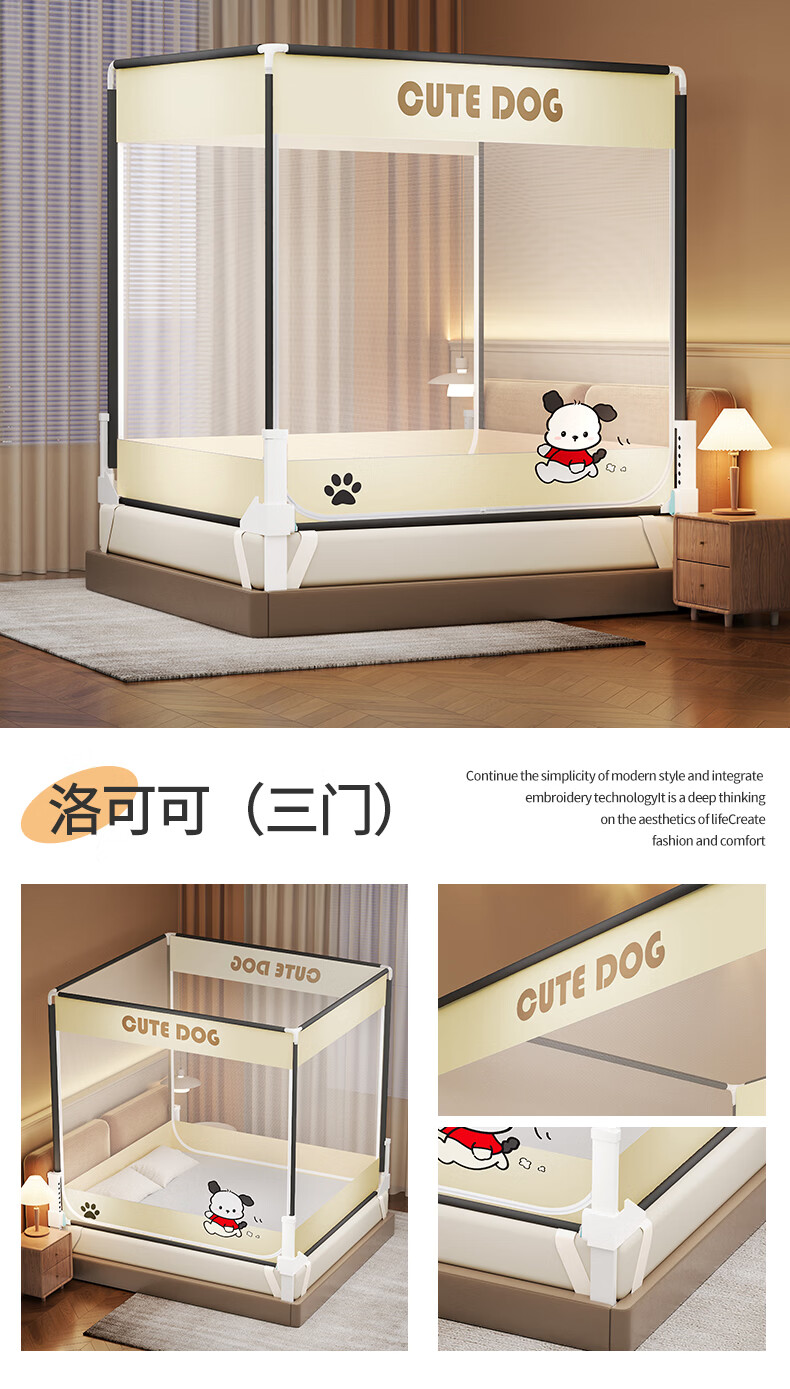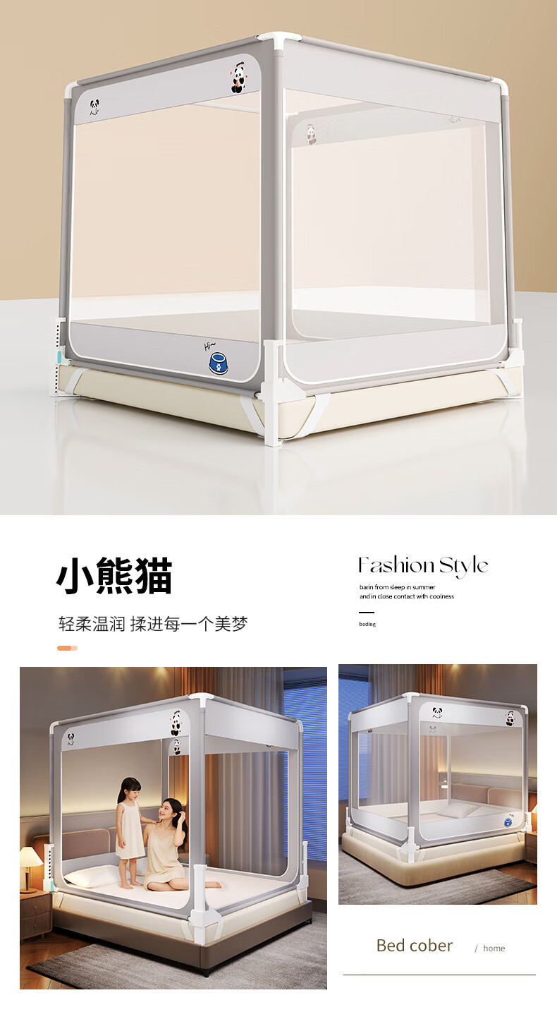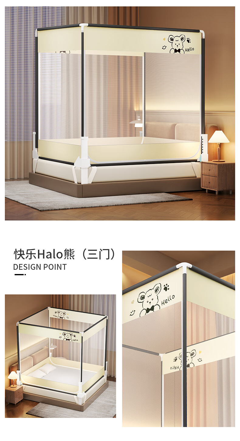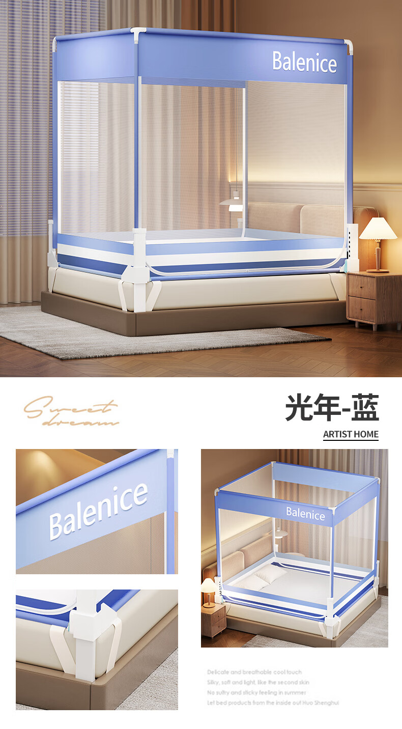 无印良品防摔蚊帐1.5米x2米家用卧室婴儿童防掉床可升降床围栏加固蚊帐架 蛋糕熊-全底【防摔防蚊+遮光顶】 180cm*200cm*170cm 【大力士压脚支架】