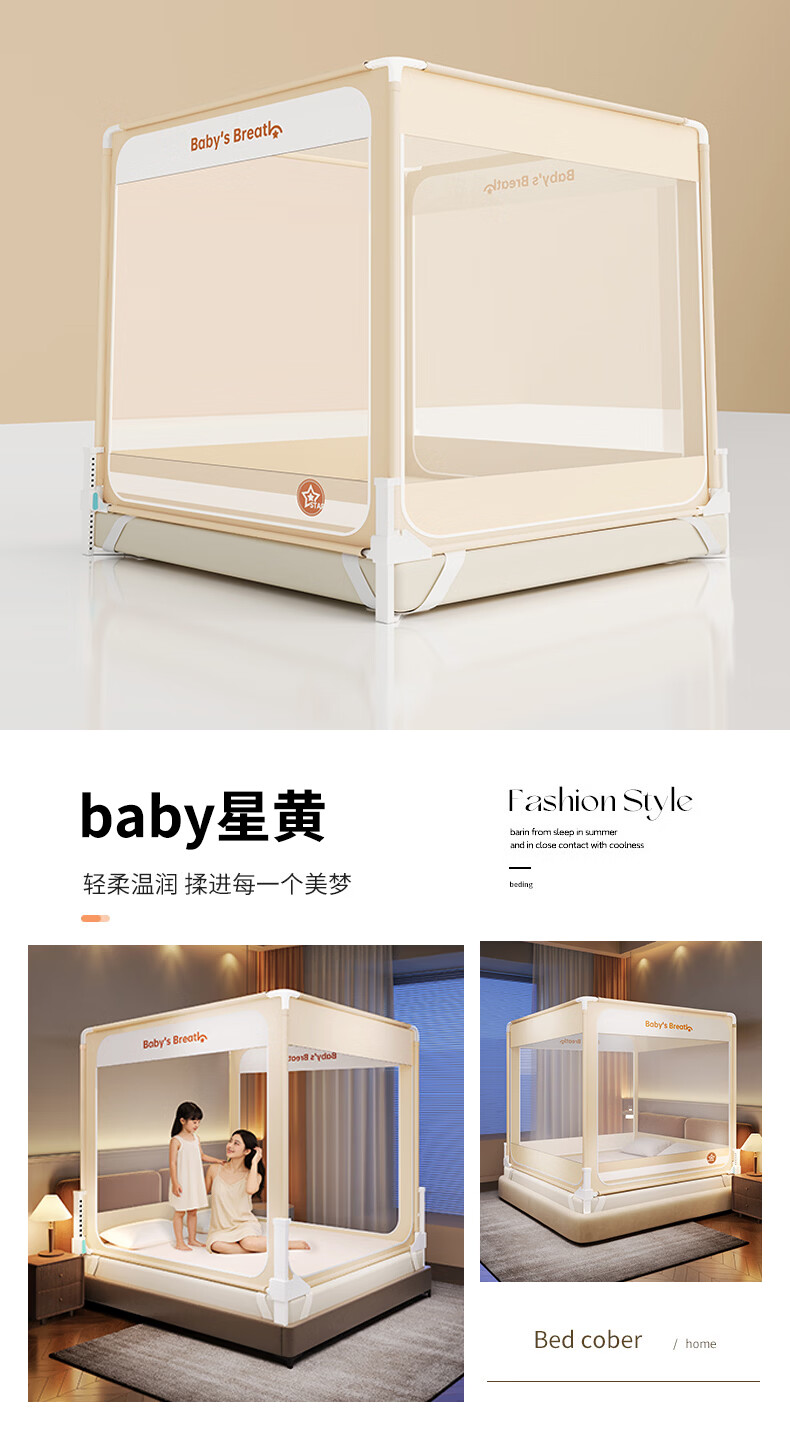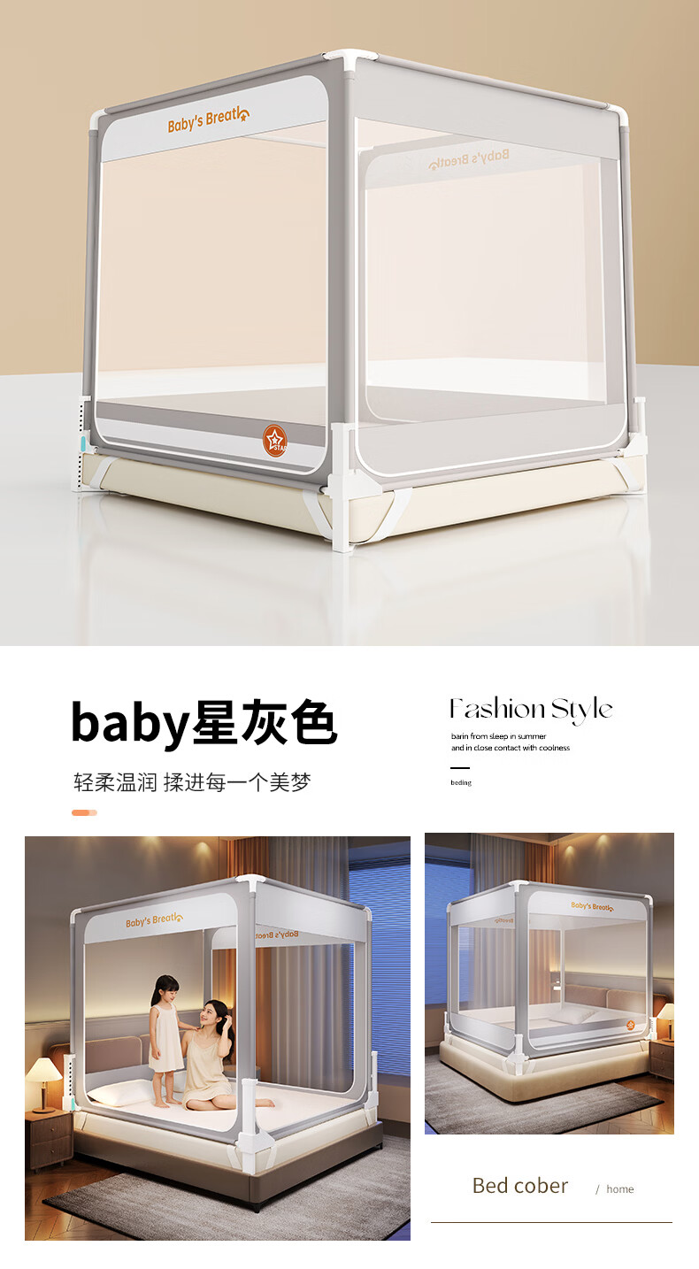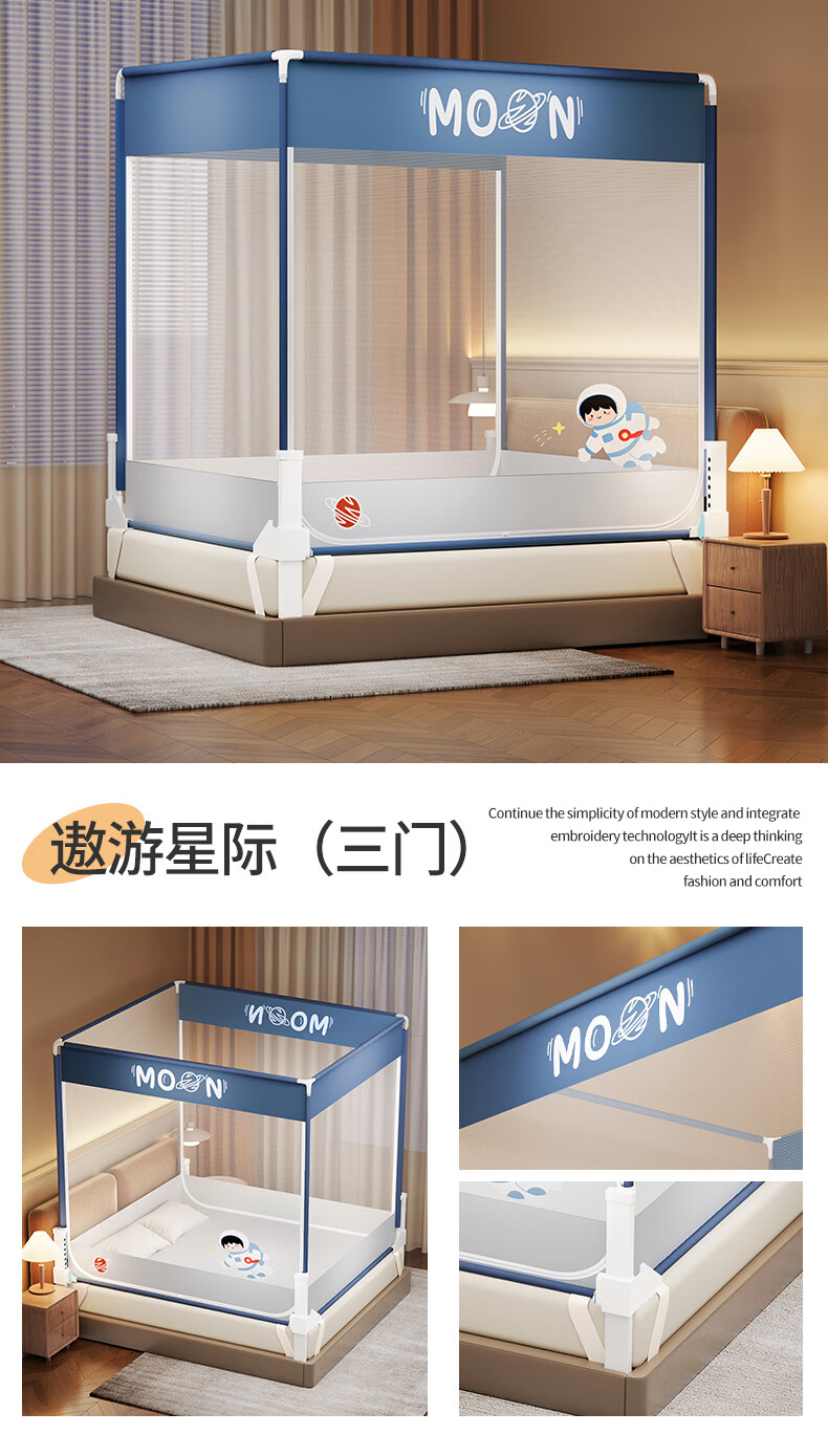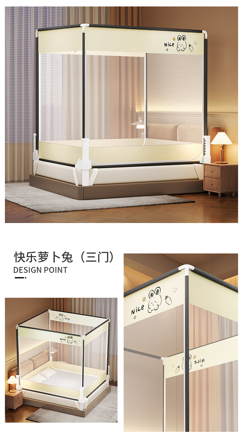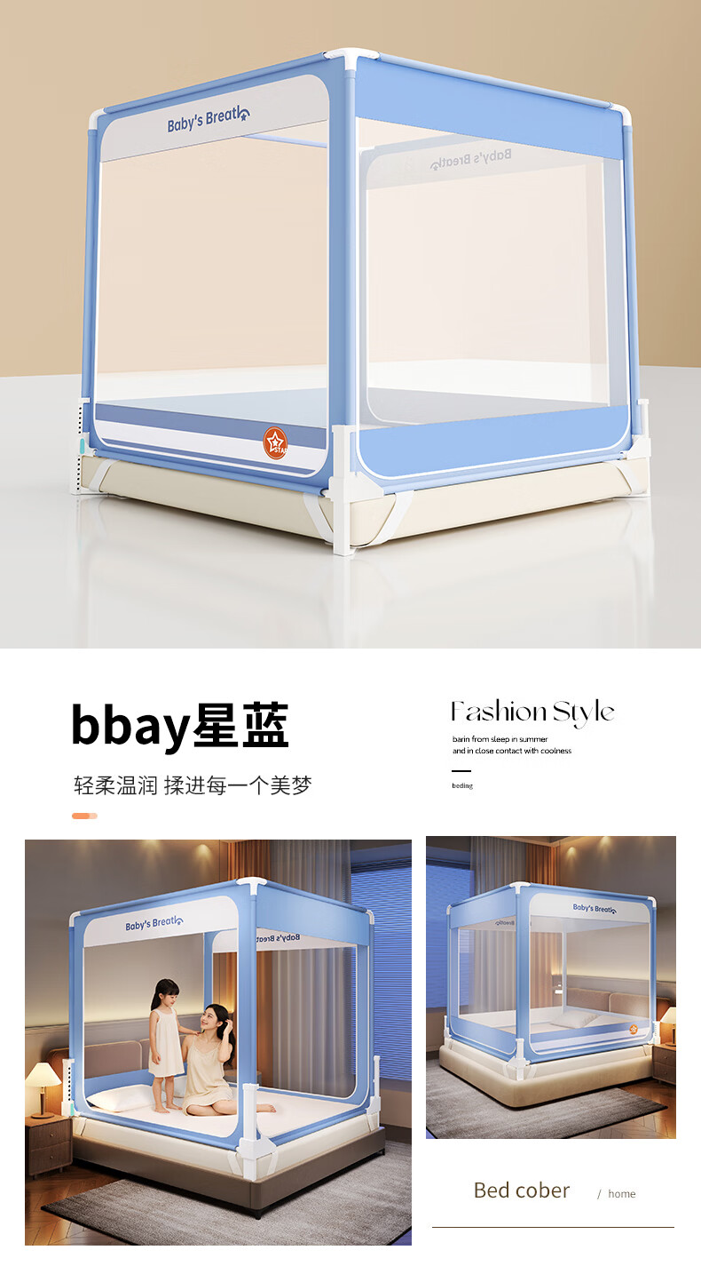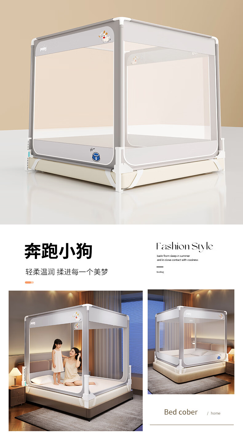 无印良品防摔蚊帐1.5米x2米家用卧室婴儿童防掉床可升降床围栏加固蚊帐架 蛋糕熊-全底【防摔防蚊+遮光顶】 180cm*200cm*170cm 【大力士压脚支架】