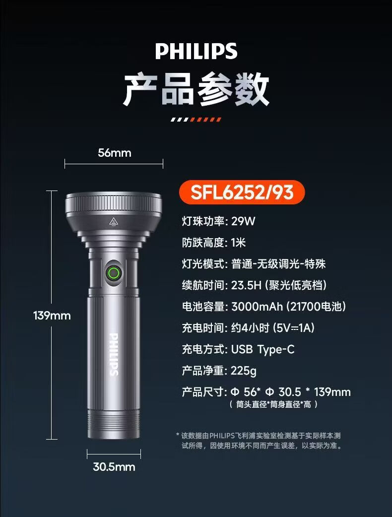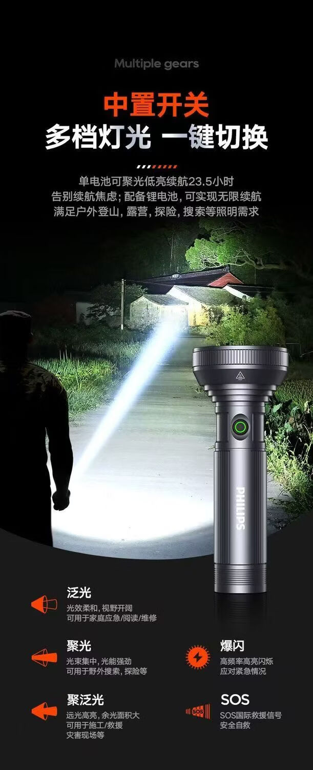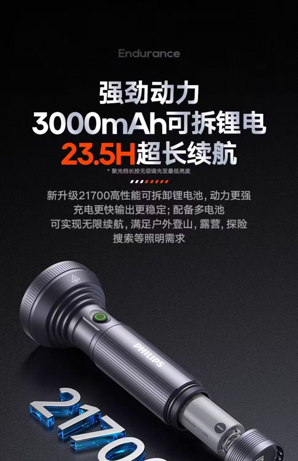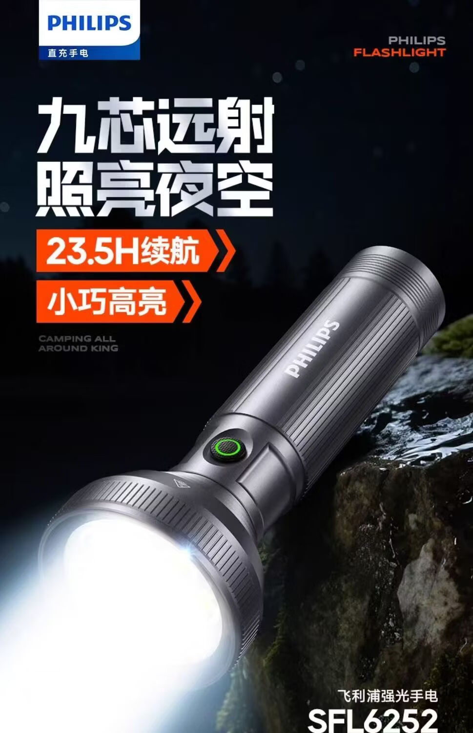 飞利浦(PHILIPS)手电筒强光可充电高亮多功能户外便携巡逻登山露营手电SFL6252 29W/3000毫安/变焦/SFL6252
