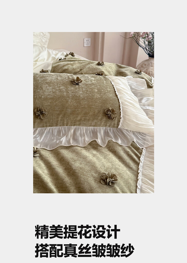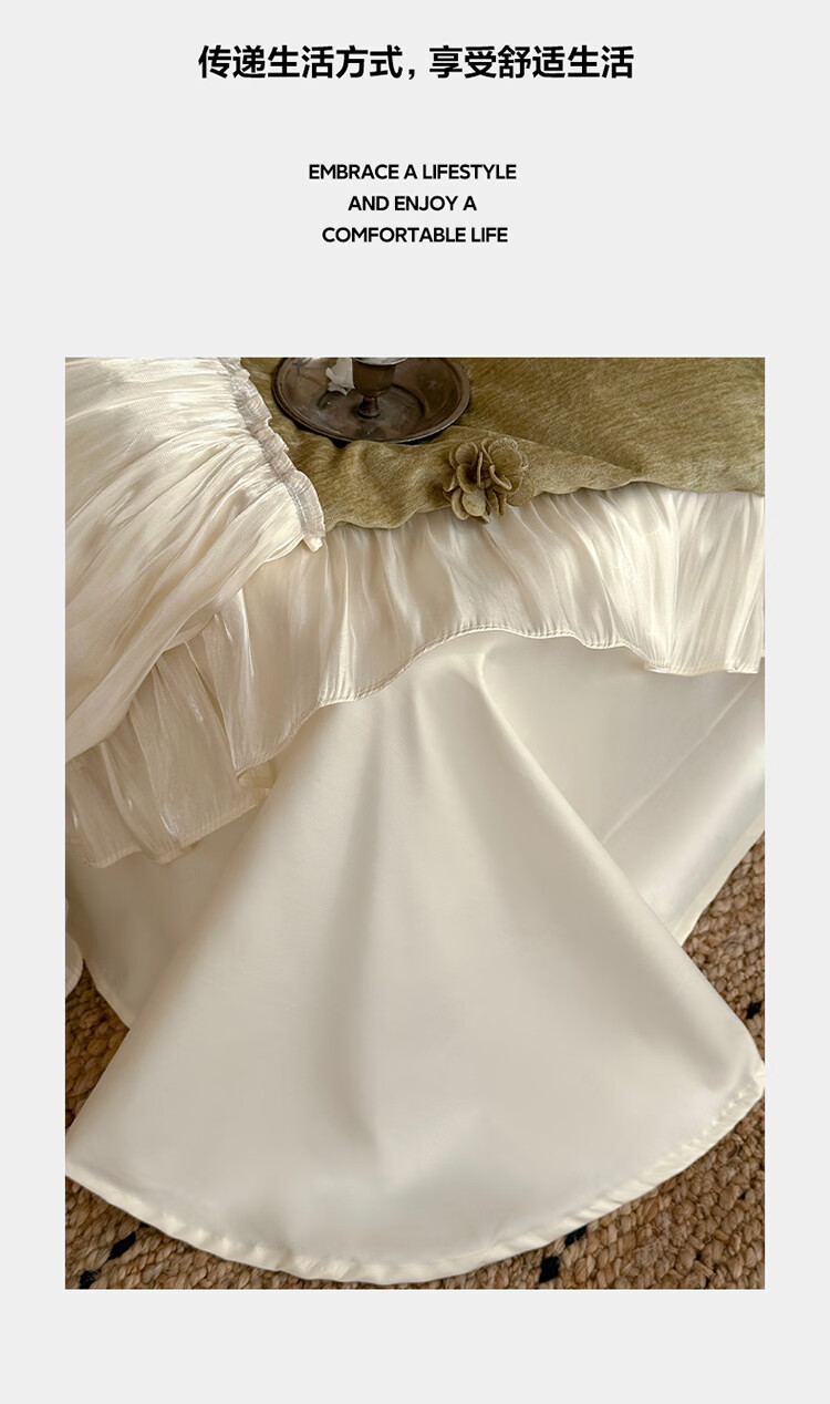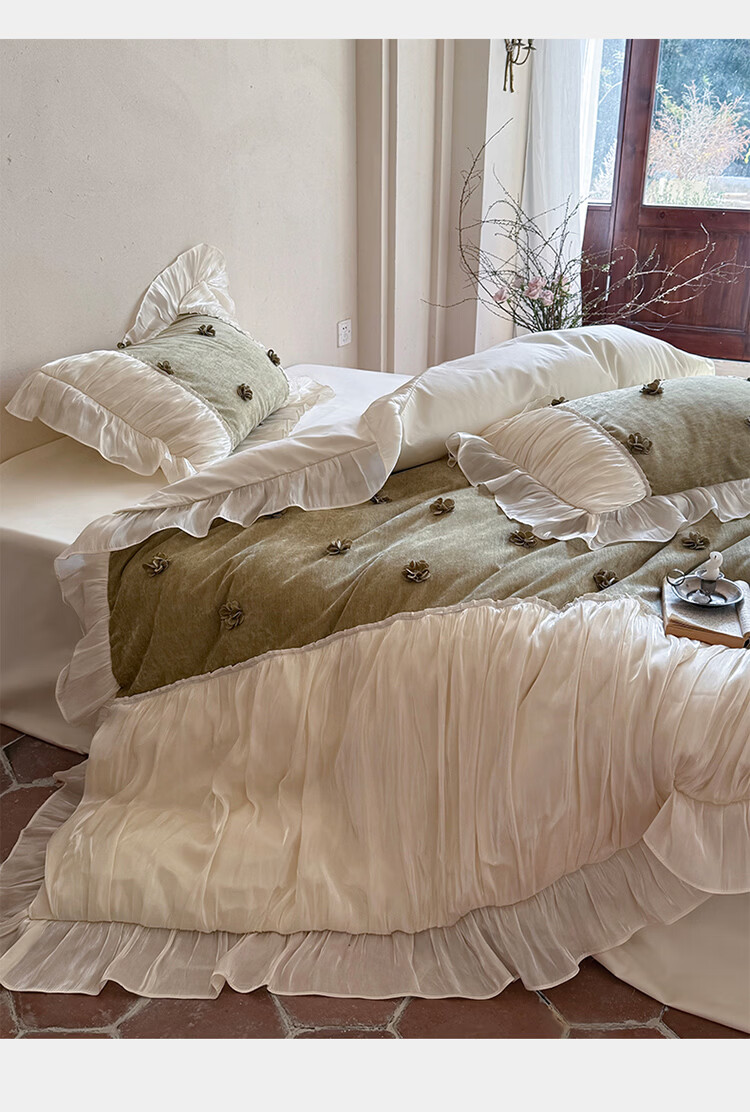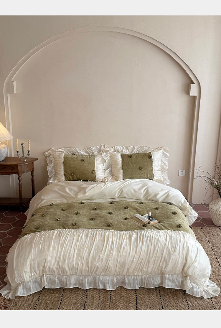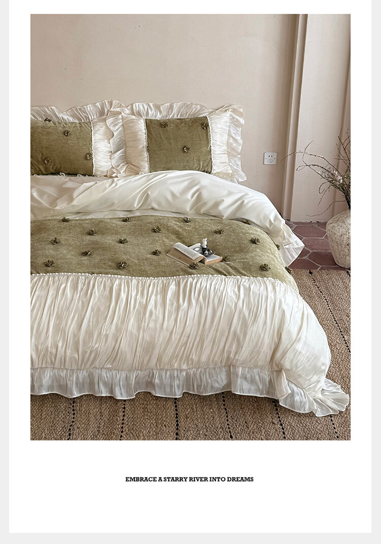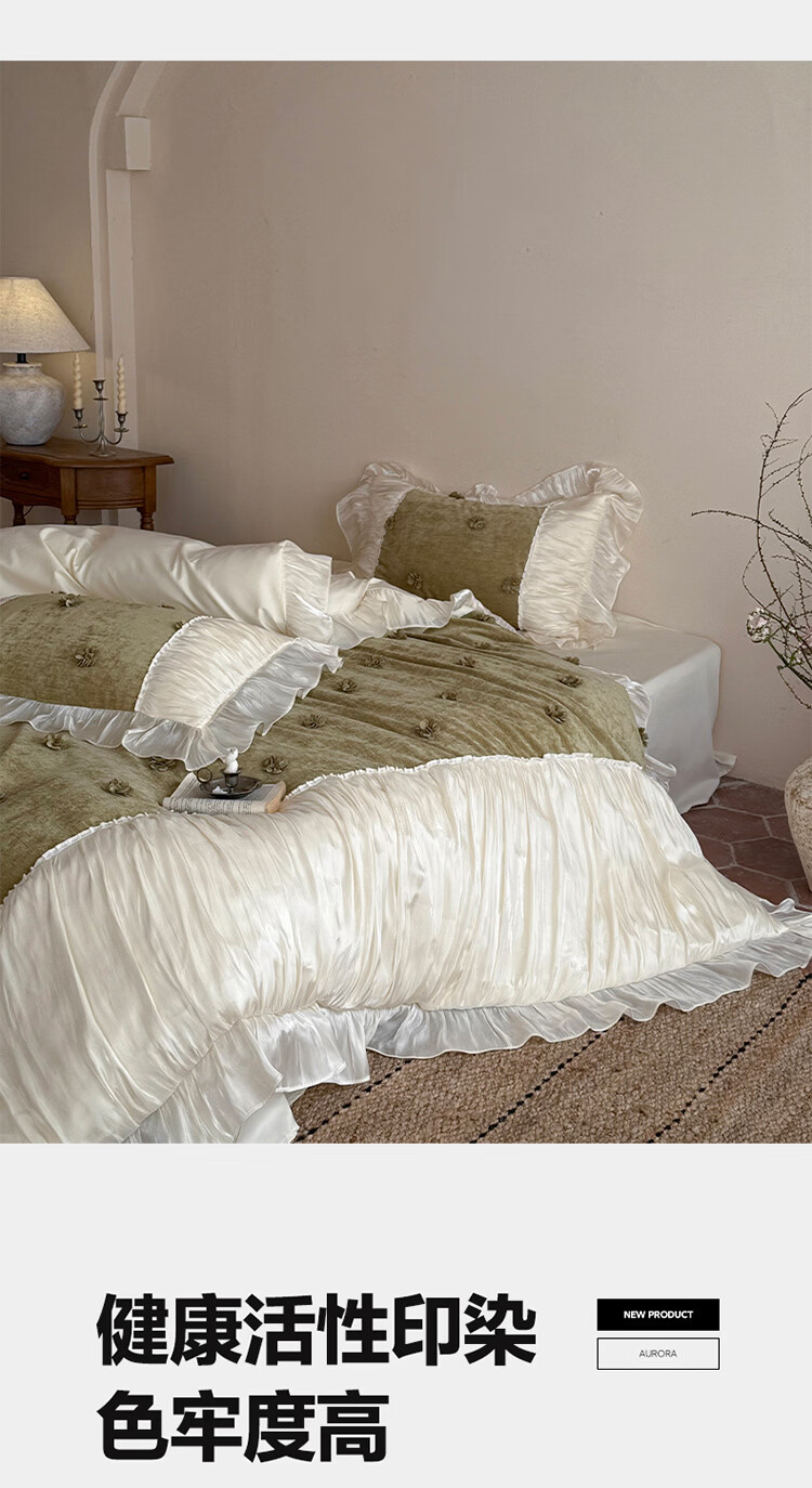 ROLAND LIVE法式公主风长绒棉四件套皱皱纱花边被套全棉女孩子透气床上用品 WL 长绒棉四件套-微光绿 1.5米床 床单款 【被套200*230cm】