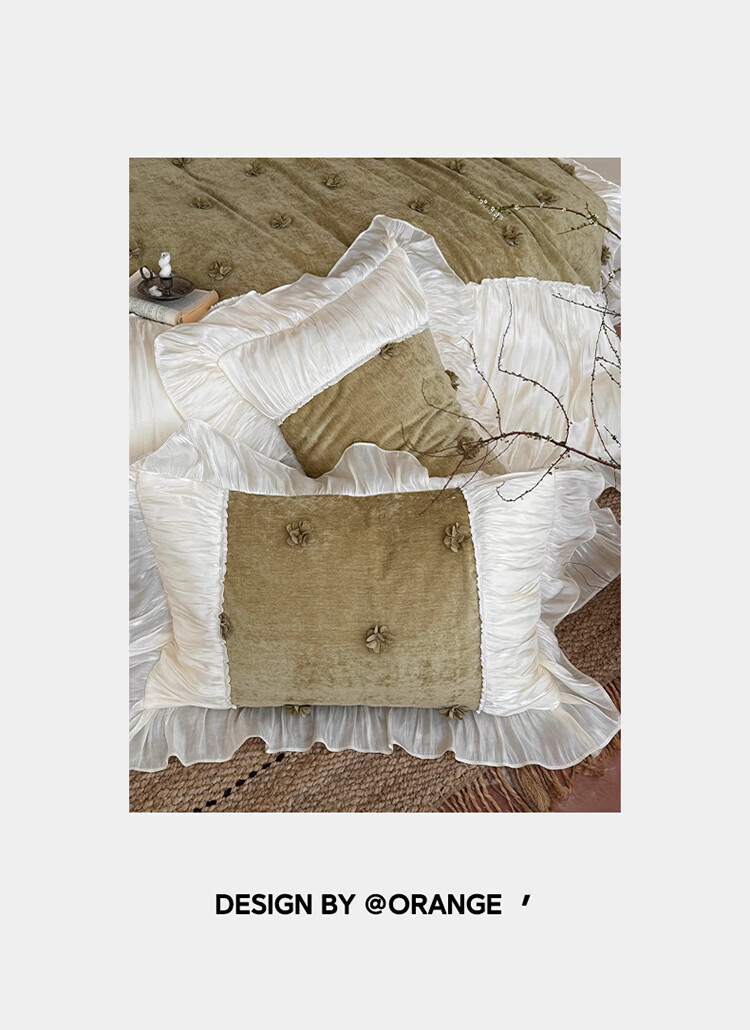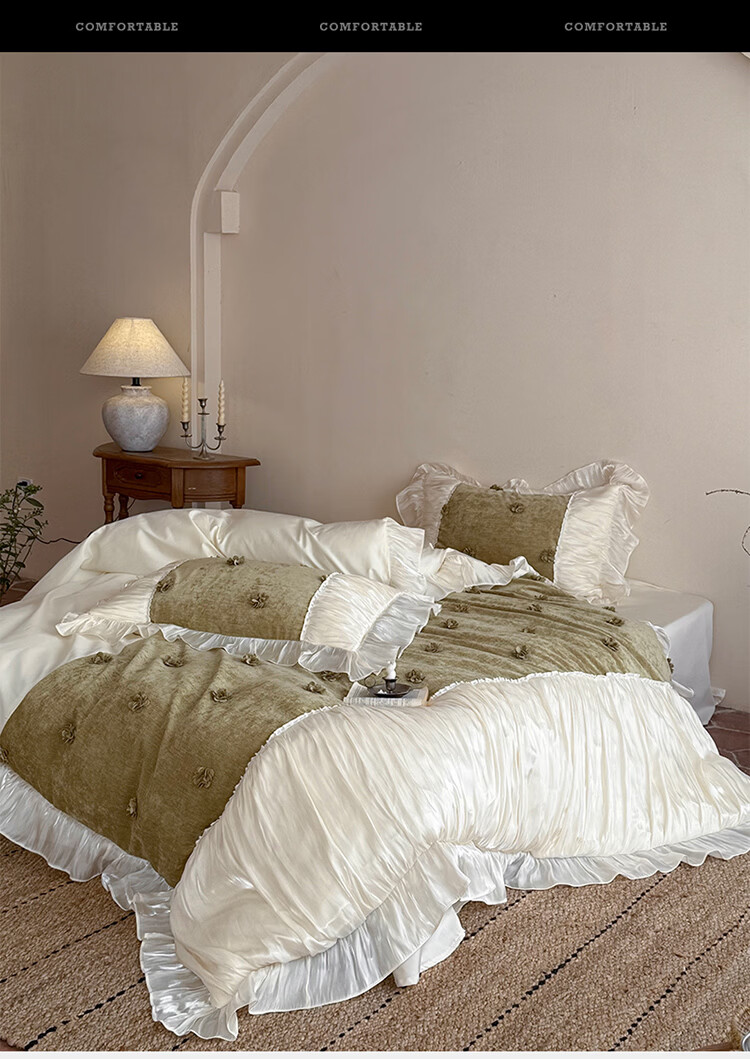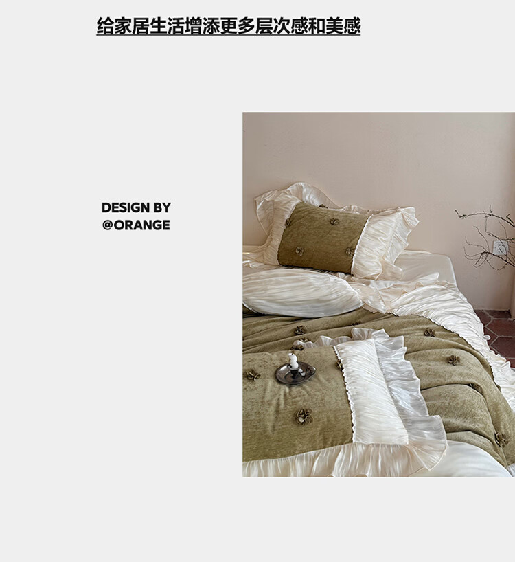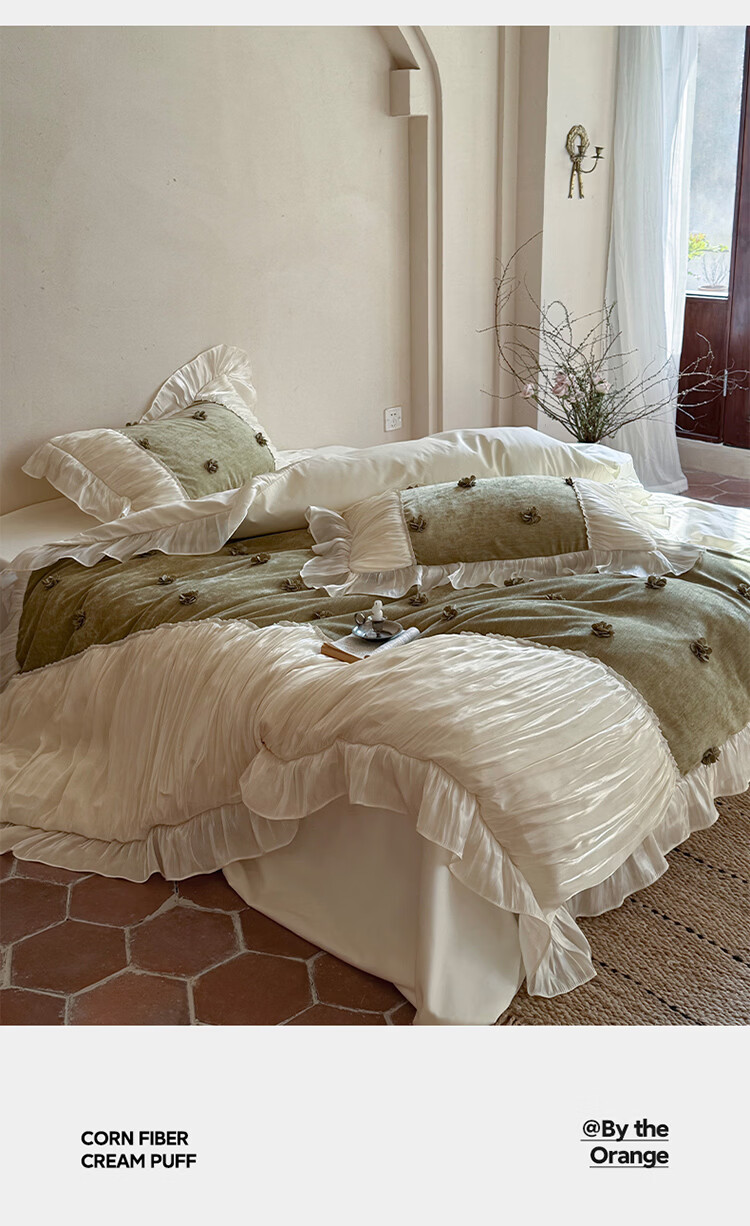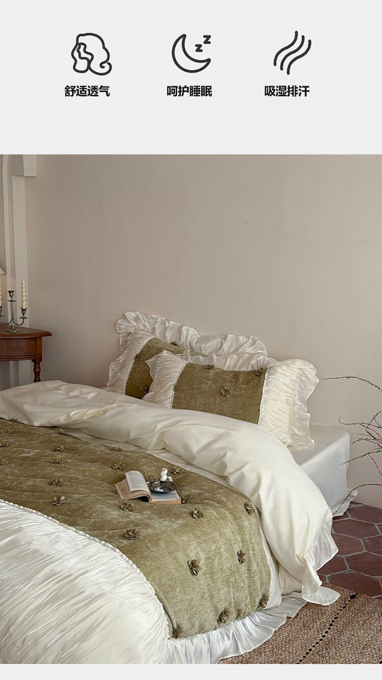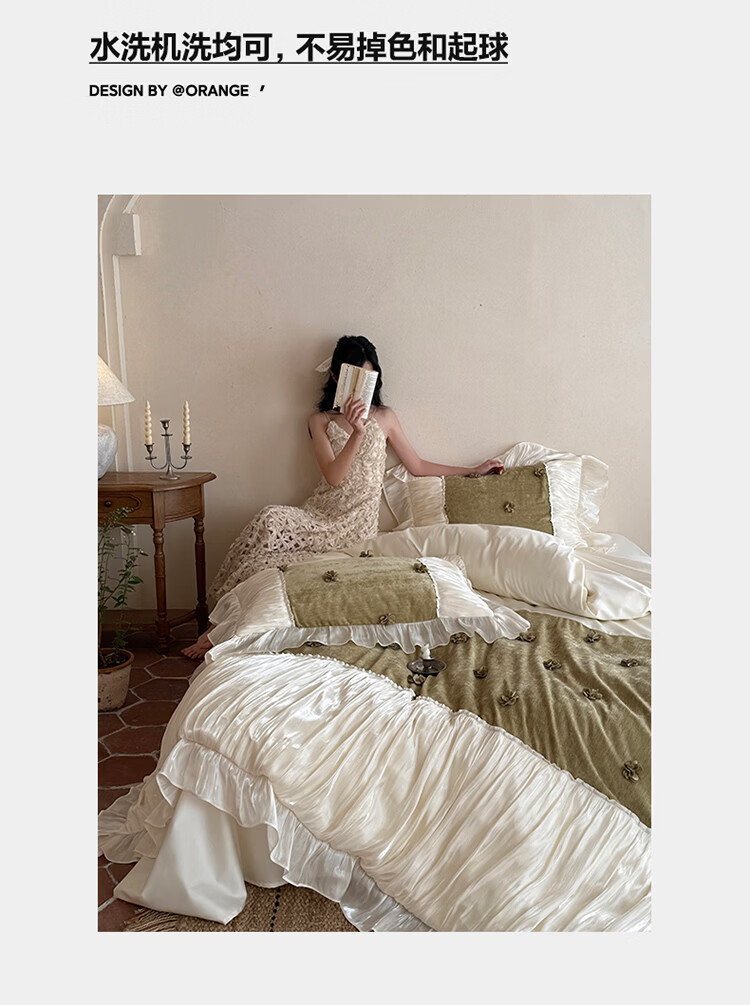 ROLAND LIVE法式公主风长绒棉四件套皱皱纱花边被套全棉女孩子透气床上用品 WL 长绒棉四件套-微光绿 1.5米床 床单款 【被套200*230cm】